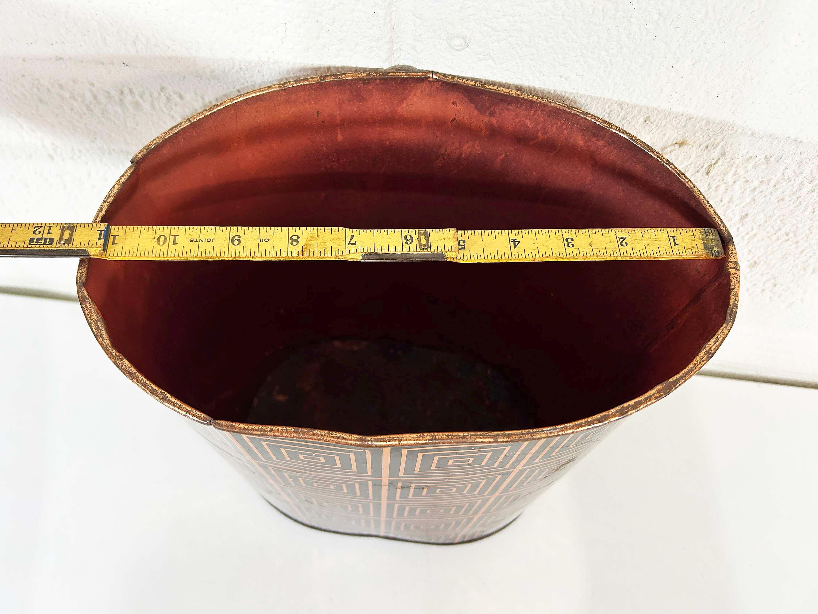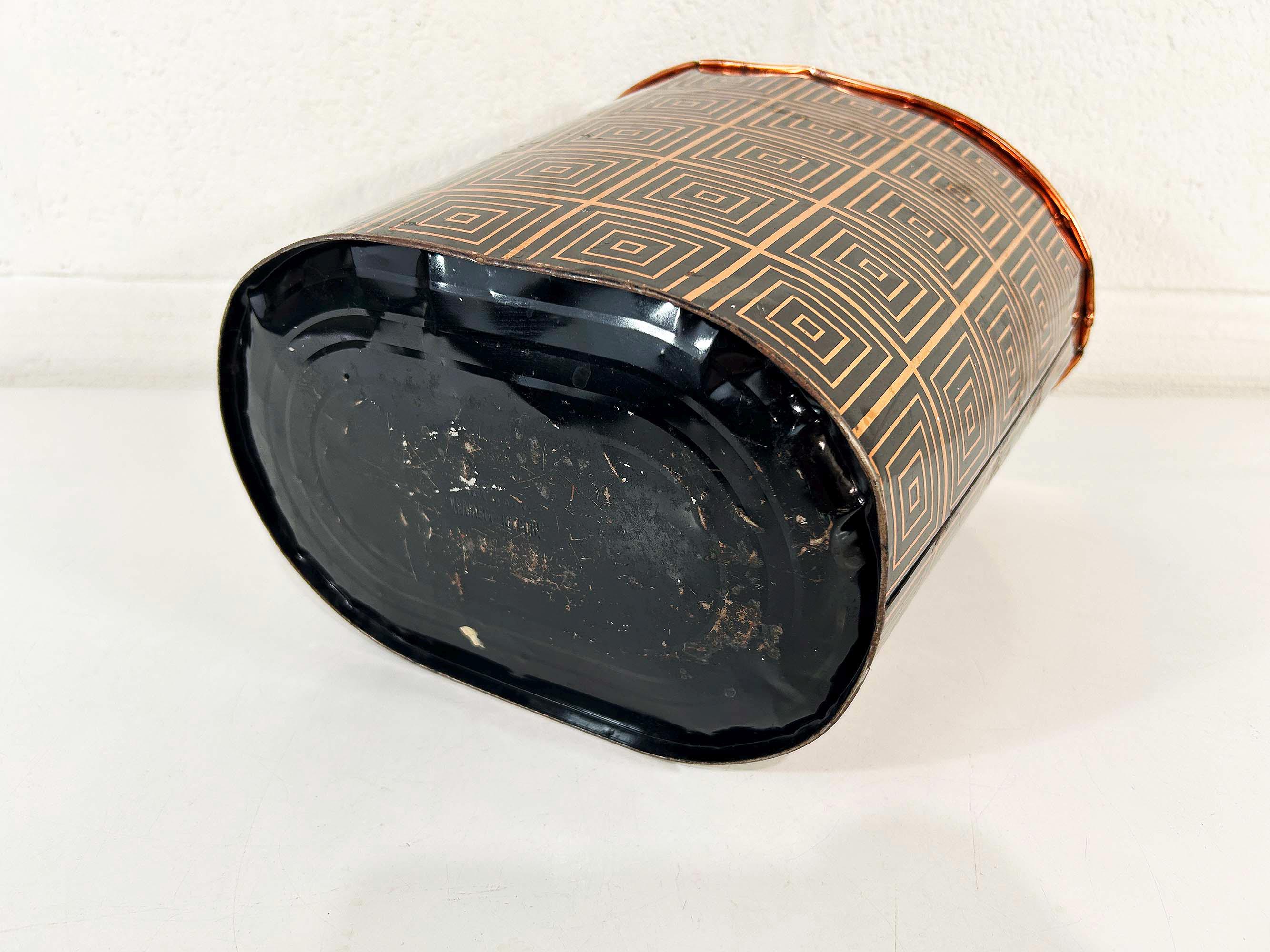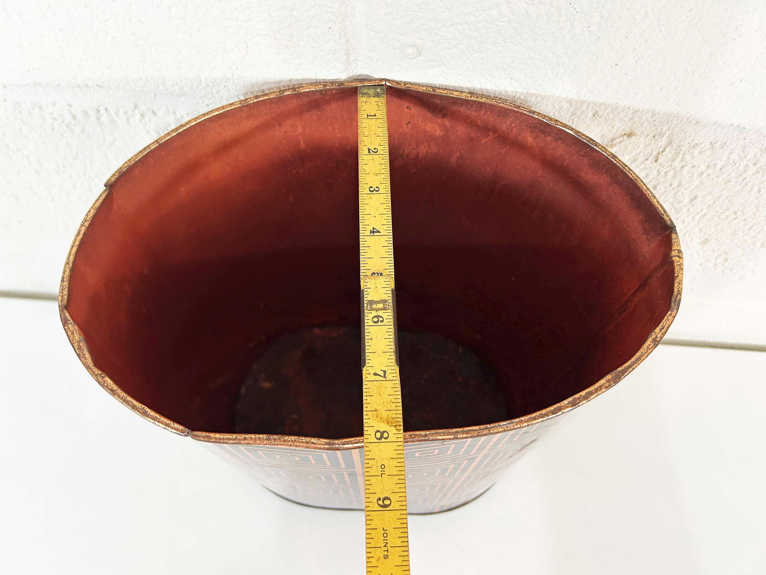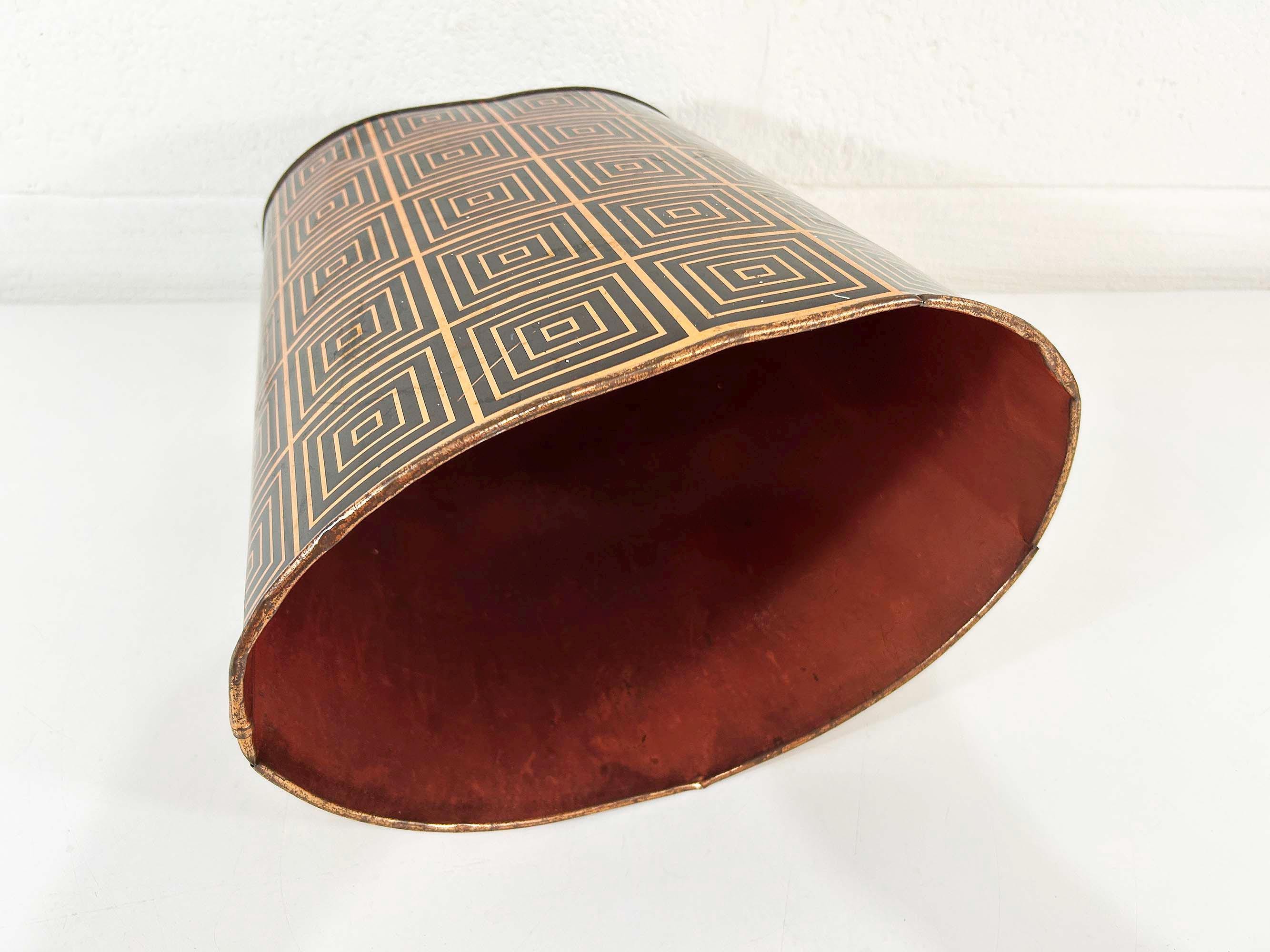 Super cute black and copper geometric metal trash can. Great for a bathroom, office, or kid's room! In fair vintage condition with some scuffs, scratches, and rust mostly on the bottom of the inside. There are a few spots where the rim of the trash can has split - please be sure to inspect all photos closely. The trash can is approximately 11 1/2 inches tall, 11 inches wide, and 8 inches deep.
