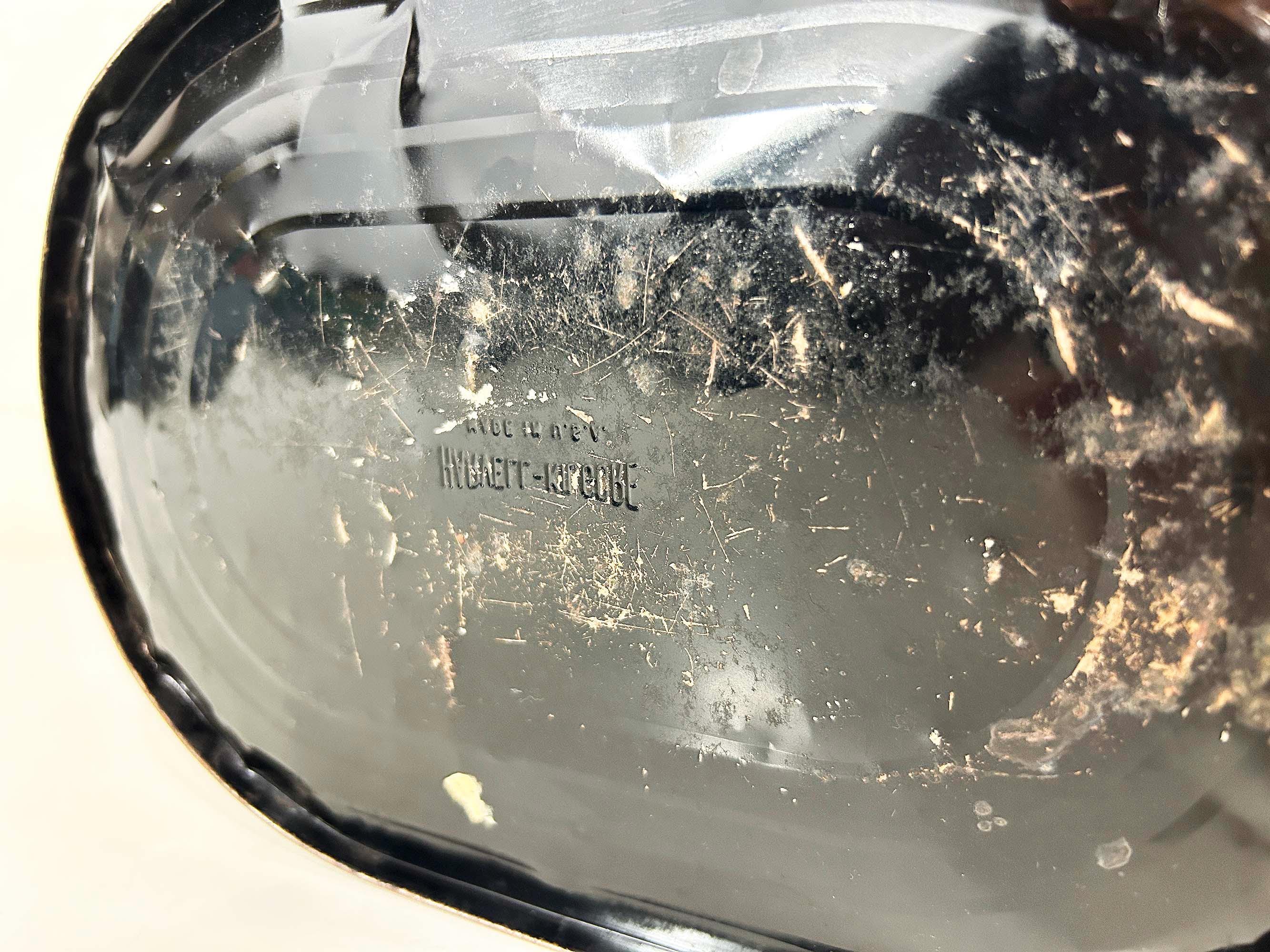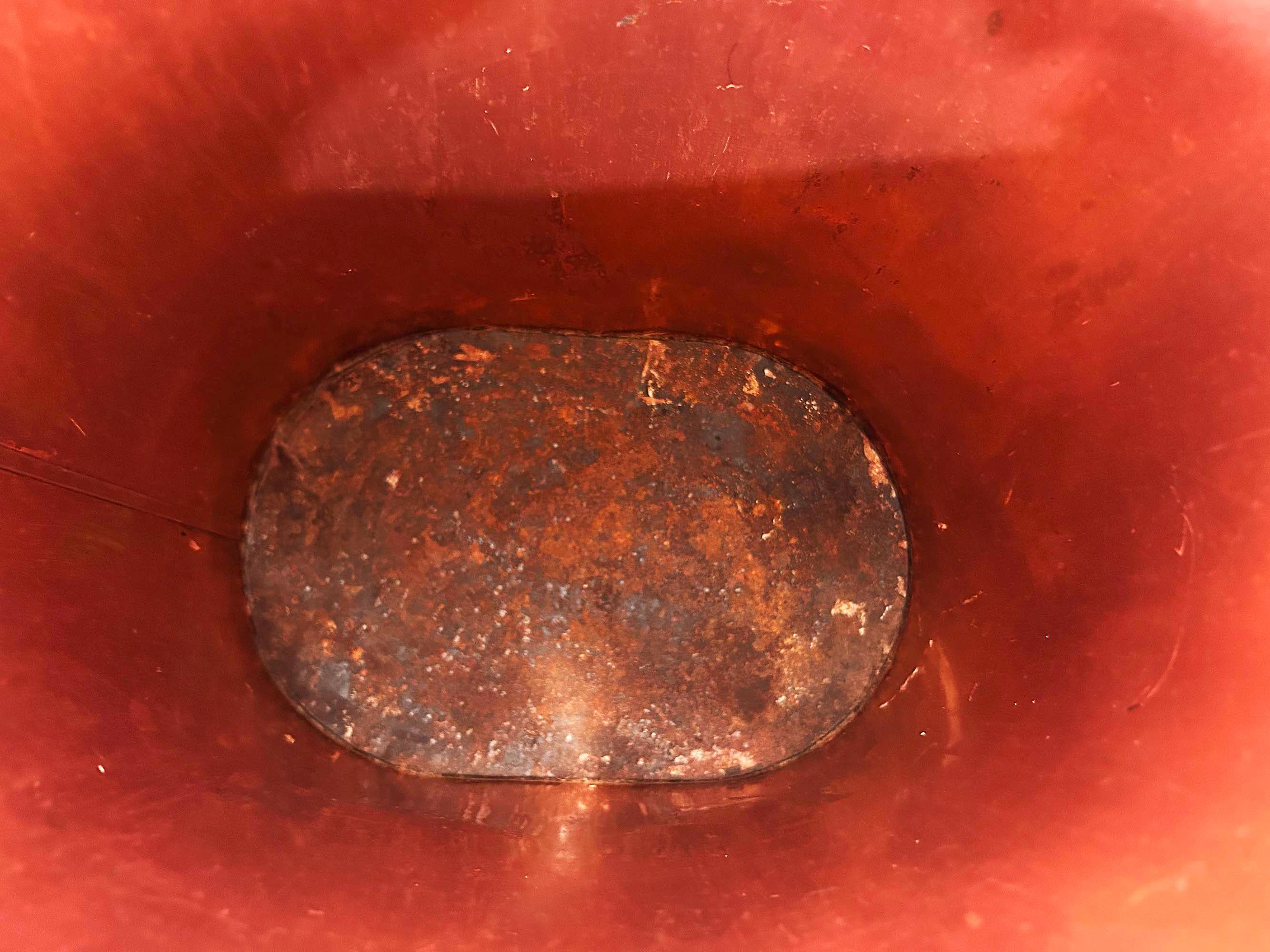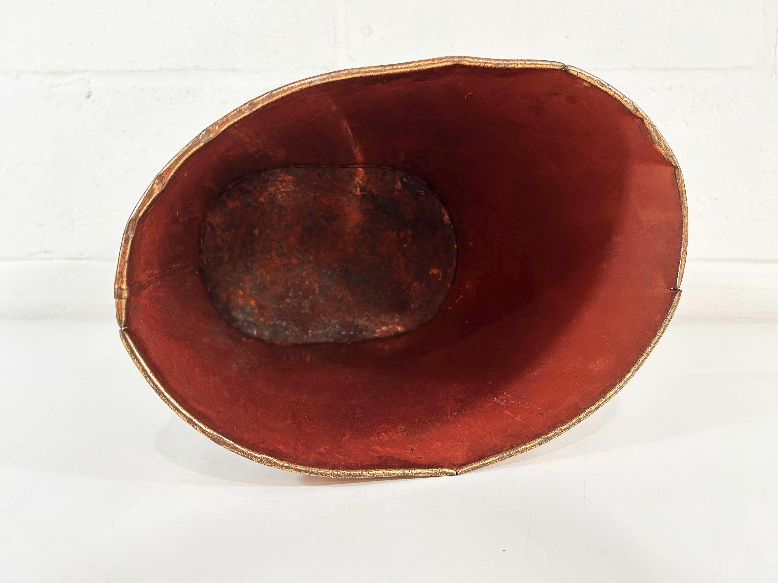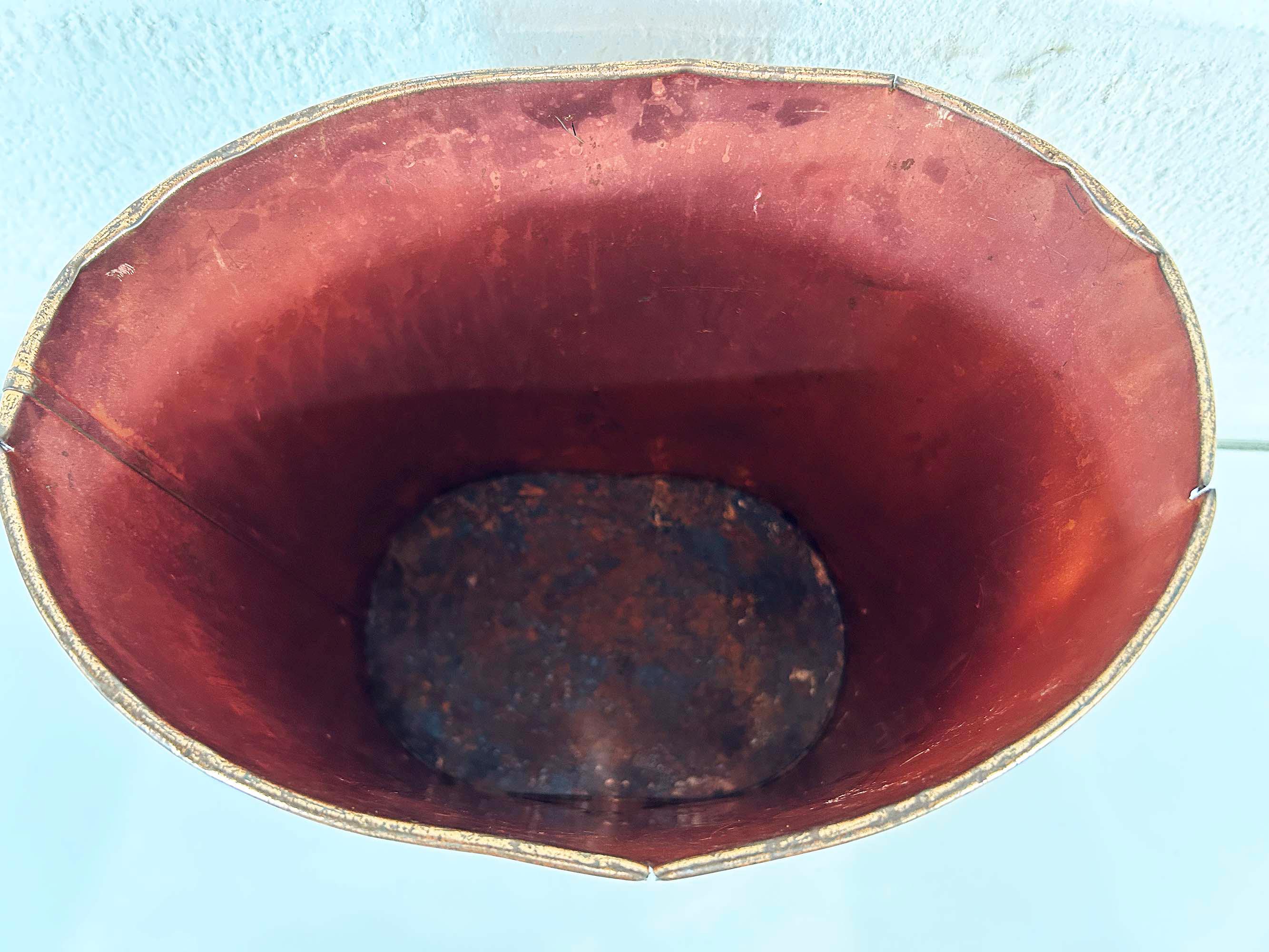 Super cute black and copper geometric metal trash can. Great for a bathroom, office, or kid's room! In fair vintage condition with some scuffs, scratches, and rust mostly on the bottom of the inside. There are a few spots where the rim of the trash can has split - please be sure to inspect all photos closely. The trash can is approximately 11 1/2 inches tall, 11 inches wide, and 8 inches deep.