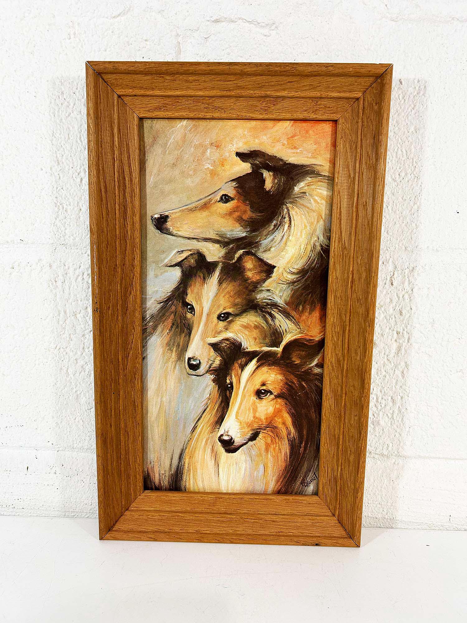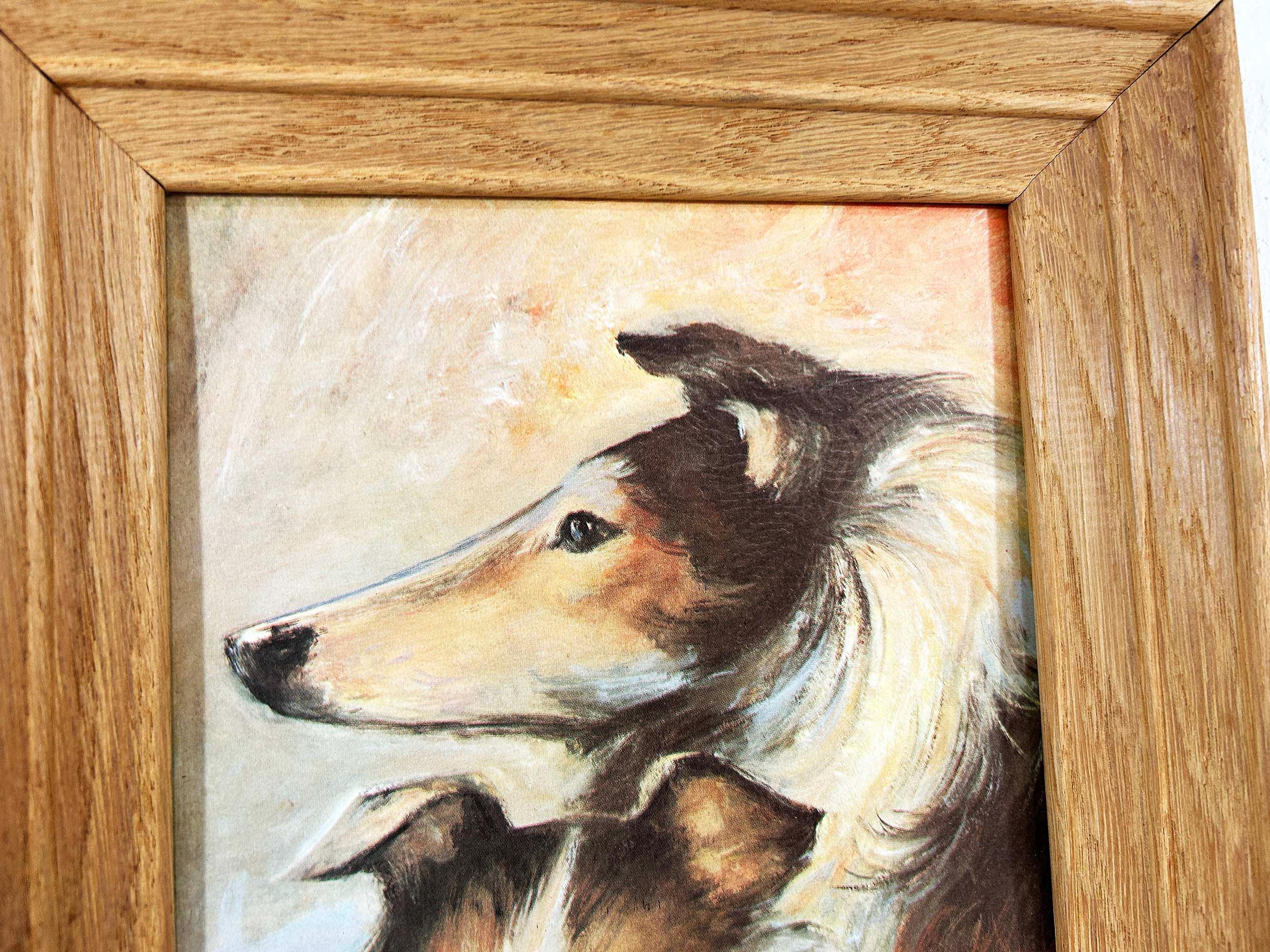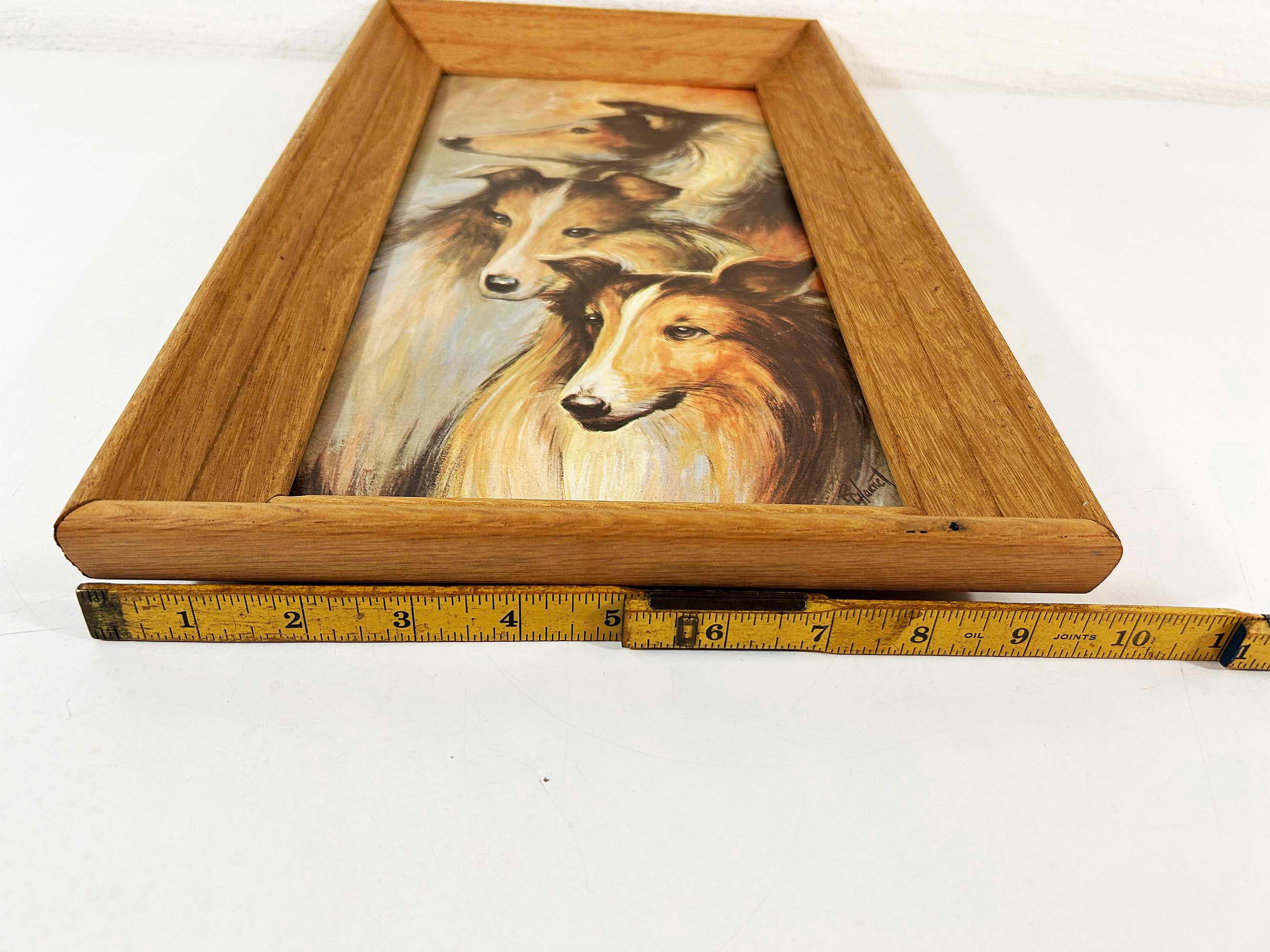 Fun retro framed Border Collie print! The frame is approximately 16 1/2 inches tall and 9 1/2 inches wide. The print and the frame are in great vintage shape. Perfect for a kids room or to fill a space on a gallery wall!