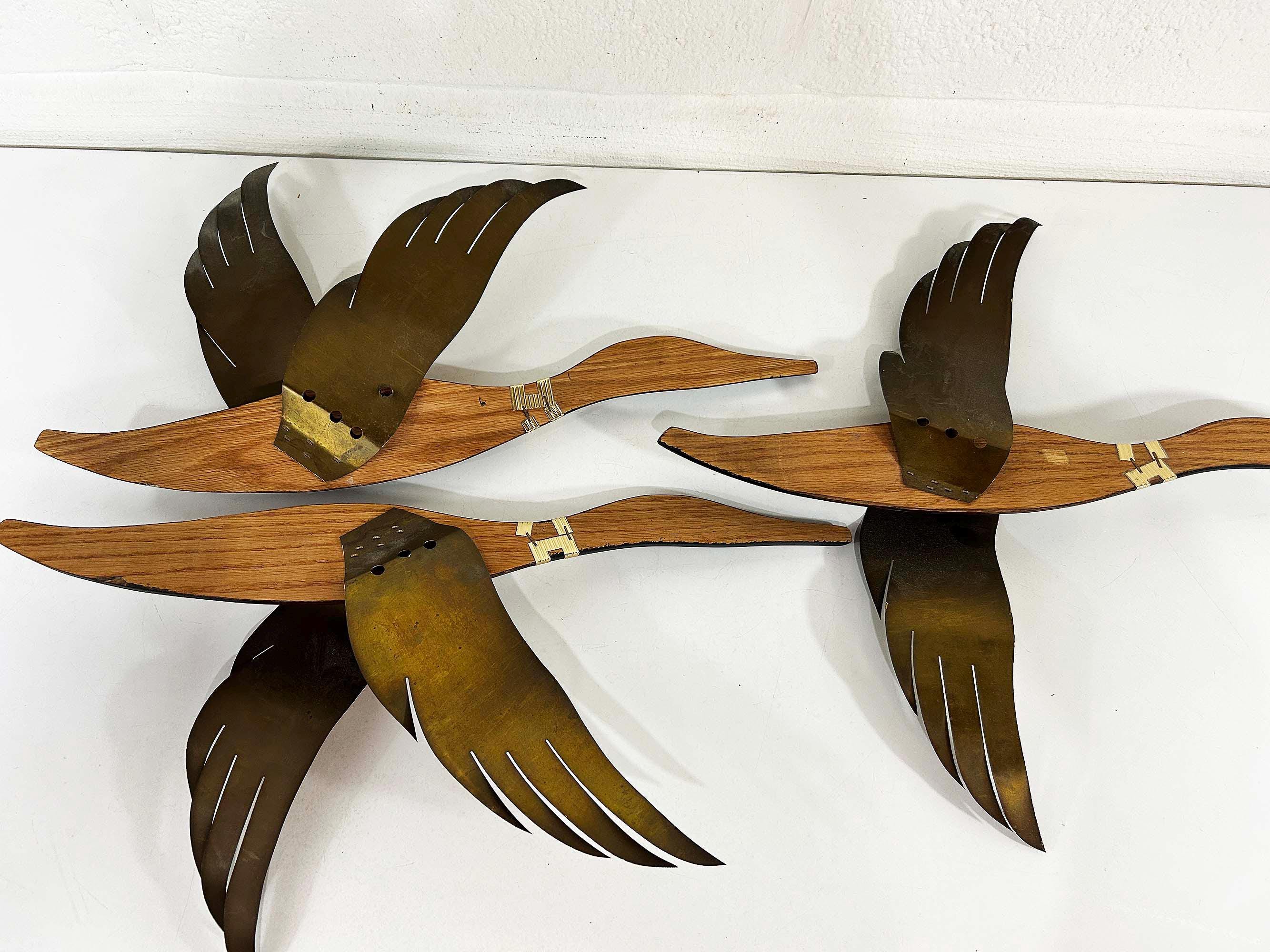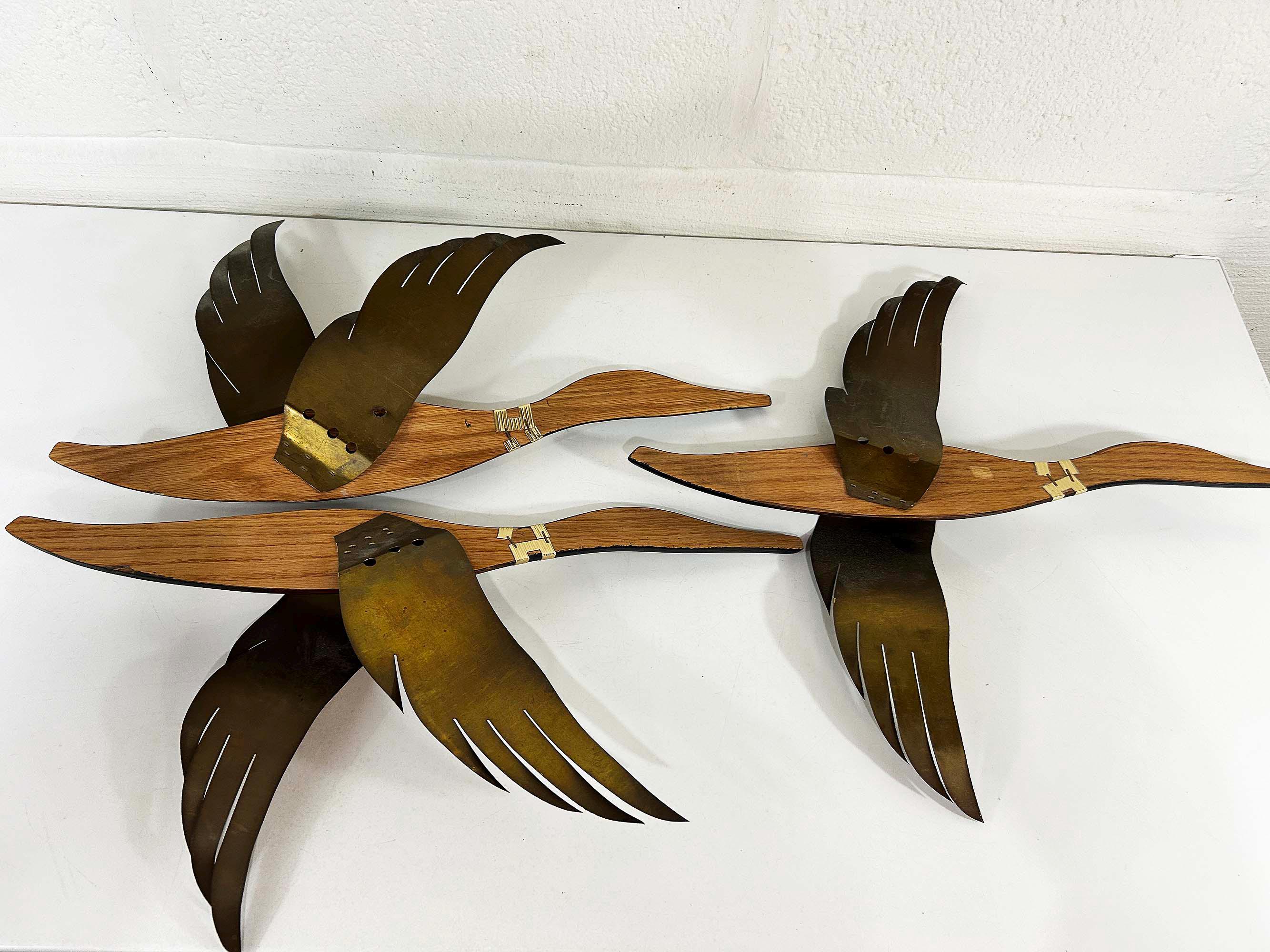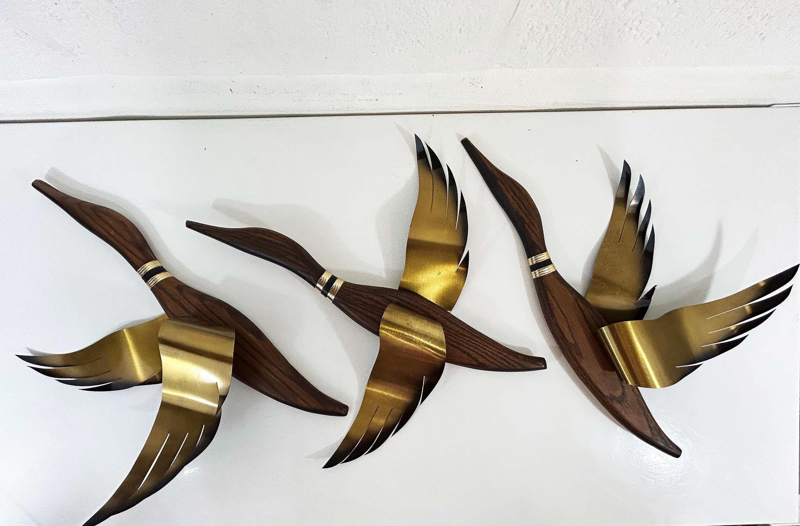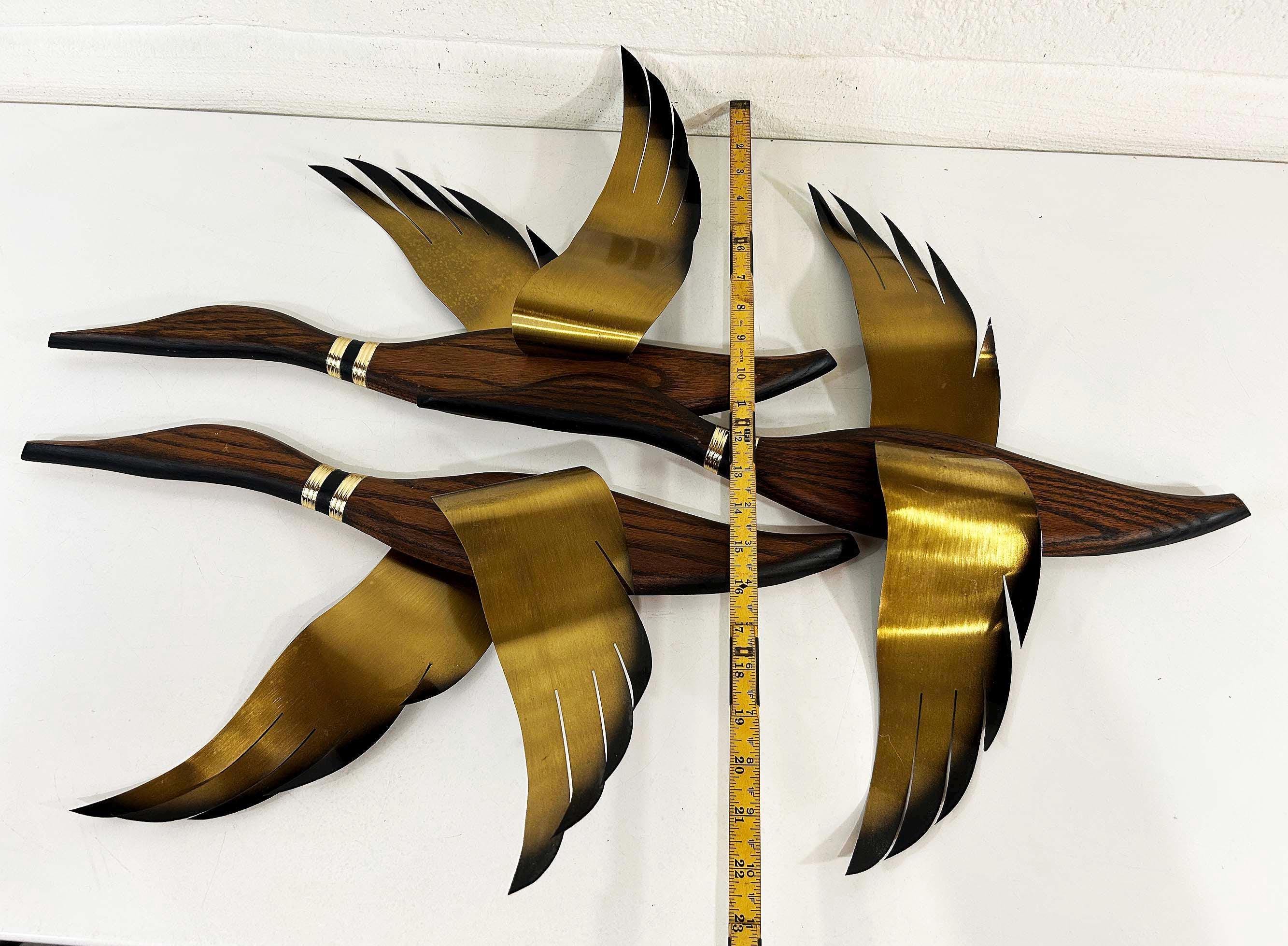 Very mid-century teak and metal 3D flying geese set of 3. All are in great vintage condition with no significant flaws. They are all approximately 22 inches long and they range in height from 11 to 19 inches depending on their wingspan.