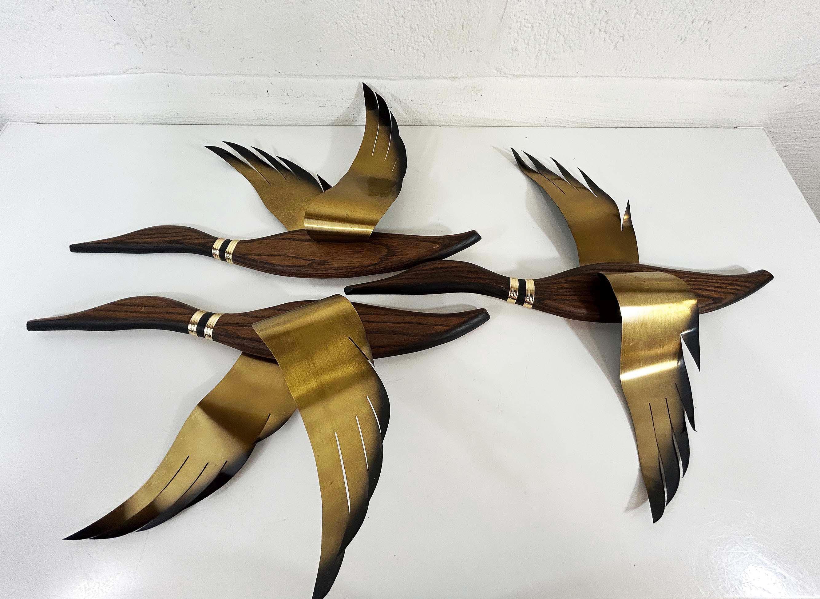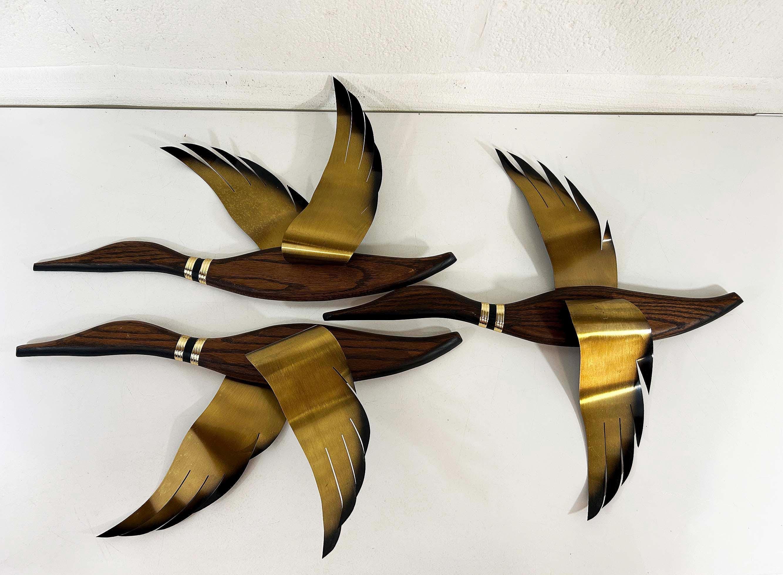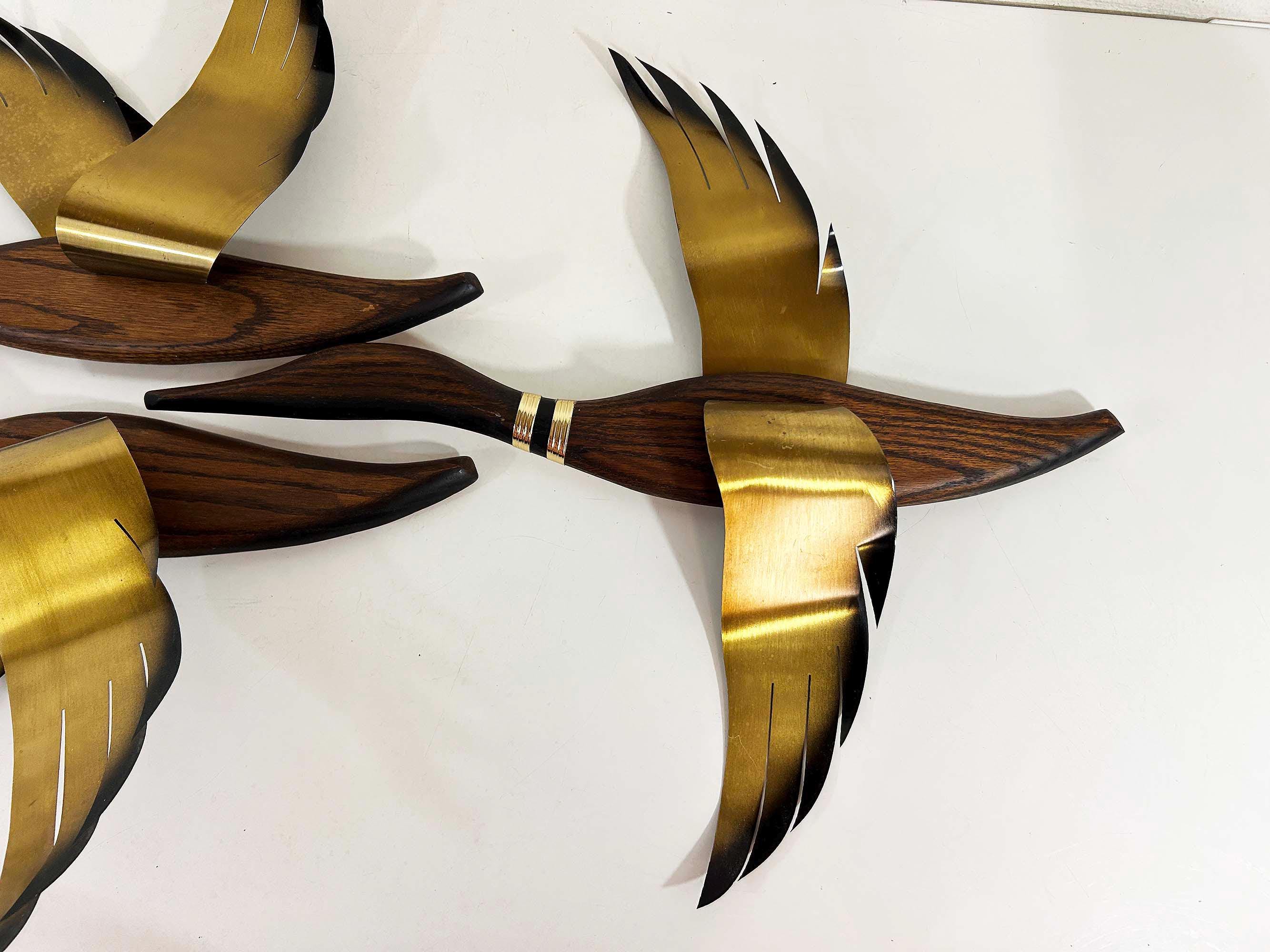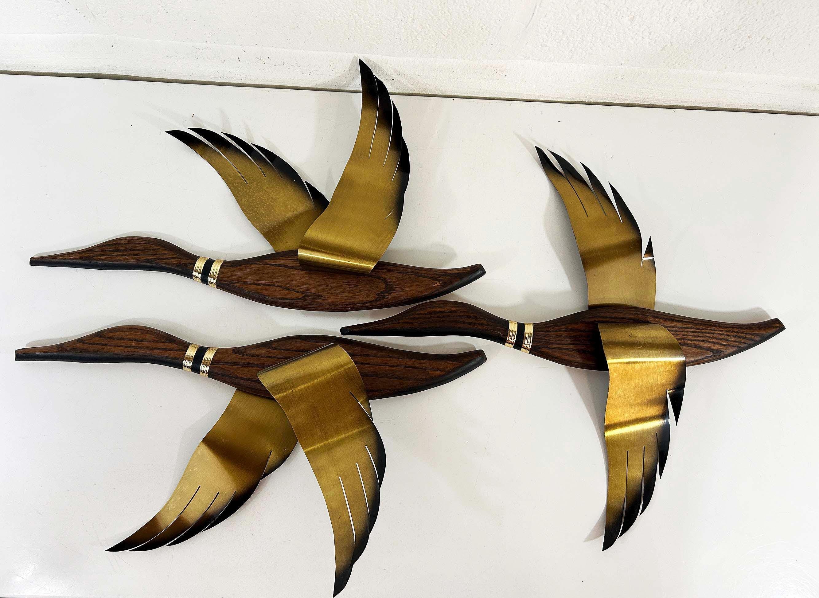 Very mid-century teak and metal 3D flying geese set of 3. All are in great vintage condition with no significant flaws. They are all approximately 22 inches long and they range in height from 11 to 19 inches depending on their wingspan.