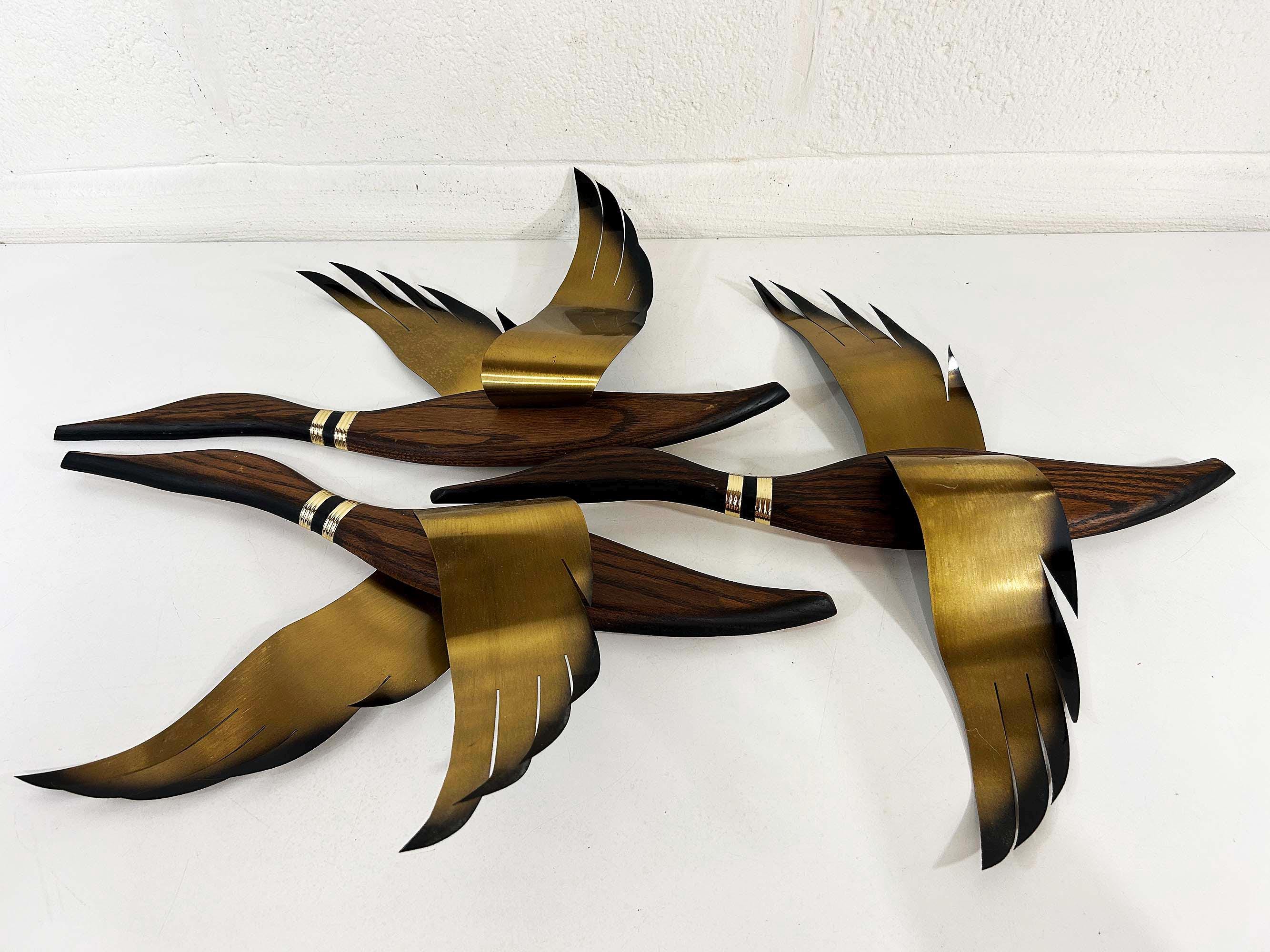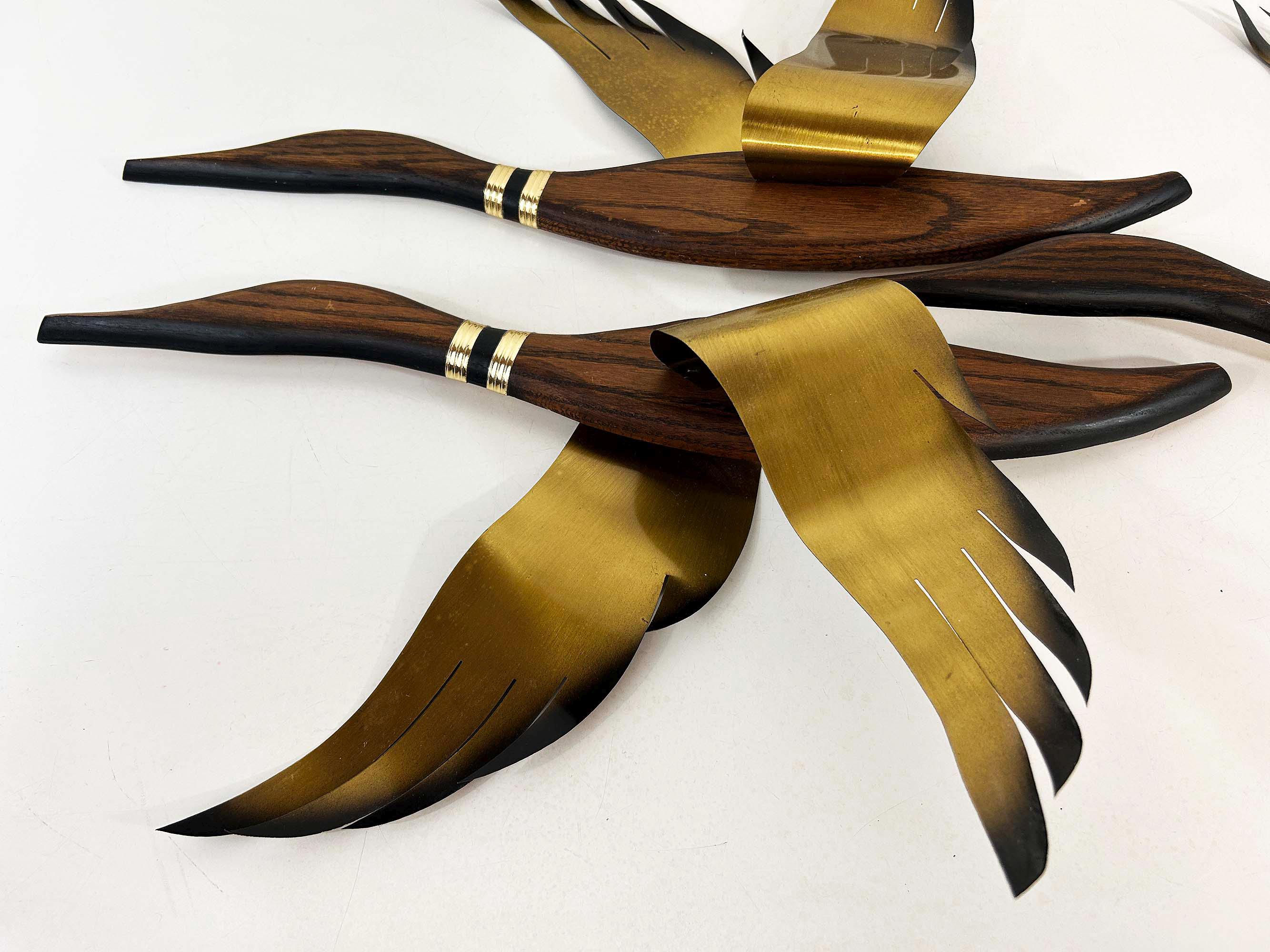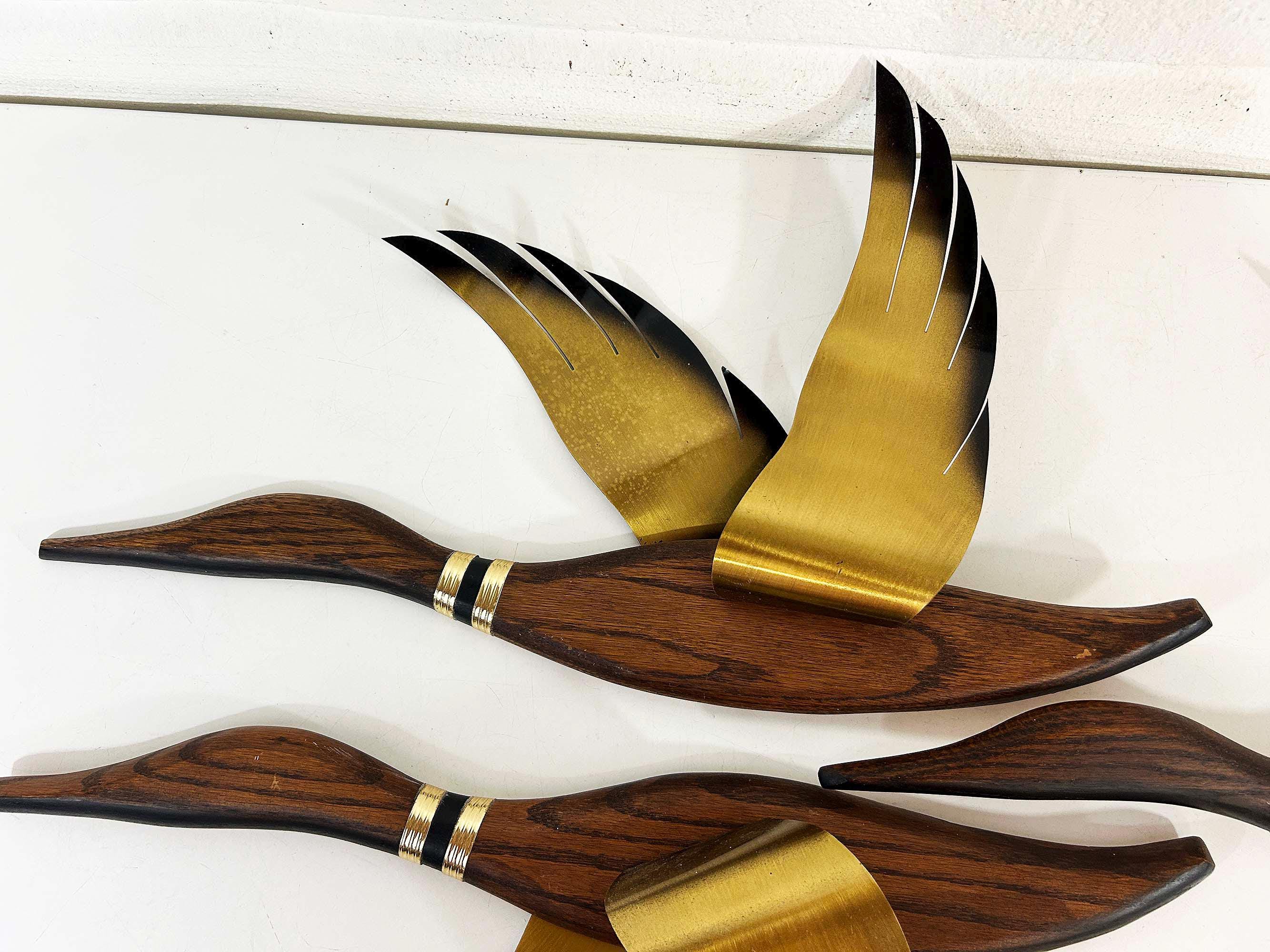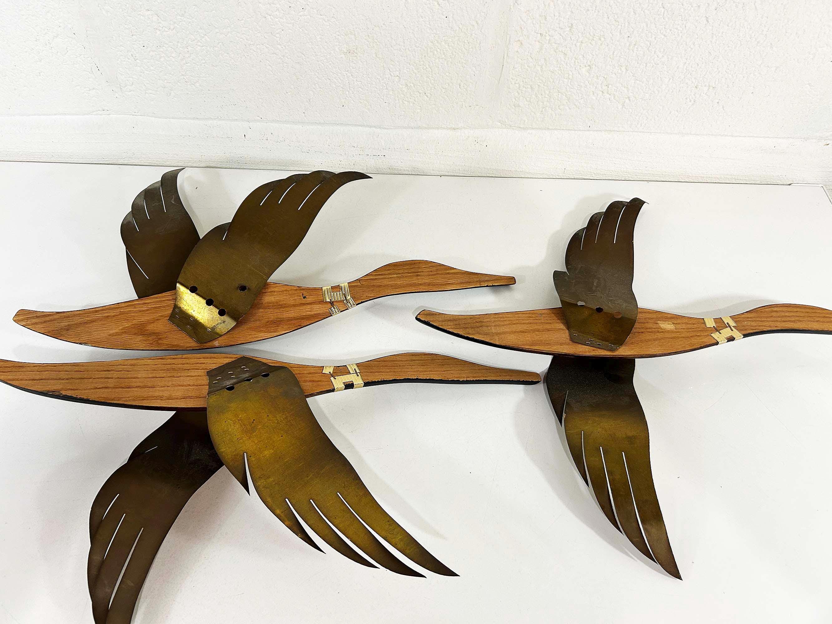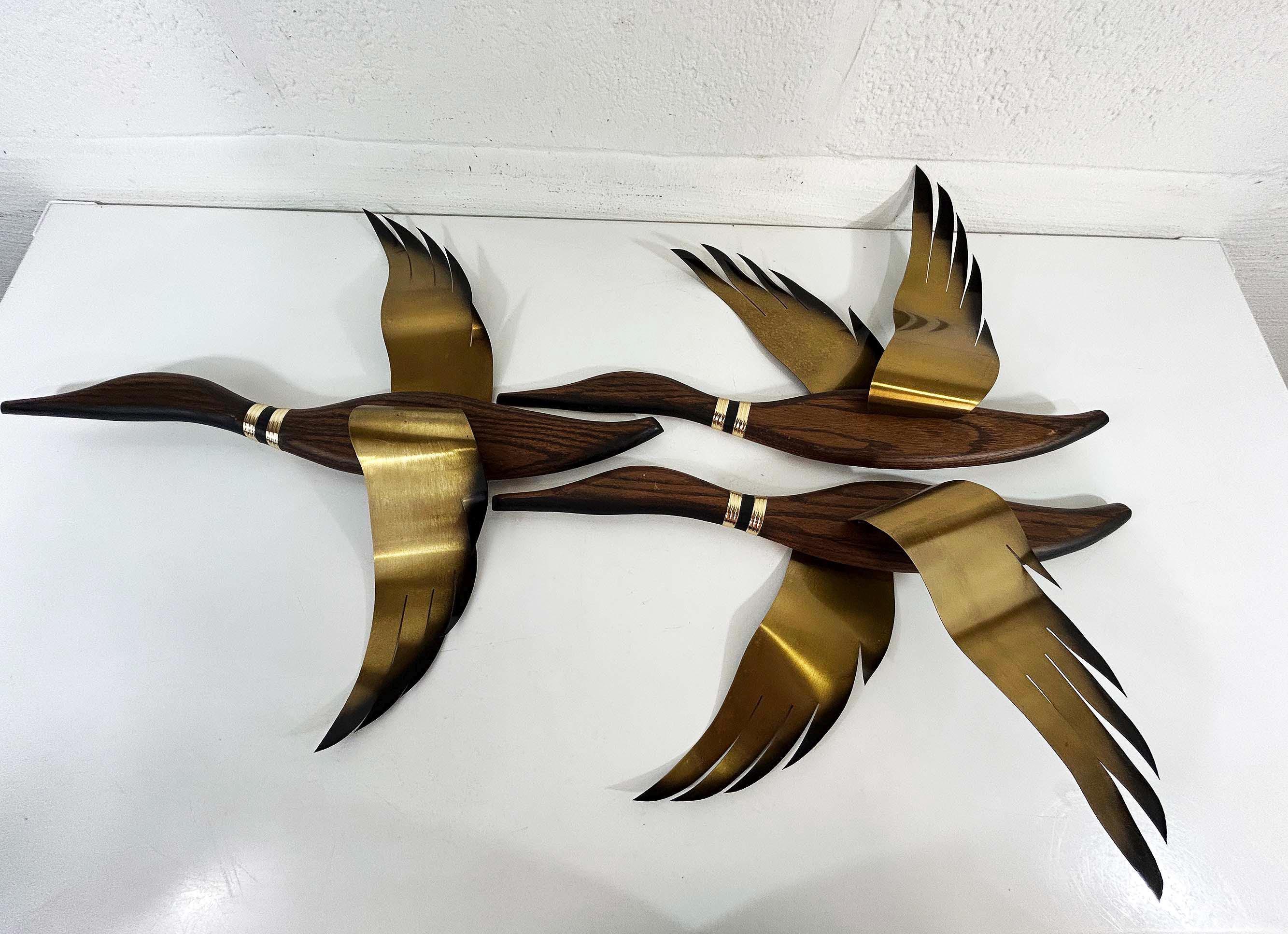 Very mid-century teak and metal 3D flying geese set of 3. All are in great vintage condition with no significant flaws. They are all approximately 22 inches long and they range in height from 11 to 19 inches depending on their wingspan.