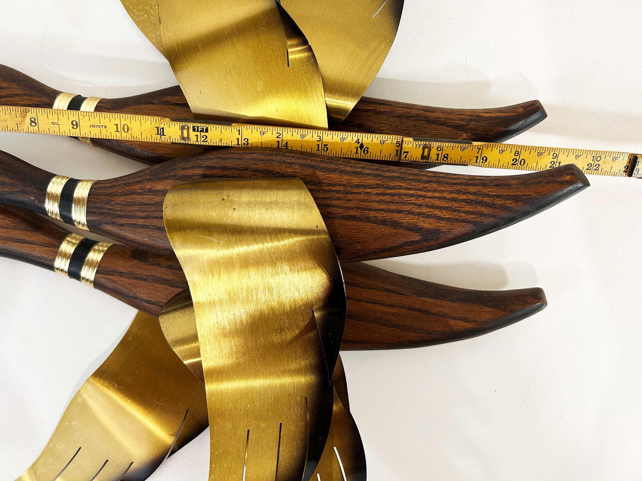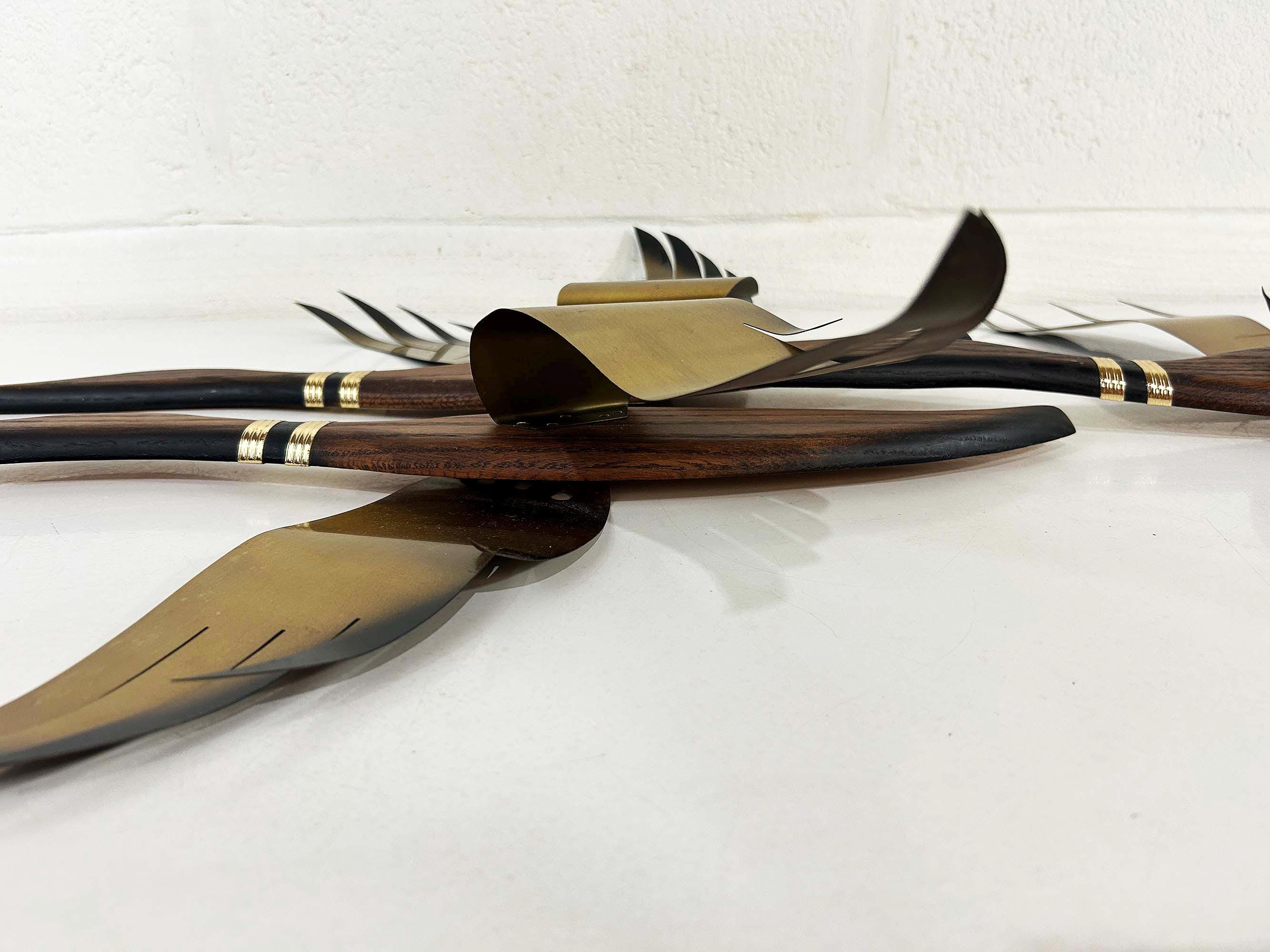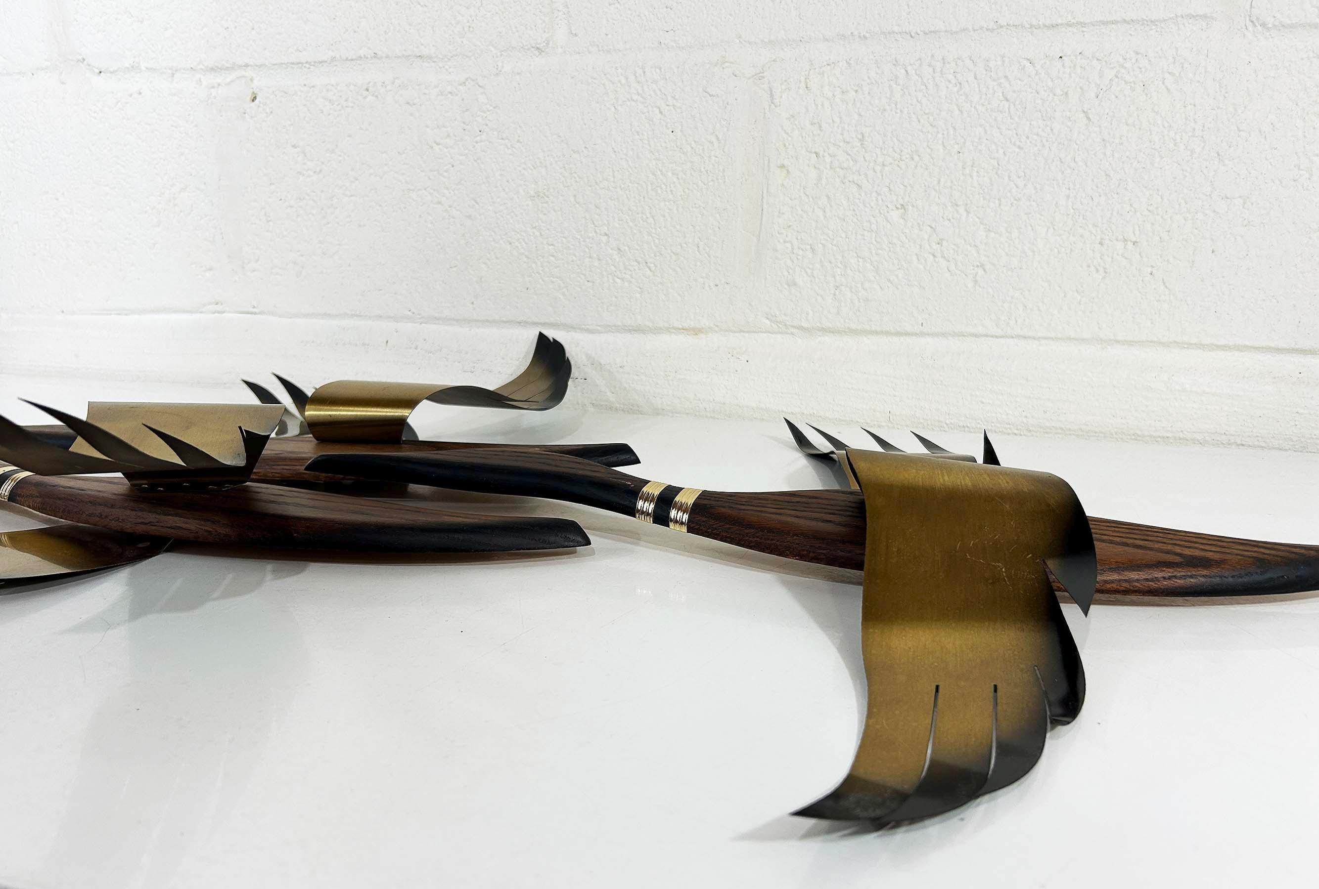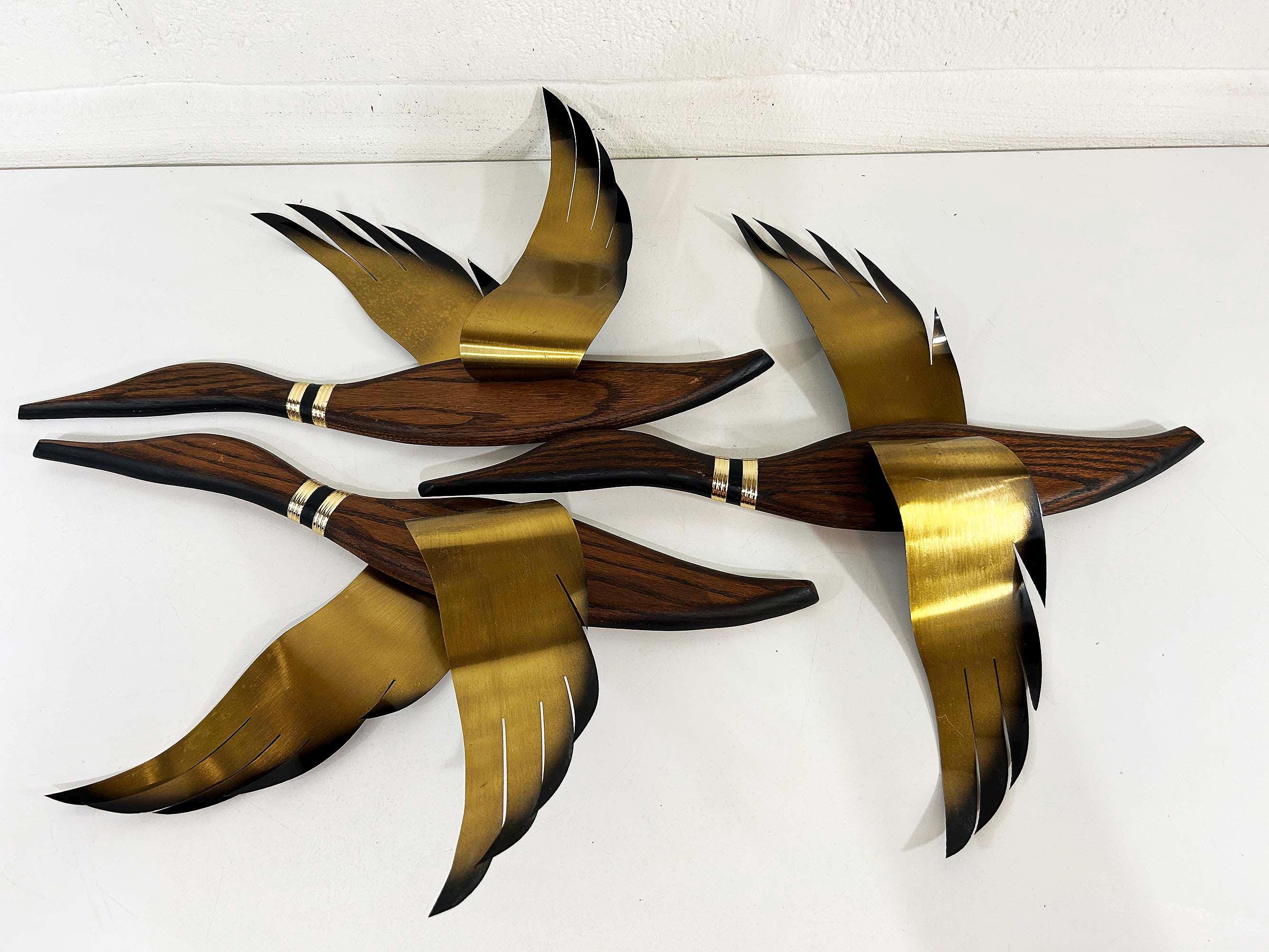 Very mid-century teak and metal 3D flying geese set of 3. All are in great vintage condition with no significant flaws. They are all approximately 22 inches long and they range in height from 11 to 19 inches depending on their wingspan.