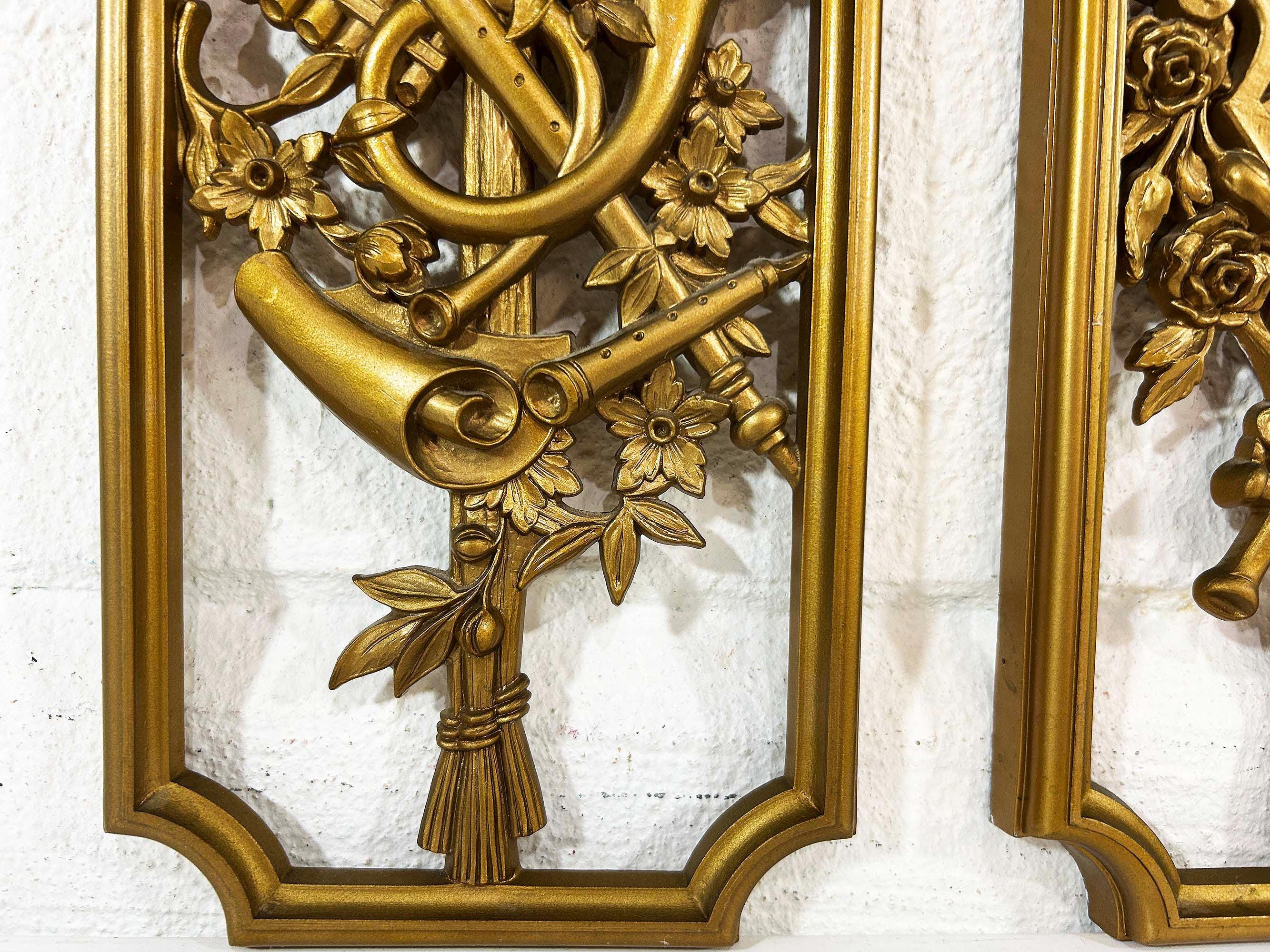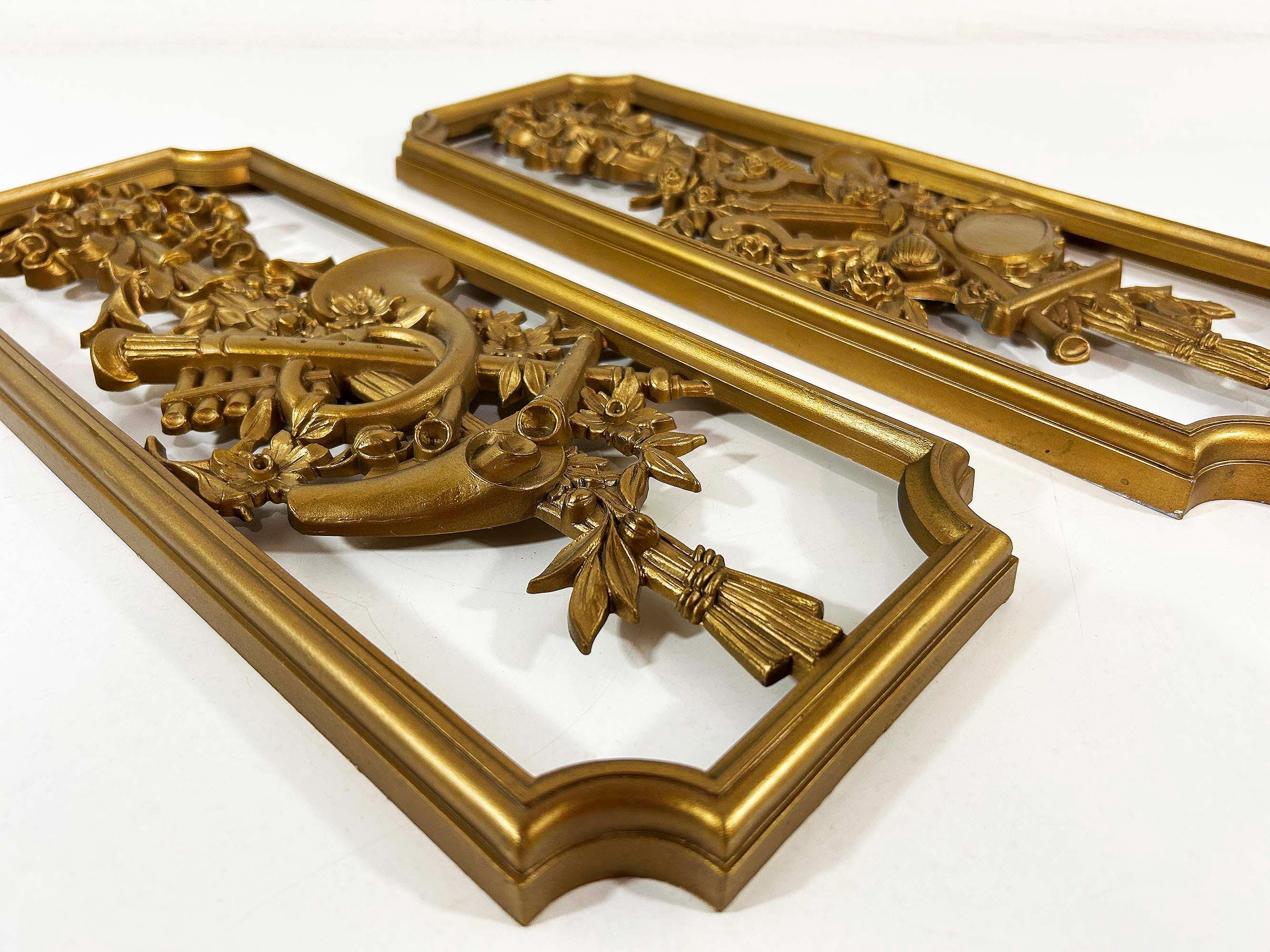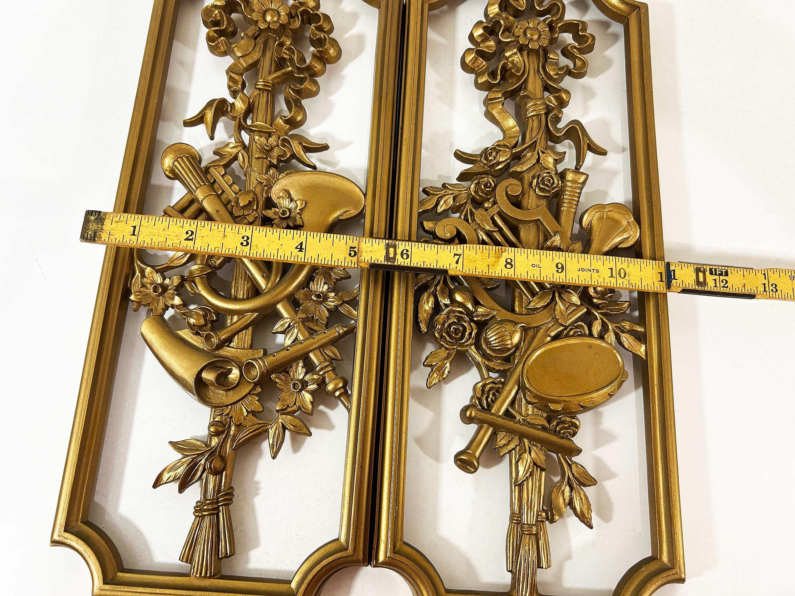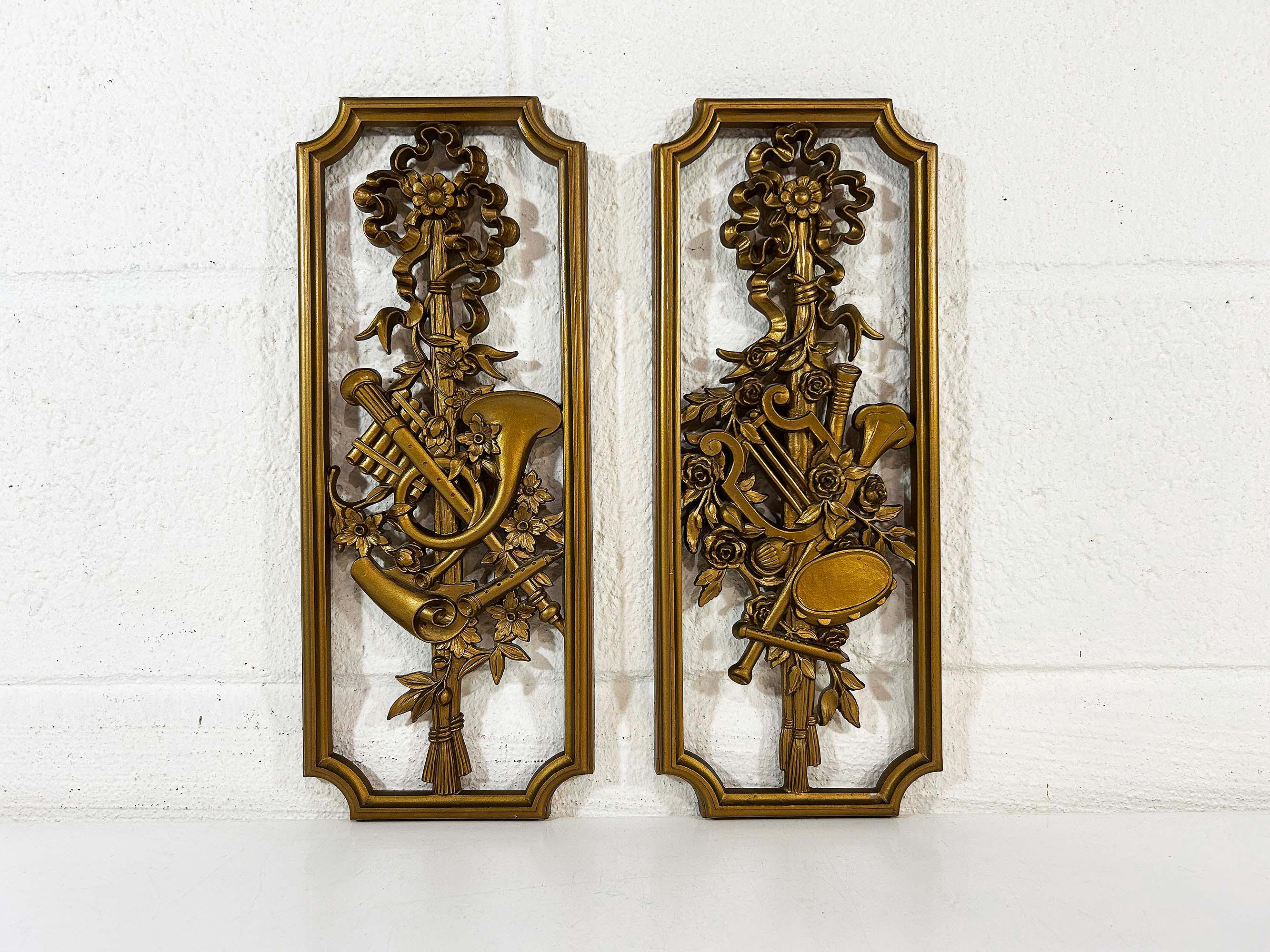 Lovely regency style plastic gold wall hangings. Each wall hanging is approximately 14 inches long and 5 1/2 inches wide. Both are in great vintage condition with no significant wear. They both have hooks on the back so they are ready to hang on your wall!