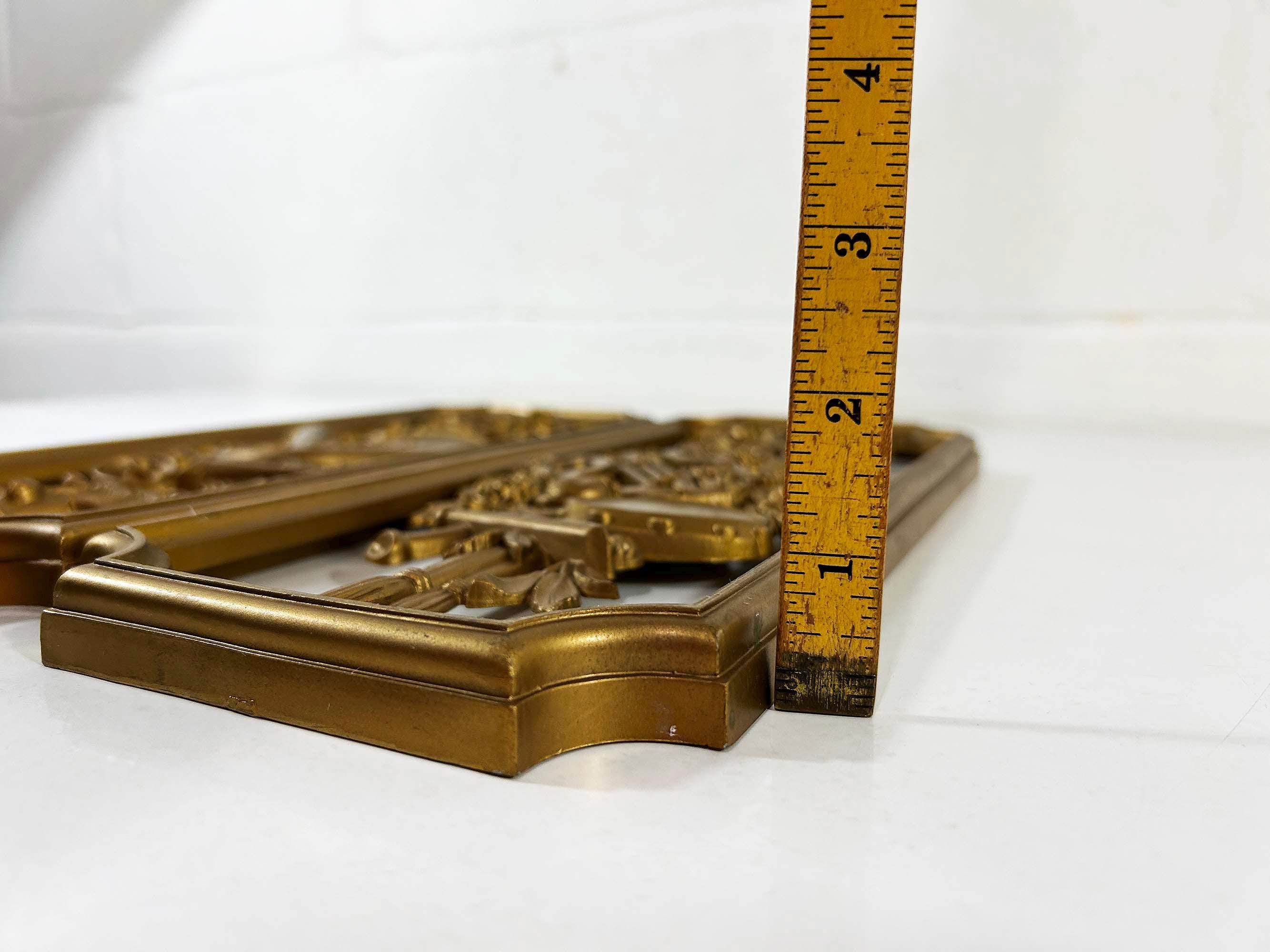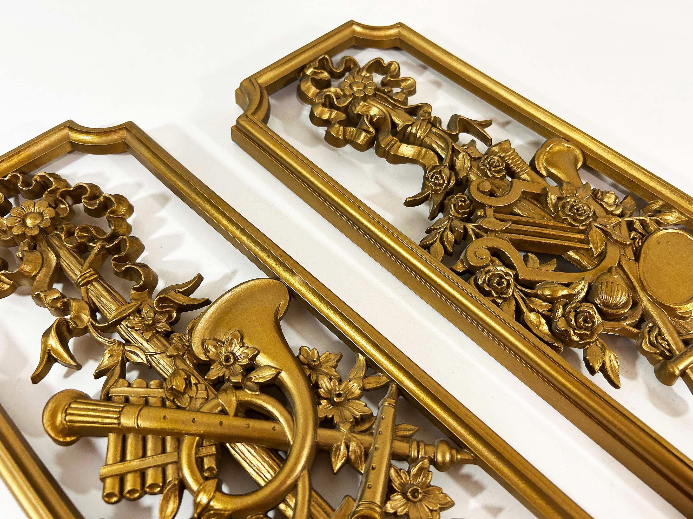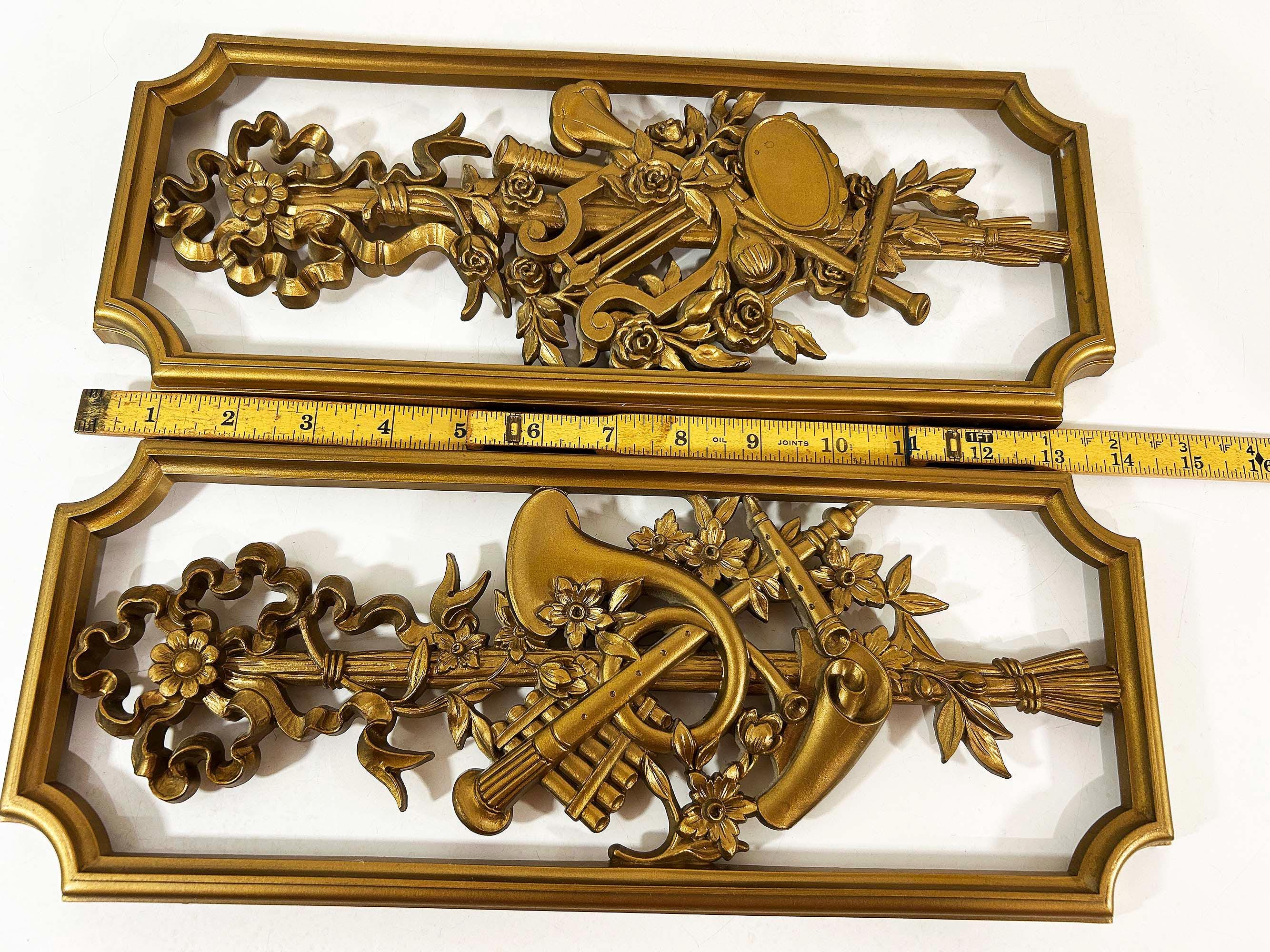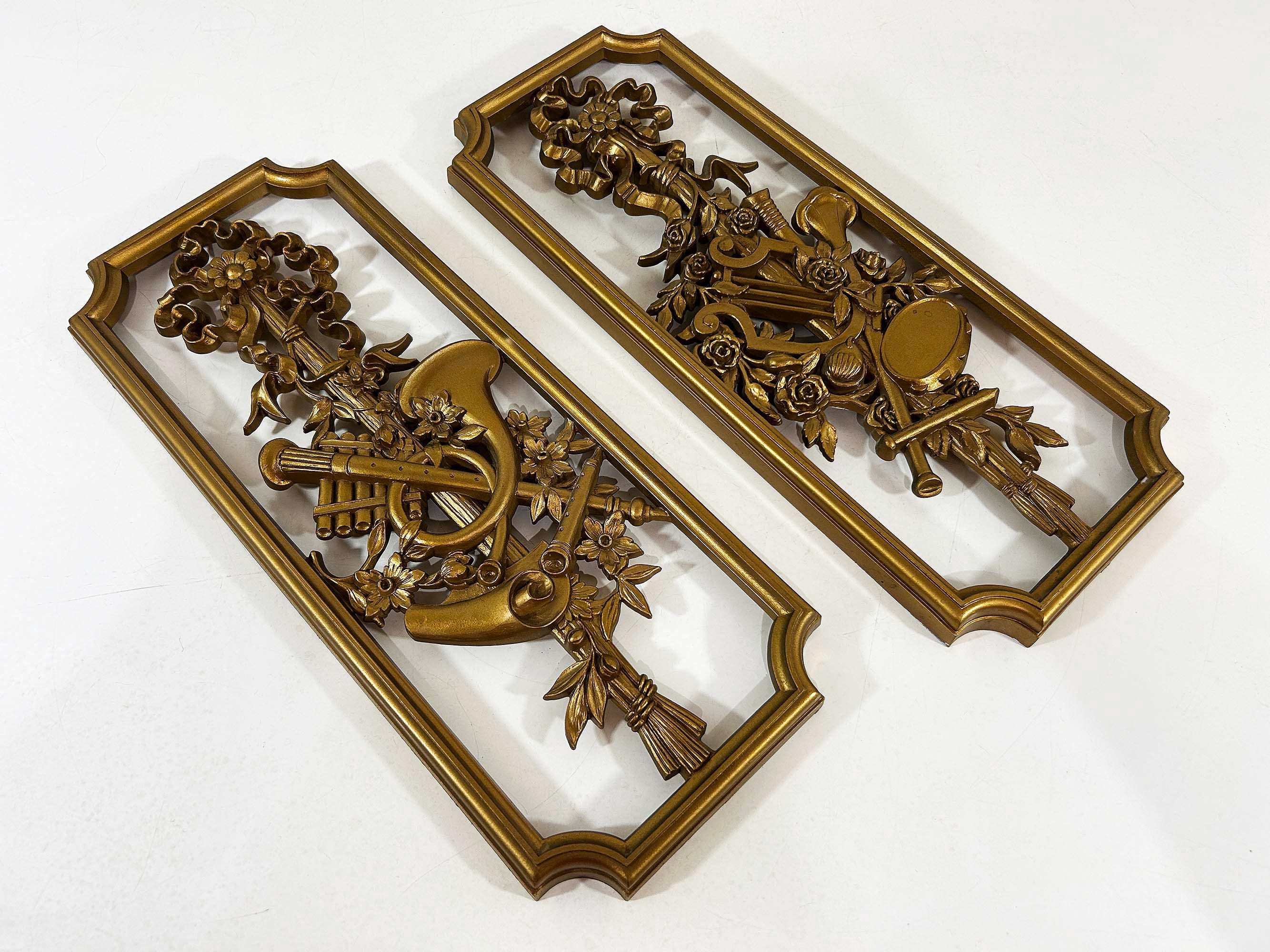 Lovely regency style plastic gold wall hangings. Each wall hanging is approximately 14 inches long and 5 1/2 inches wide. Both are in great vintage condition with no significant wear. They both have hooks on the back so they are ready to hang on your wall!