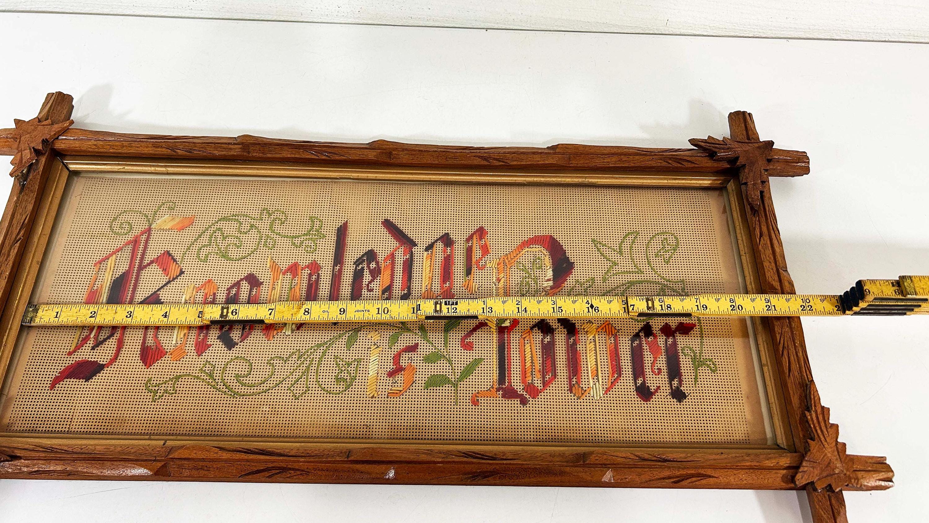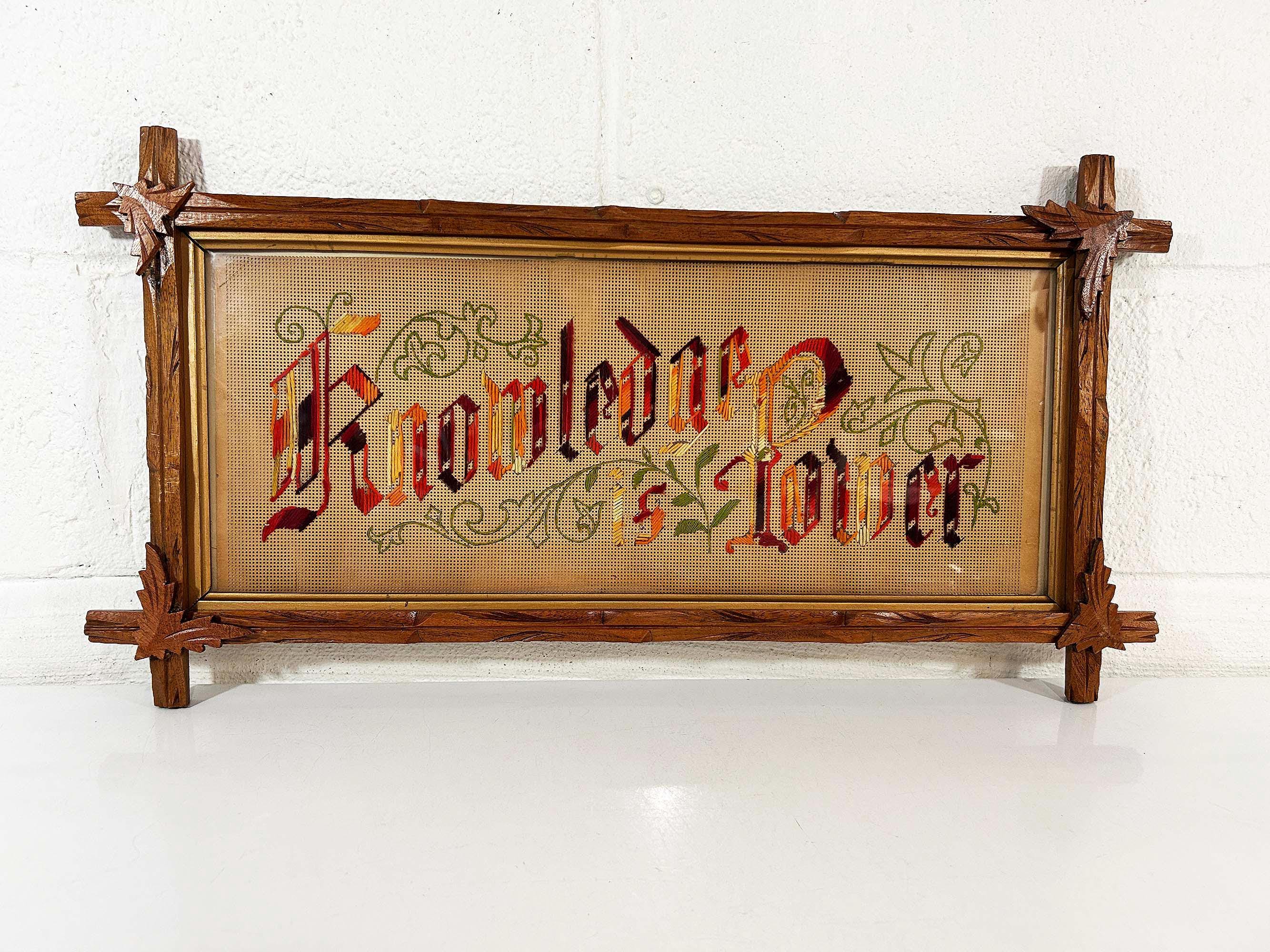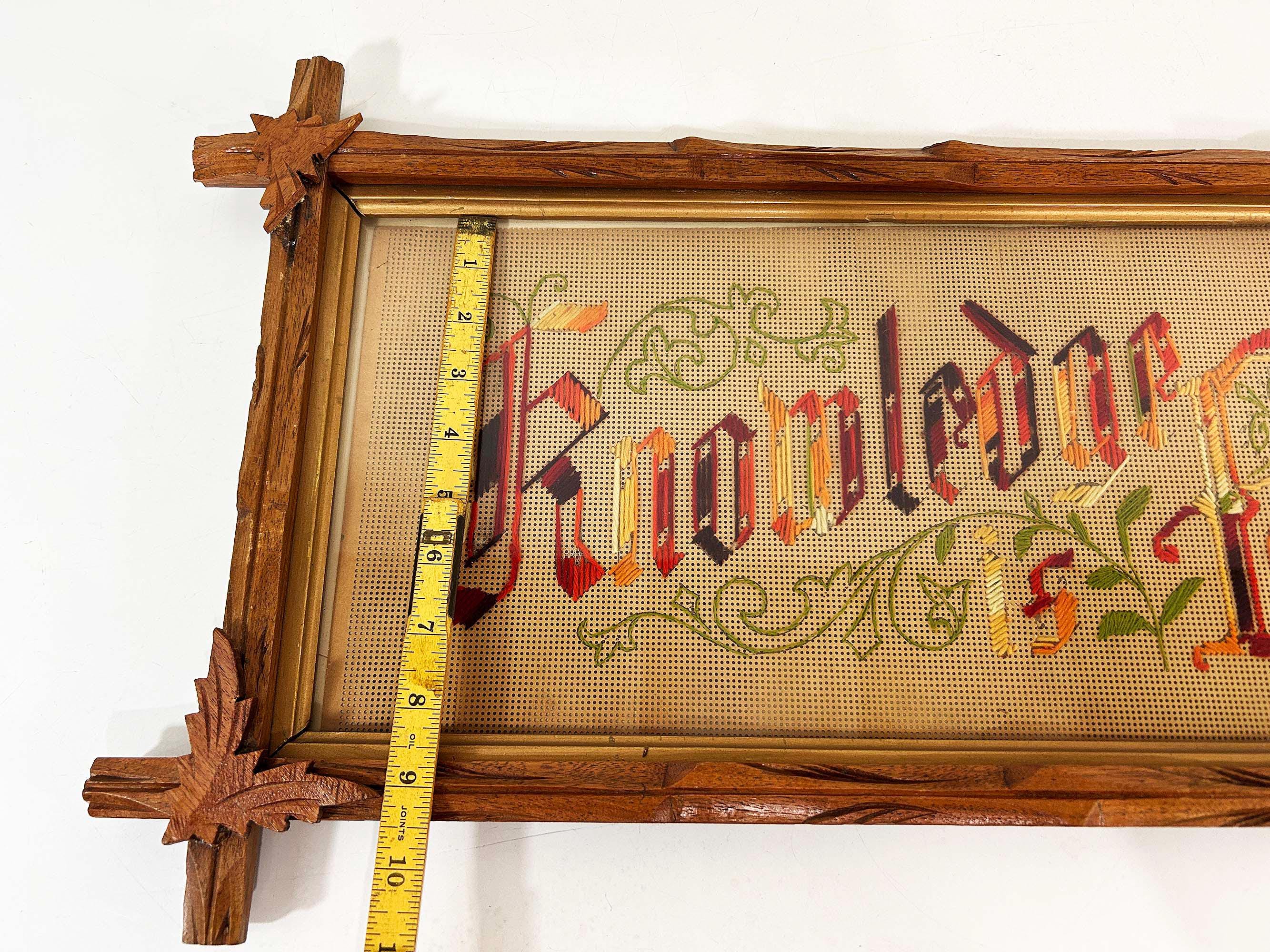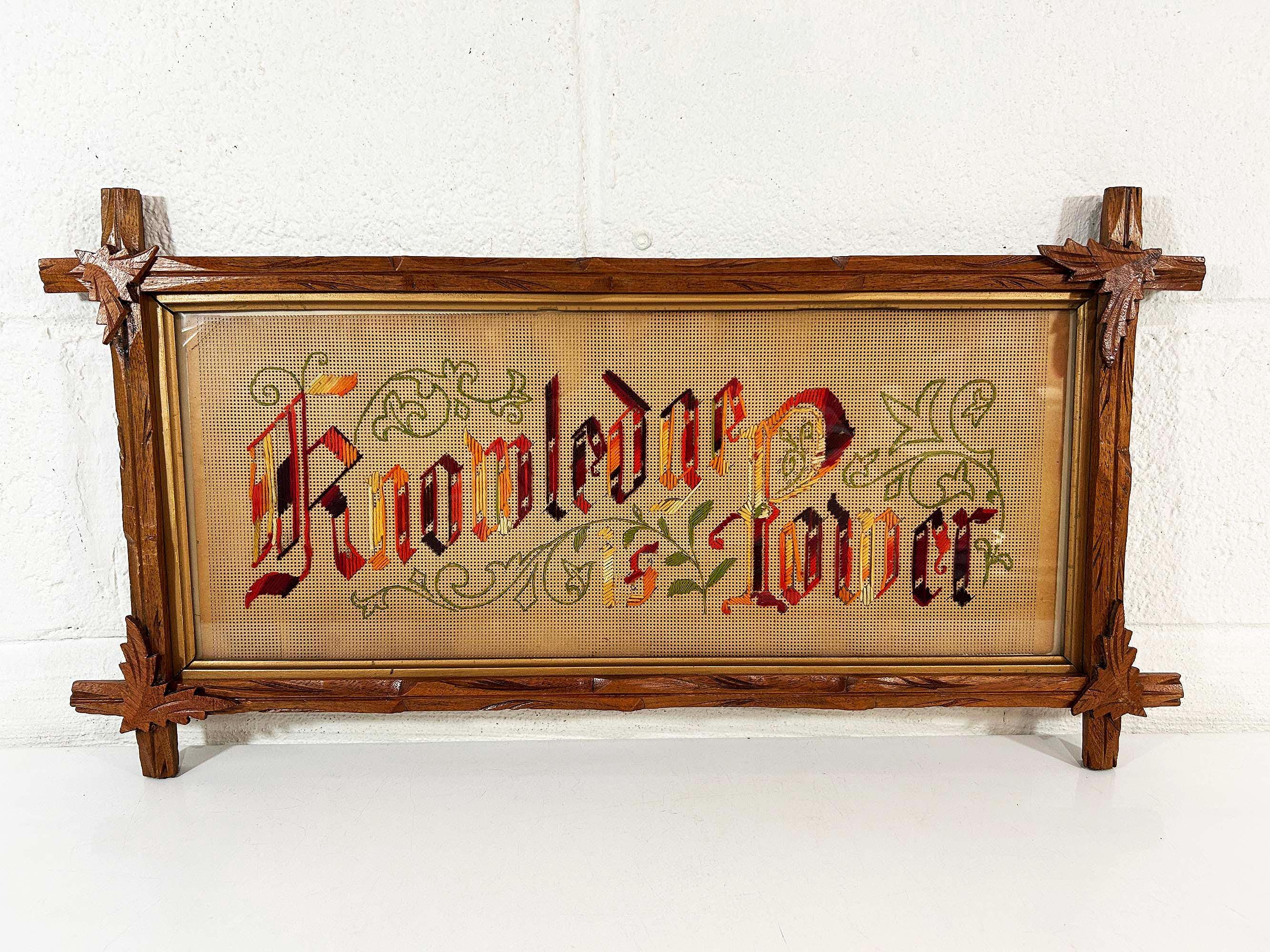 Incredible “Knowledge is Power” antique Victorian punch paper embroidery in an Adirondack frame! I've never seen one of these with this saying - super unique! The frame is approximately 14 inches tall and 26 inches wide. The frame is in good vintage shape but some of the wooden leaves at each corner have broken off - please be sure to inspect all photos closely. There is a wire on the back so it is ready to hang.