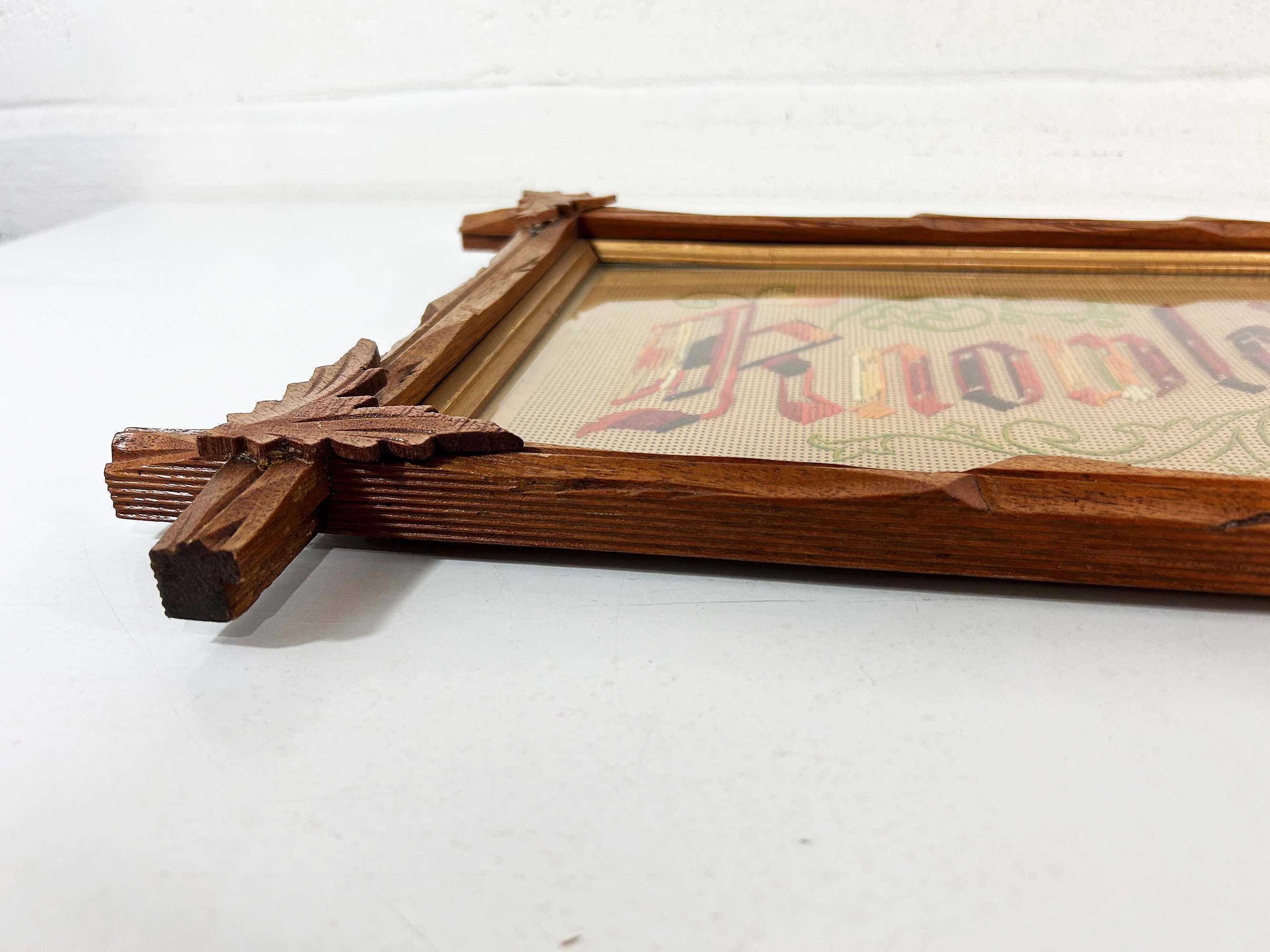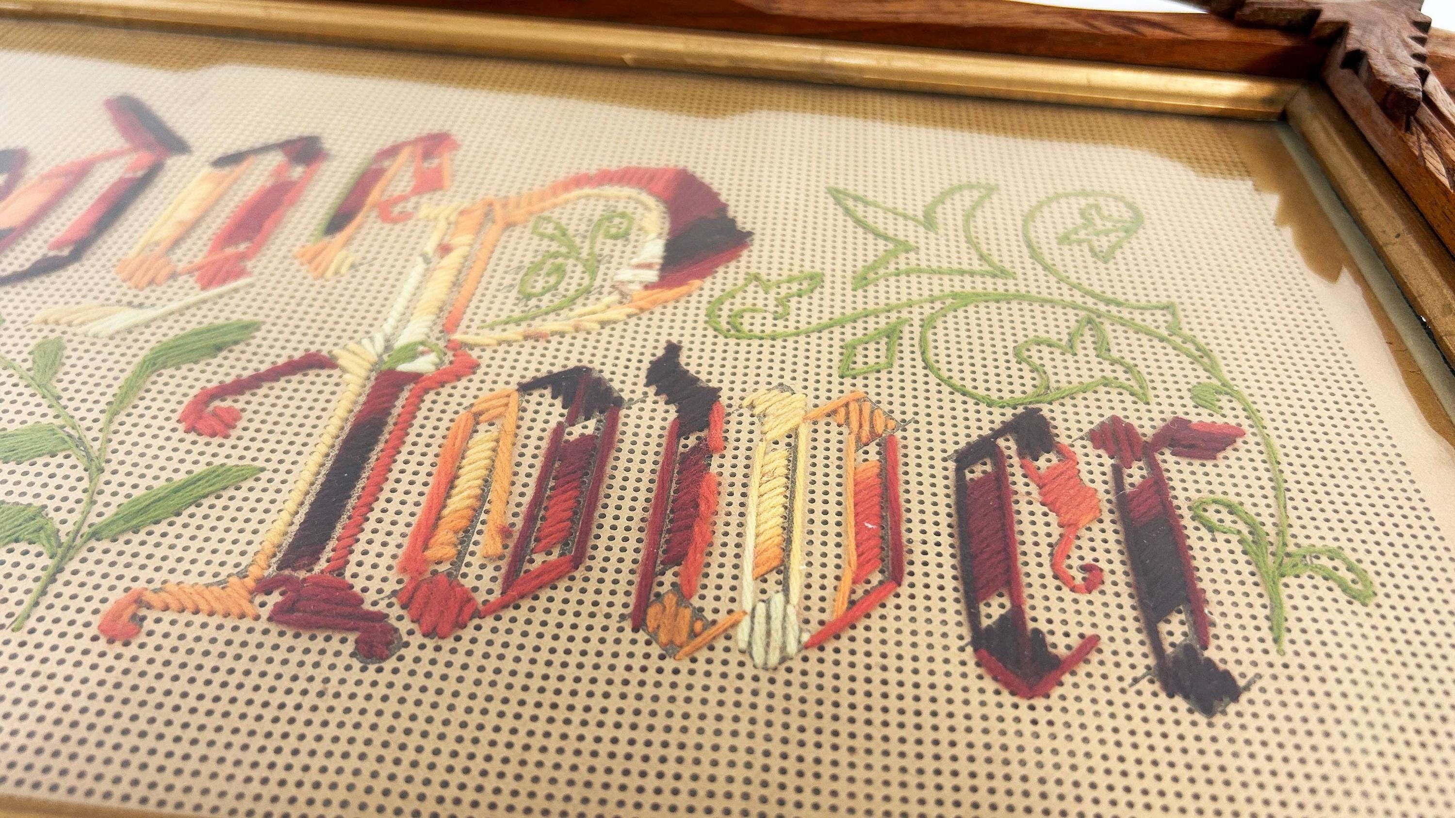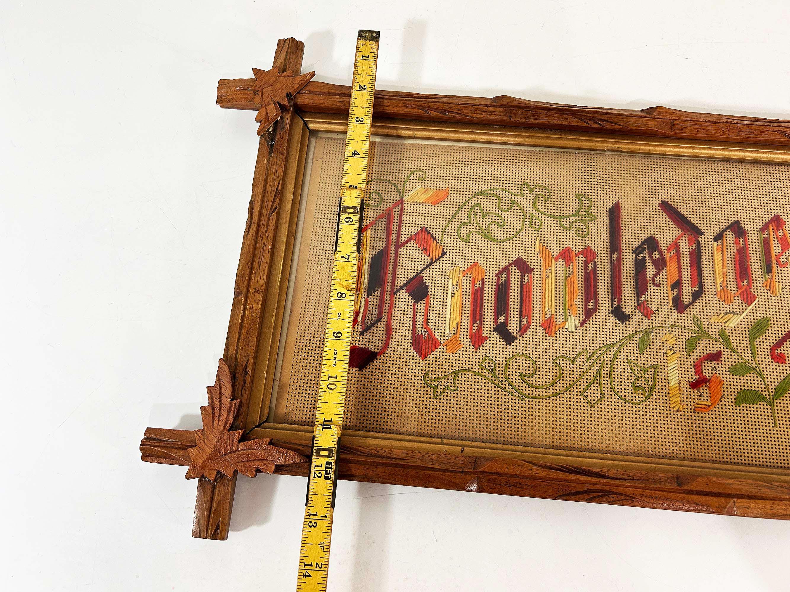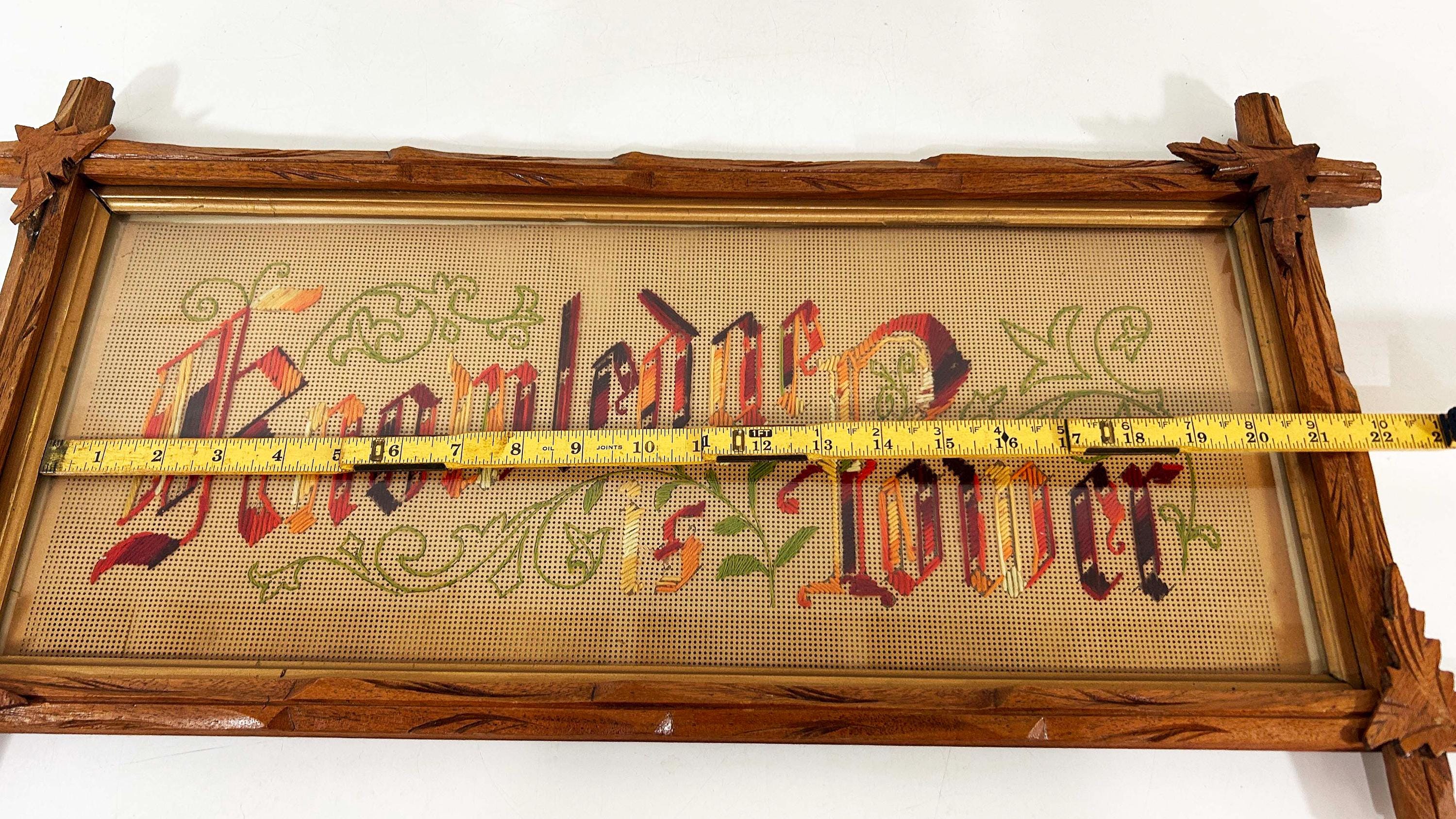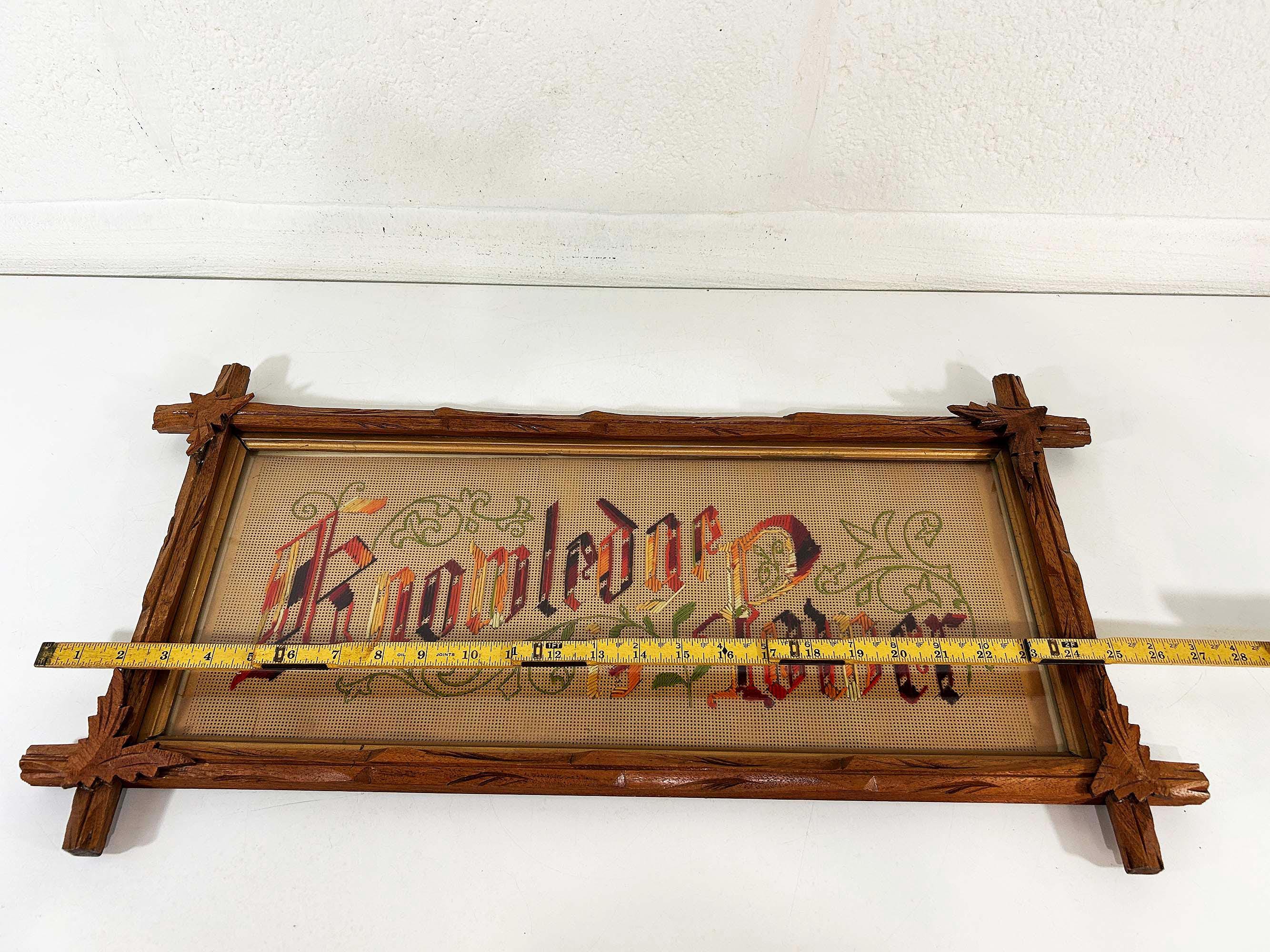 Incredible “Knowledge is Power” antique Victorian punch paper embroidery in an Adirondack frame! I've never seen one of these with this saying - super unique! The frame is approximately 14 inches tall and 26 inches wide. The frame is in good vintage shape but some of the wooden leaves at each corner have broken off - please be sure to inspect all photos closely. There is a wire on the back so it is ready to hang.