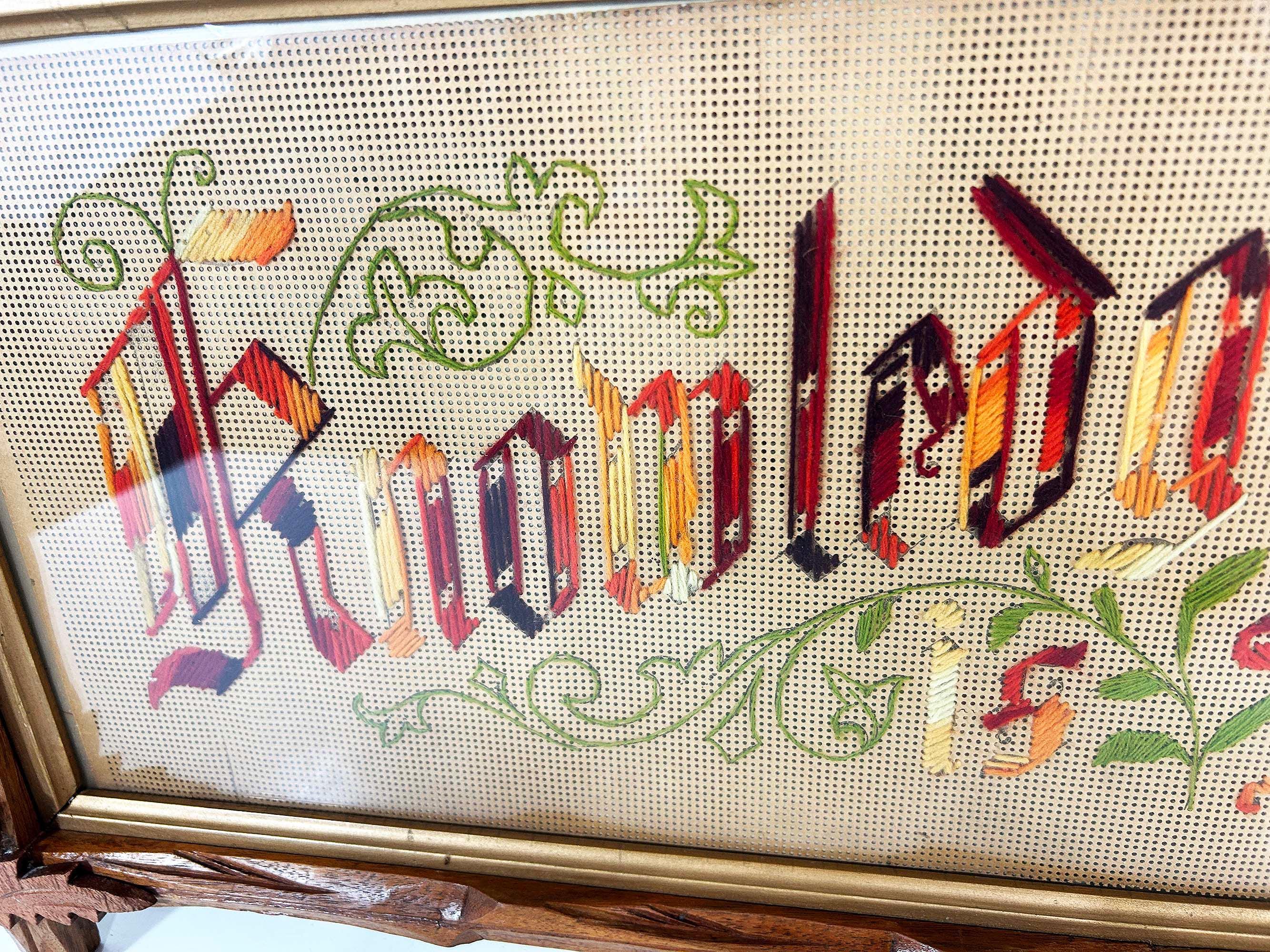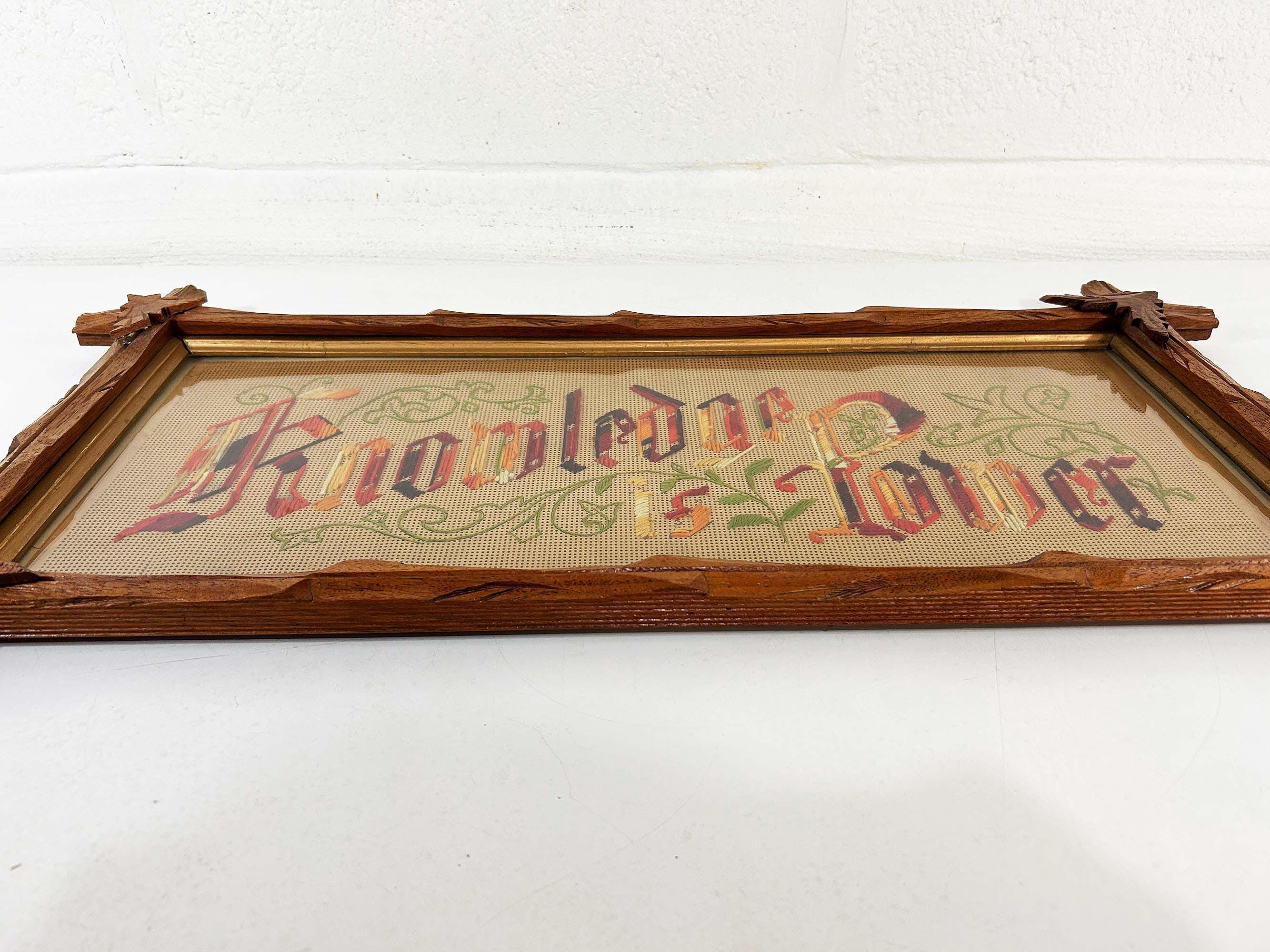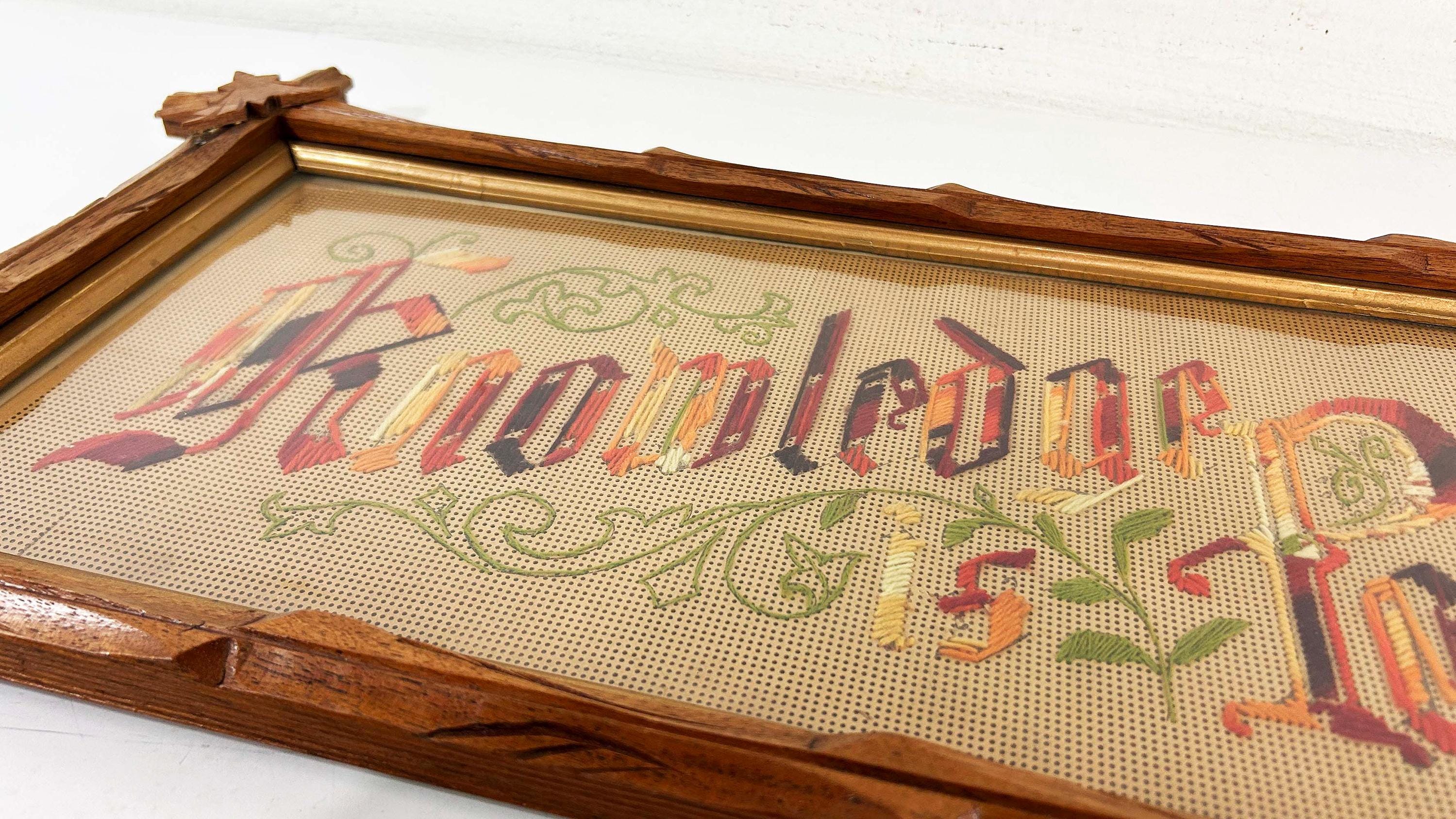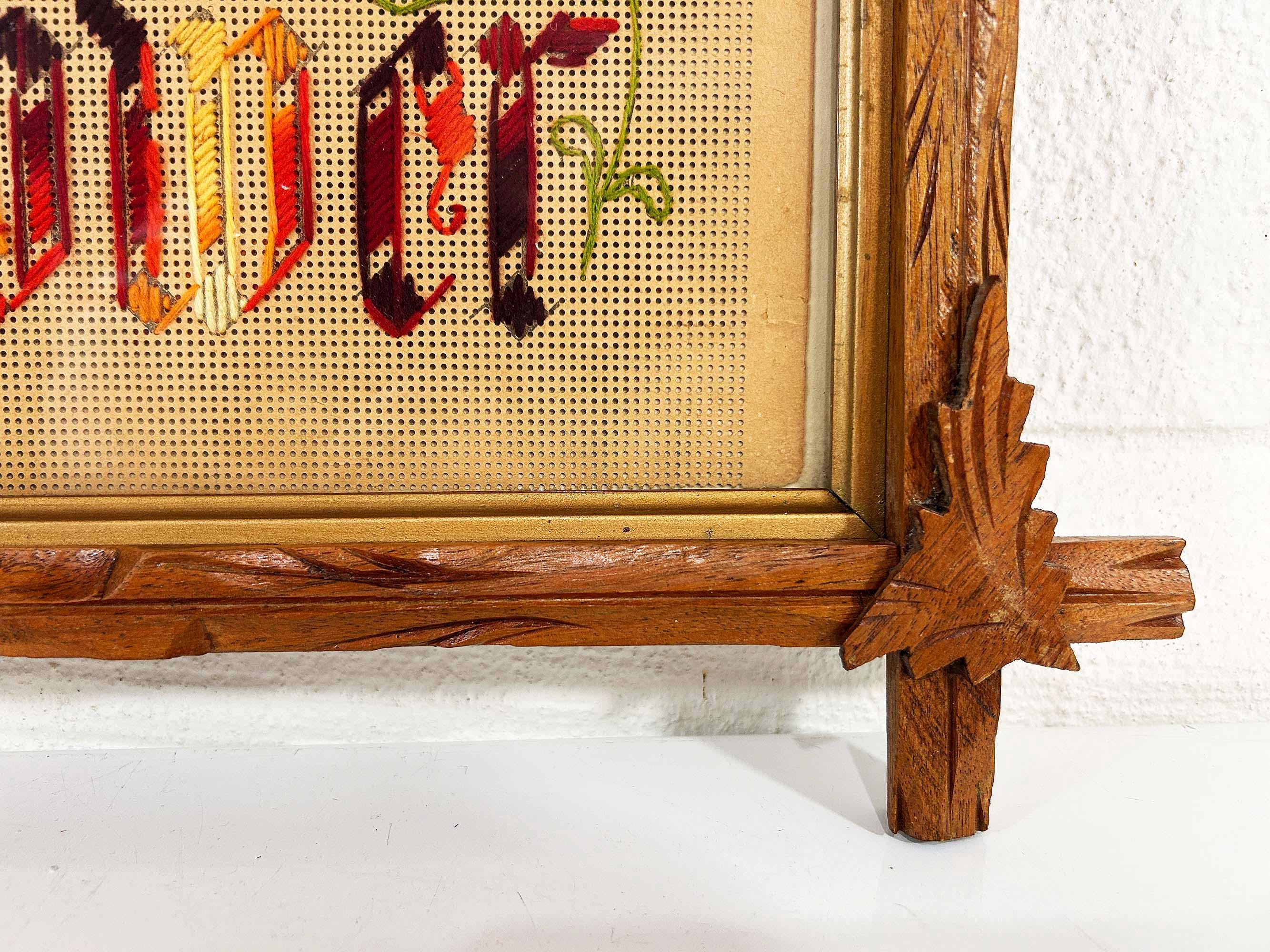 Incredible “Knowledge is Power” antique Victorian punch paper embroidery in an Adirondack frame! I've never seen one of these with this saying - super unique! The frame is approximately 14 inches tall and 26 inches wide. The frame is in good vintage shape but some of the wooden leaves at each corner have broken off - please be sure to inspect all photos closely. There is a wire on the back so it is ready to hang.