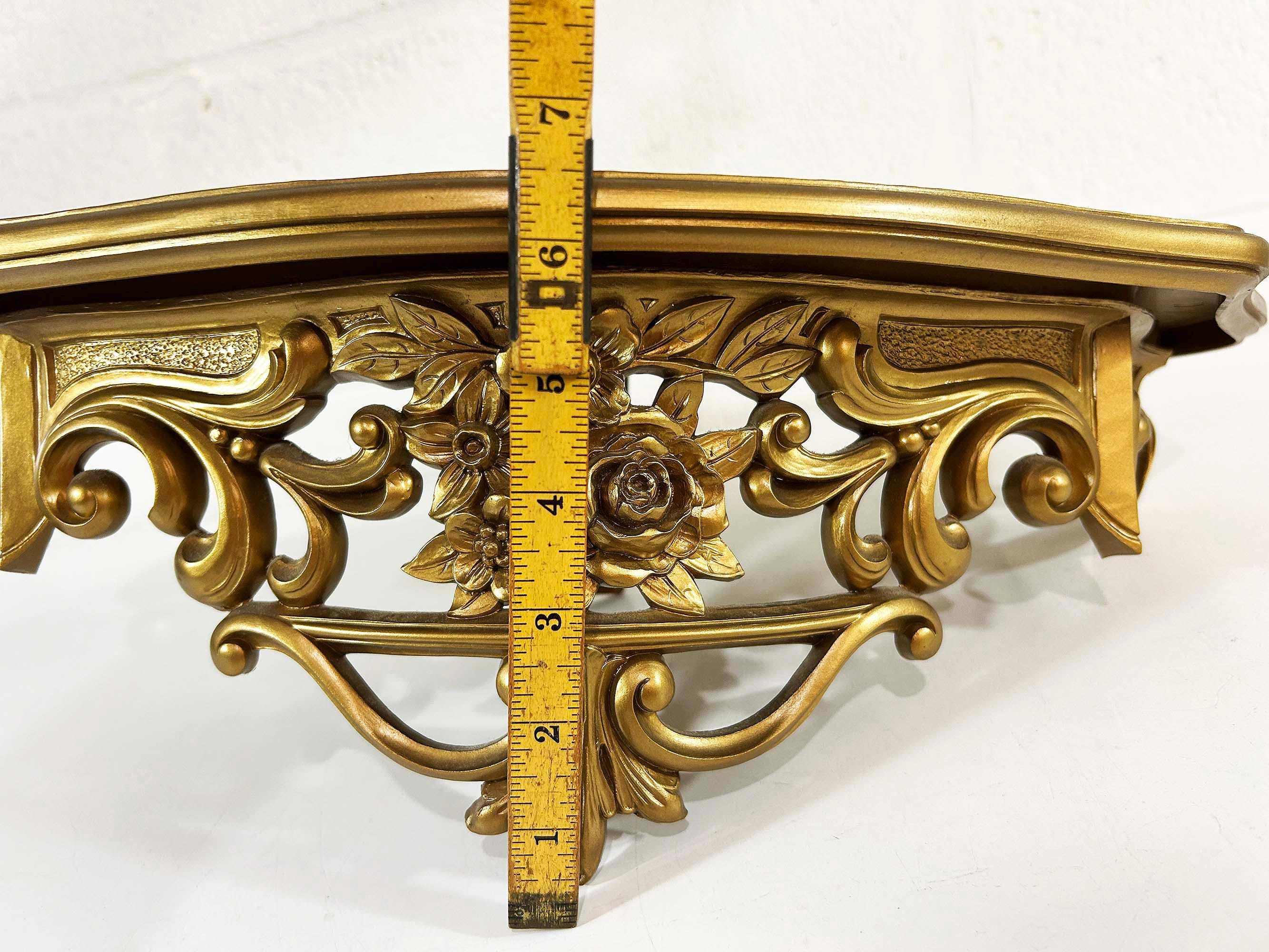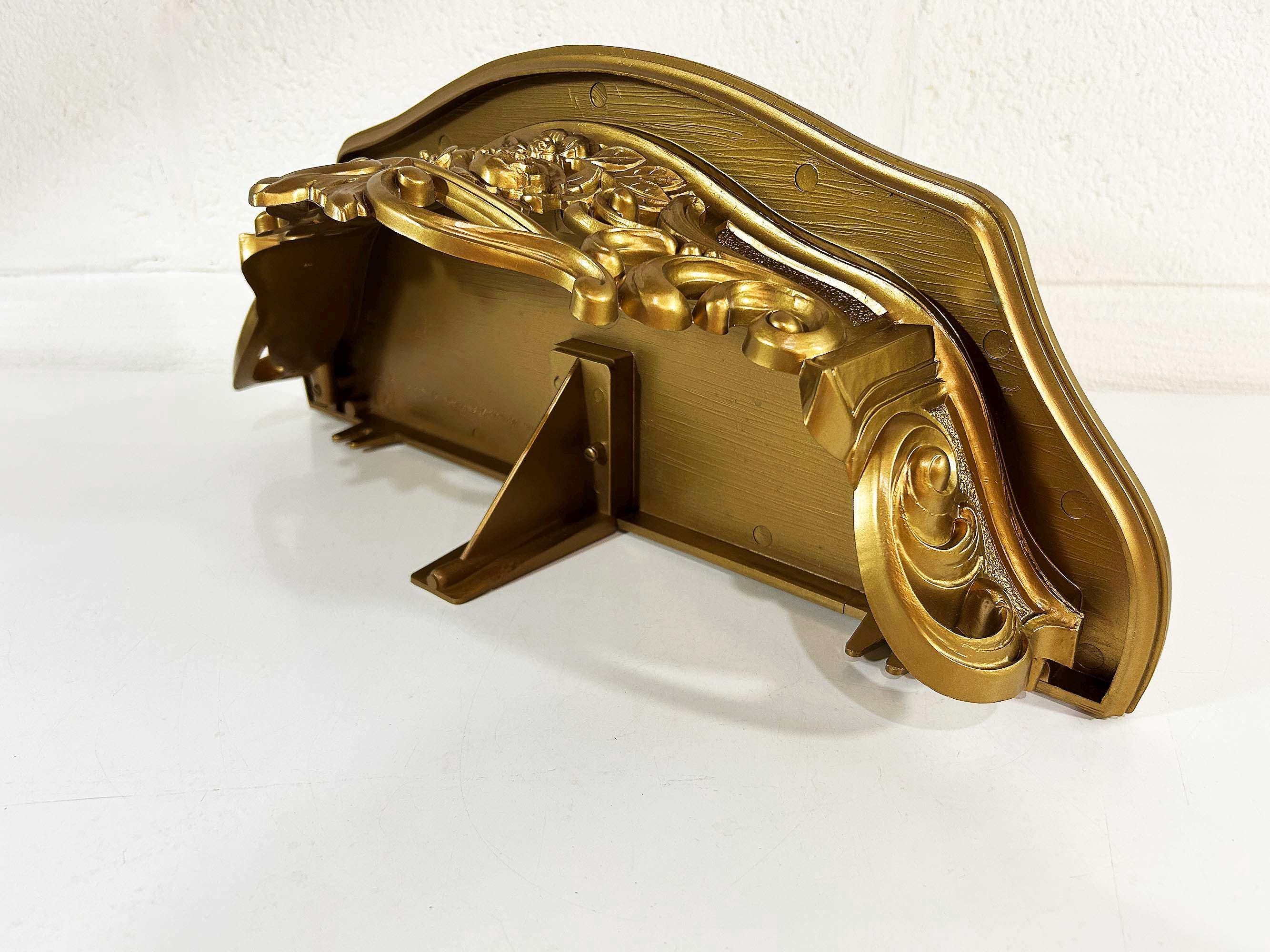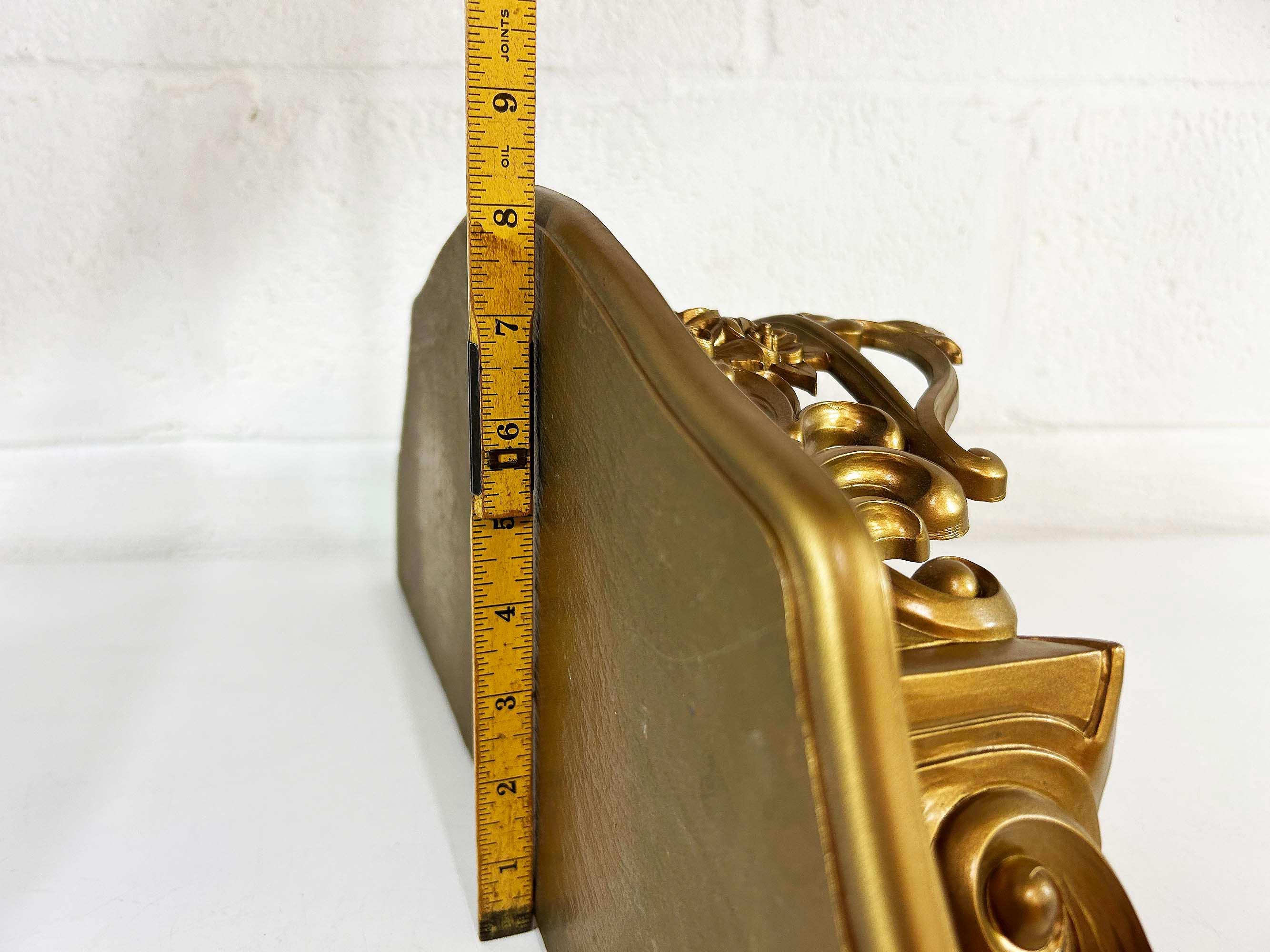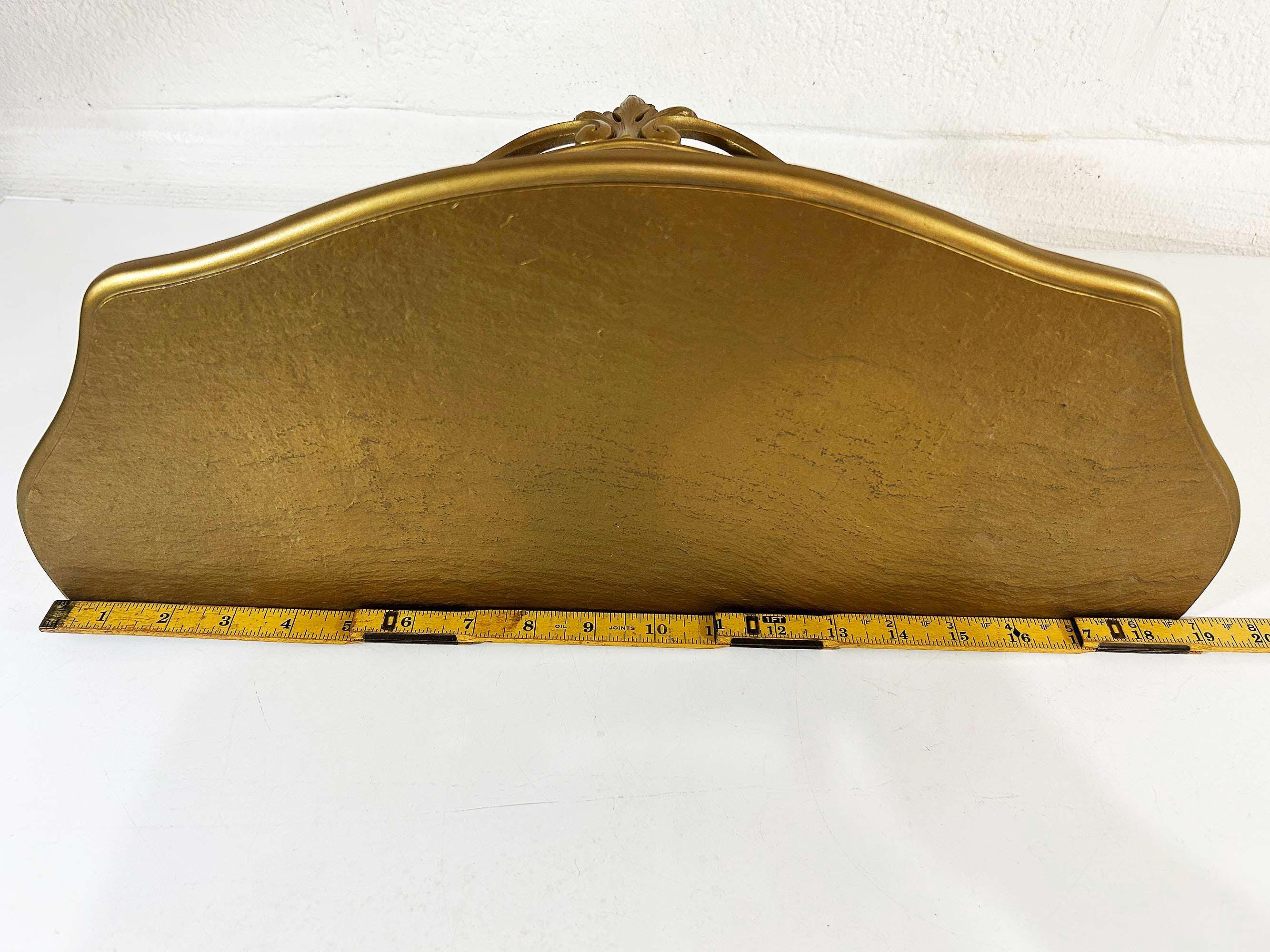 Super cool 1960s gold plastic ornate shelf. Great overall condition with a bit of discoloration where items were placed on it in the past. The shelf is approximately 6 1/2 inches tall, 19 inches wide and 8 inches deep.