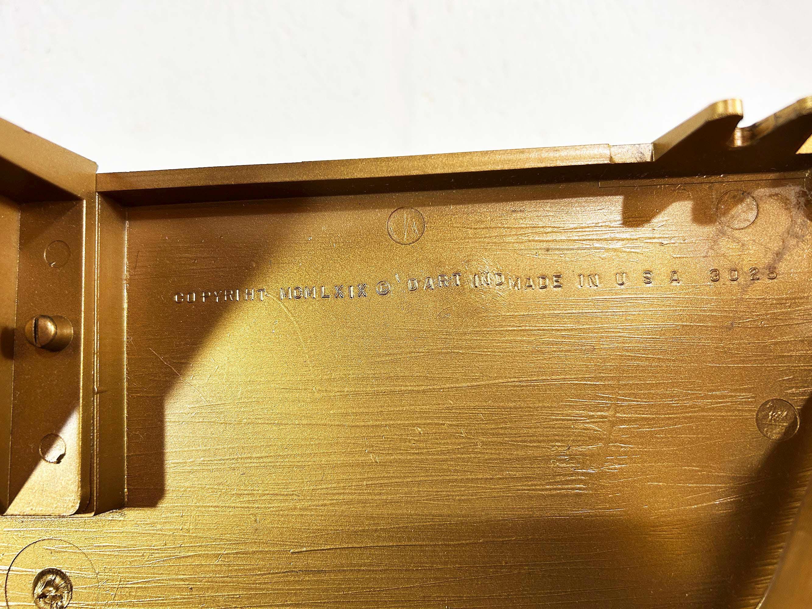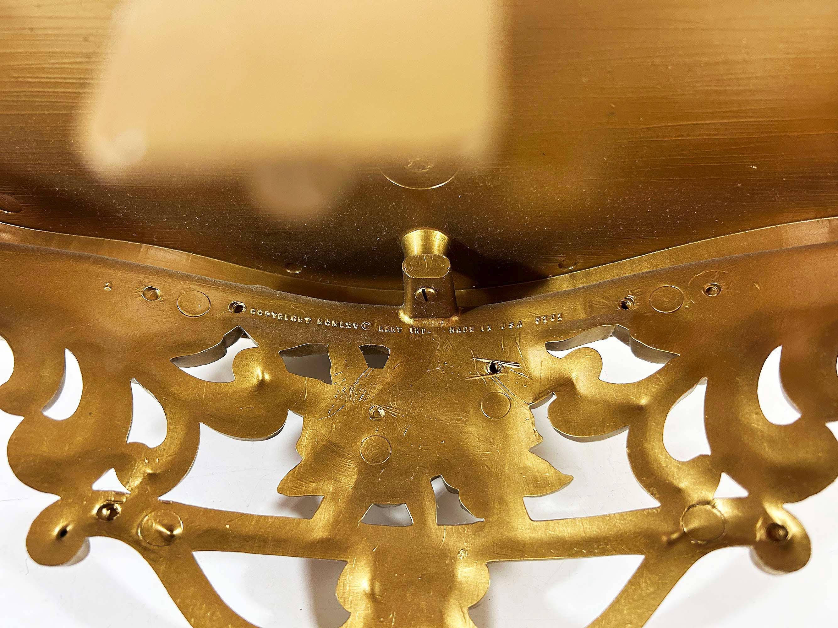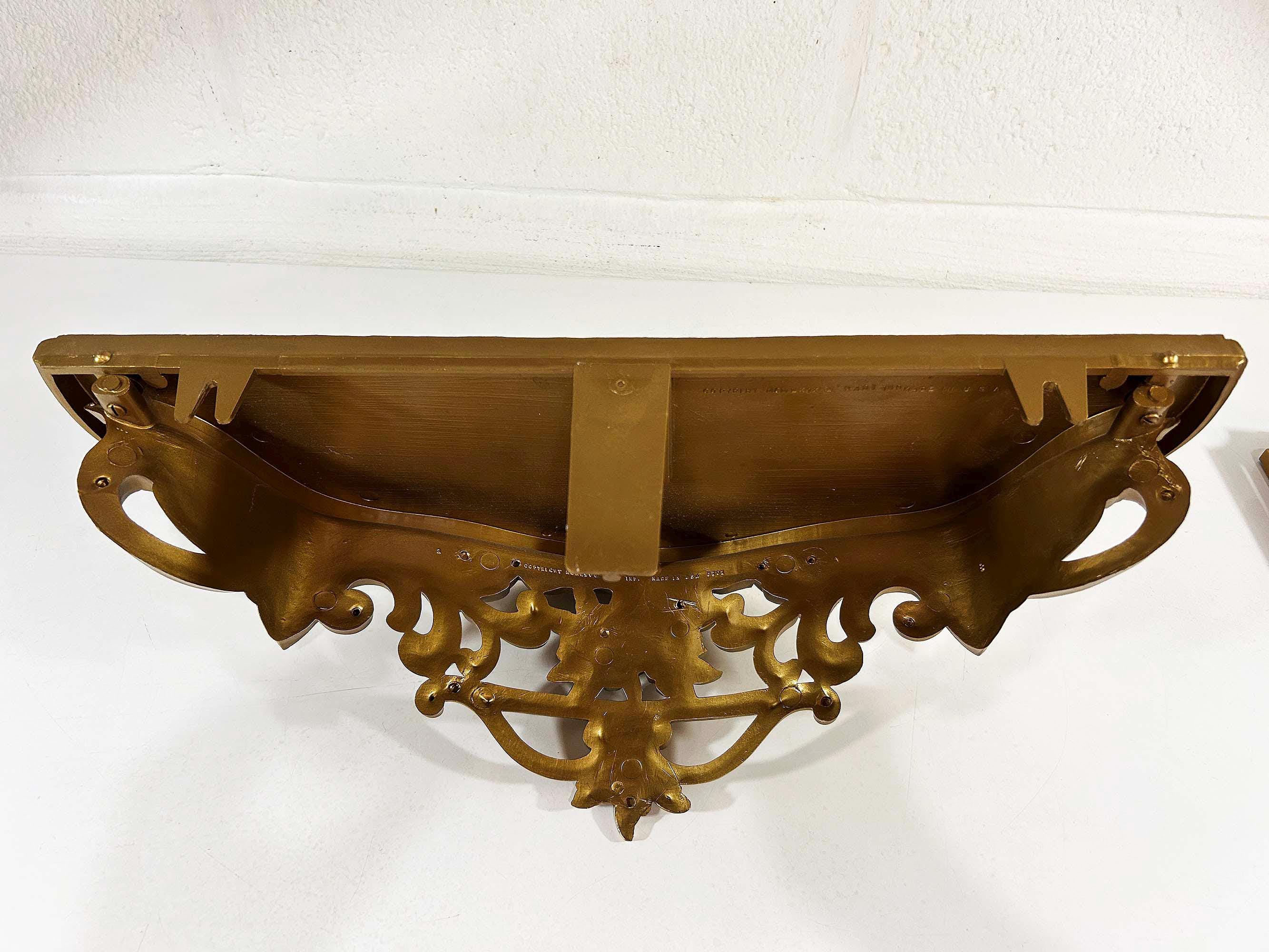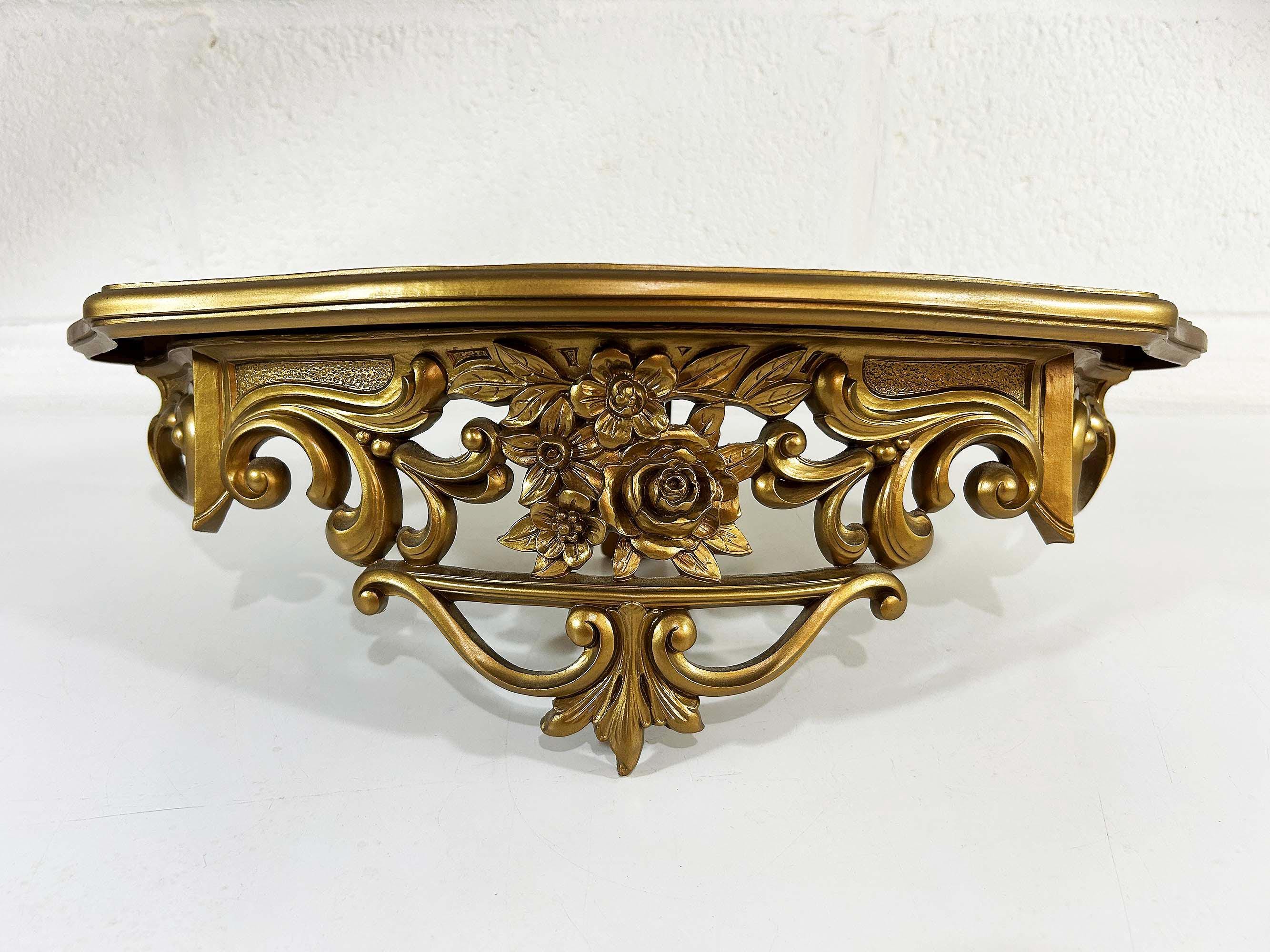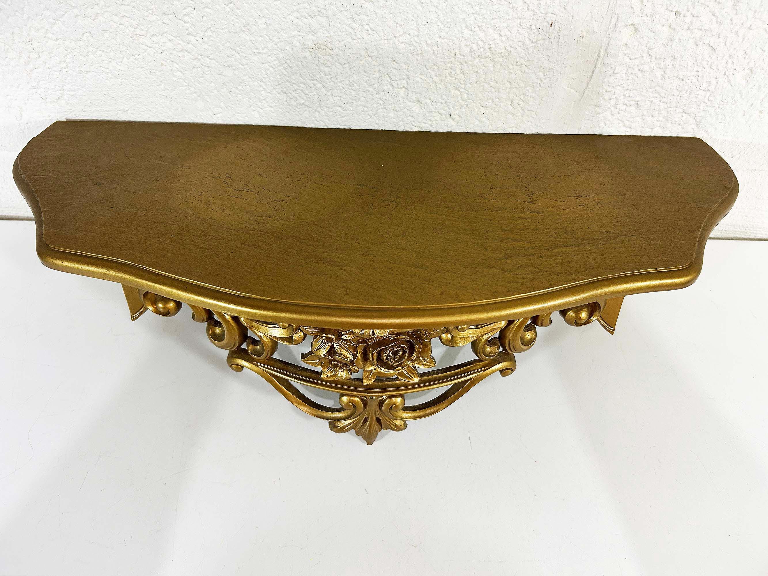 Super cool 1960s gold plastic ornate shelf. Great overall condition with a bit of discoloration where items were placed on it in the past. The shelf is approximately 6 1/2 inches tall, 19 inches wide and 8 inches deep.