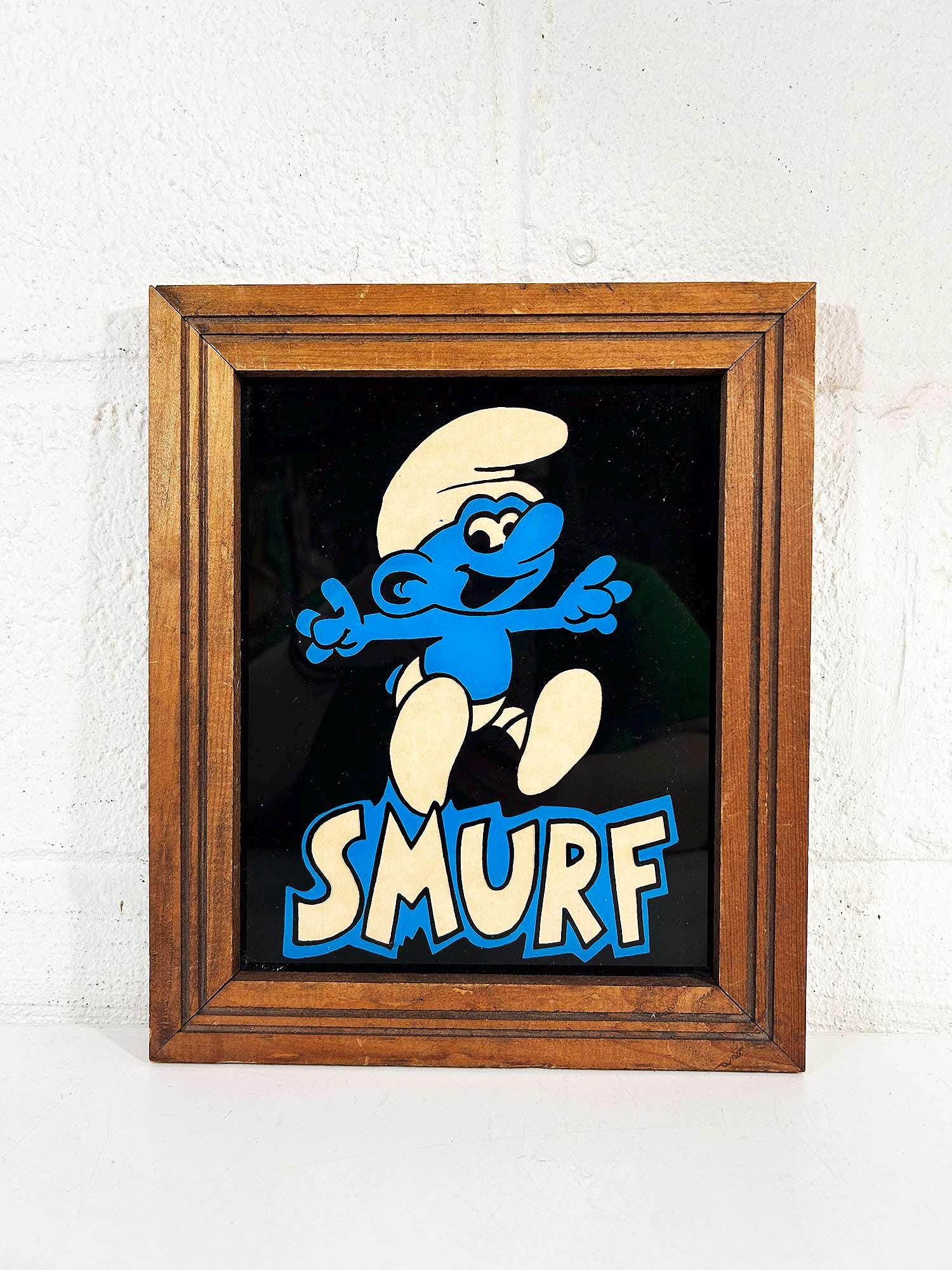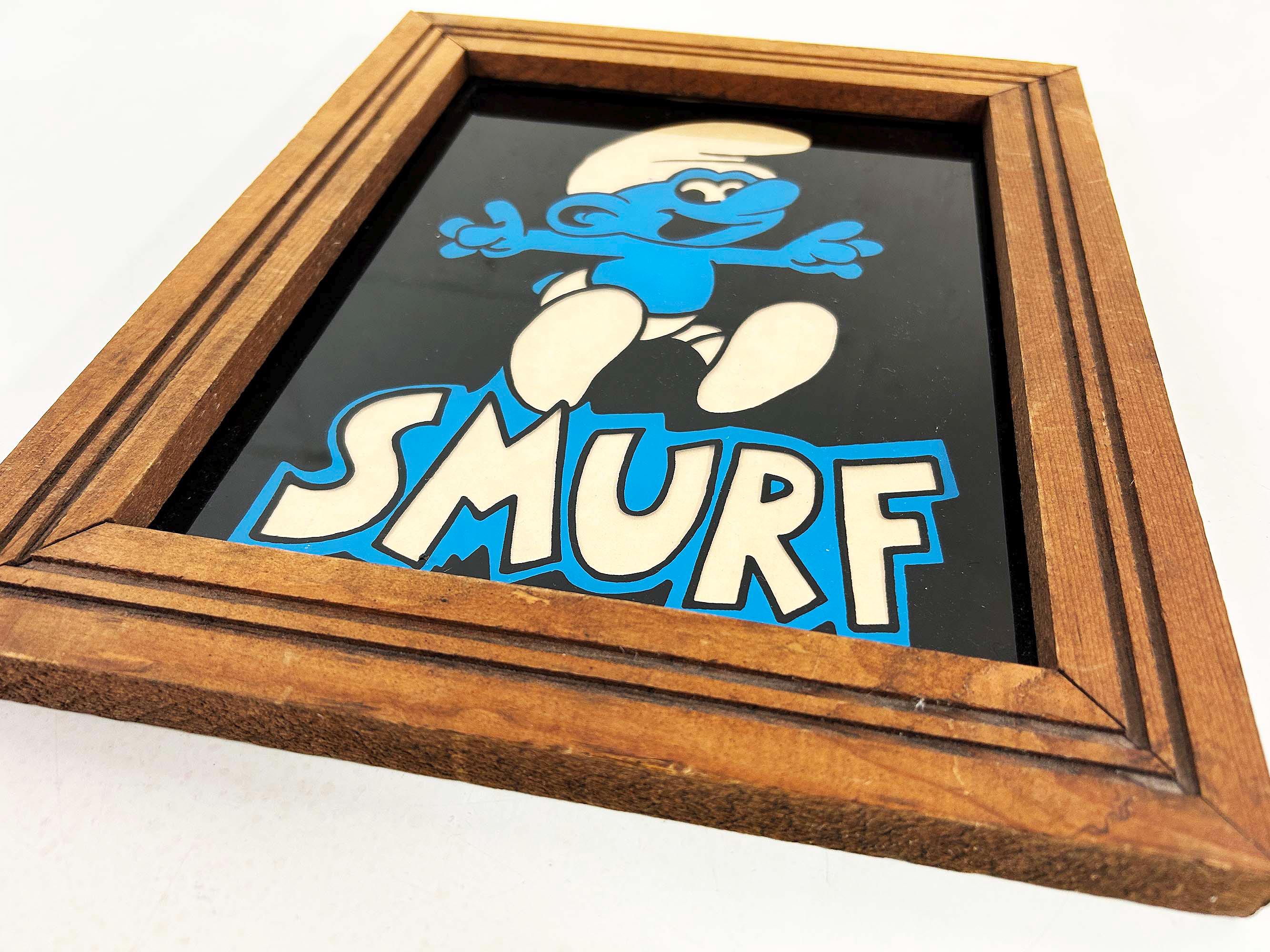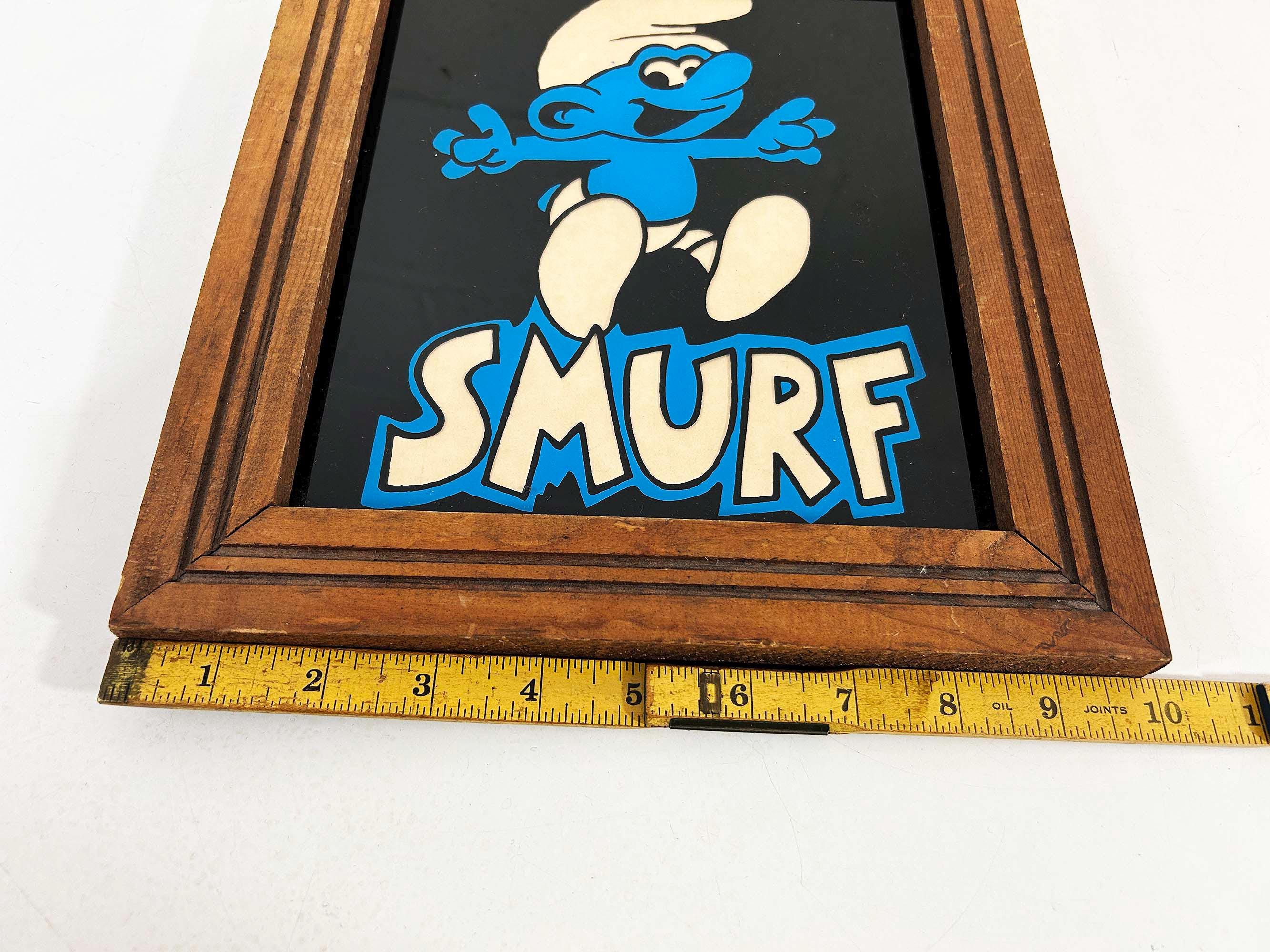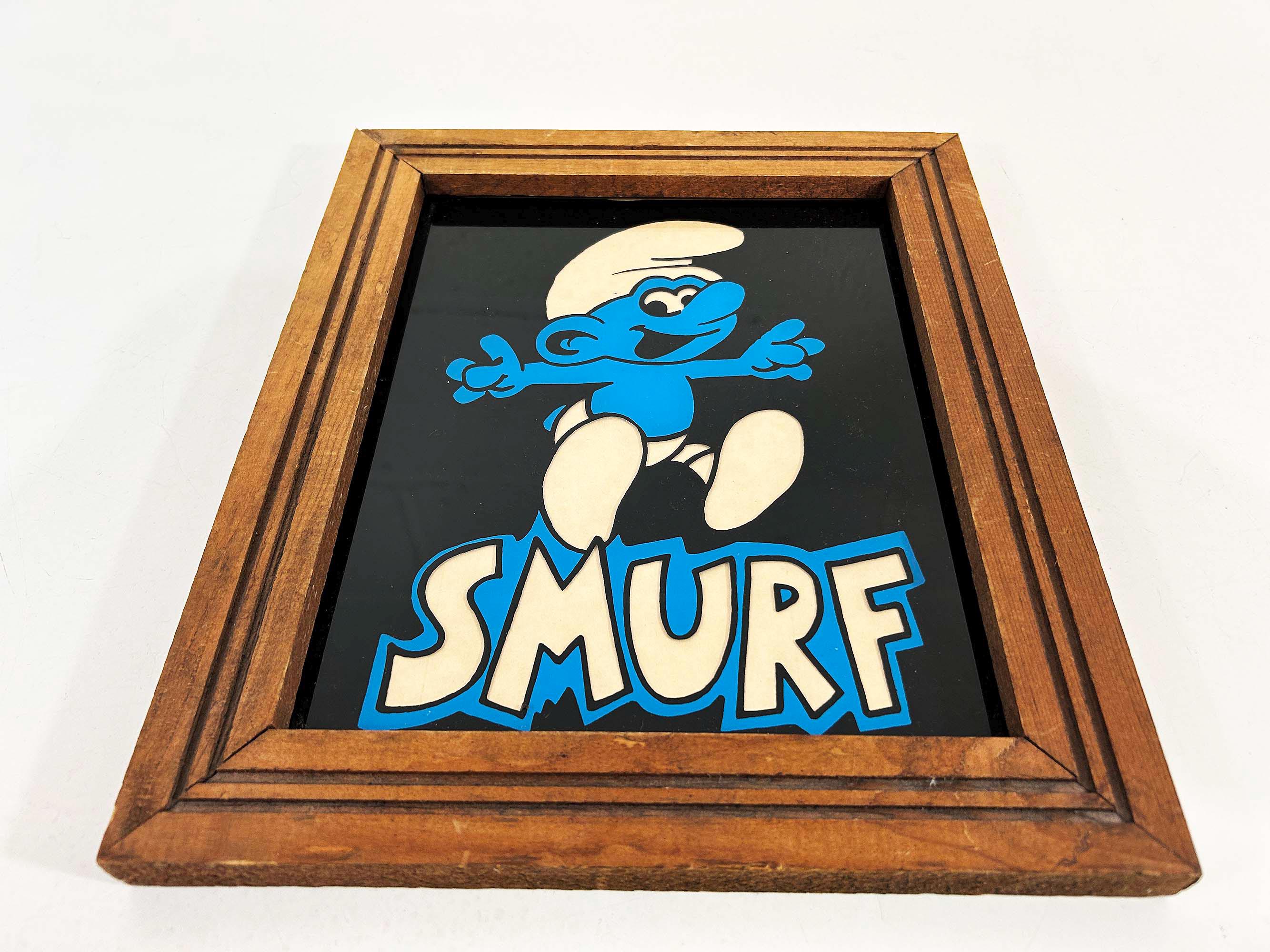 Super fun framed Smurfs carnival prize! This awesome framed piece is approximately 11 1/2 inches tall and 9 1/2 inches wide and is in good vintage condition. It doesn't have a wire for hanging, but you can purchase a kit at a craft or frame store. It would look so great on a gallery wall!