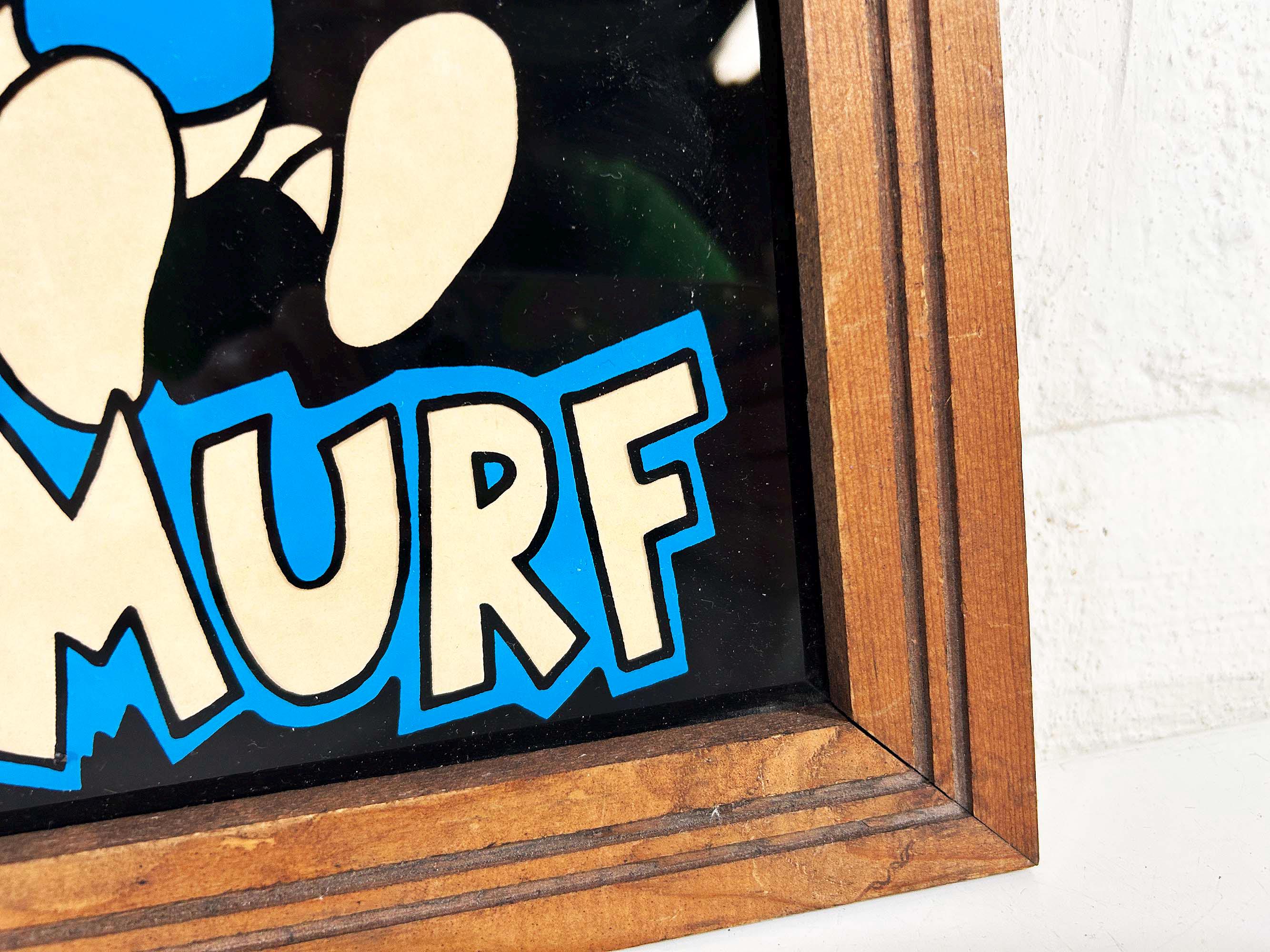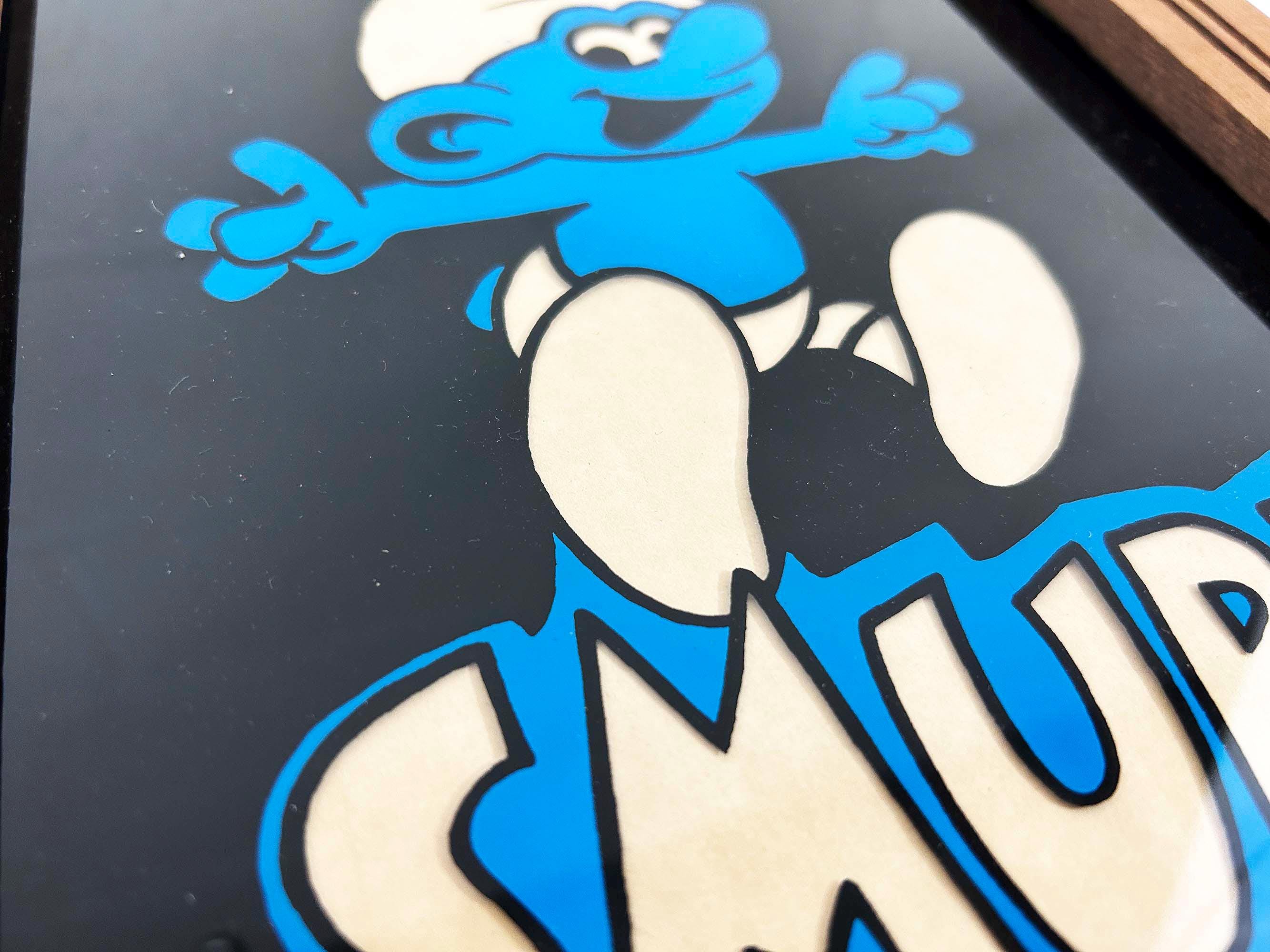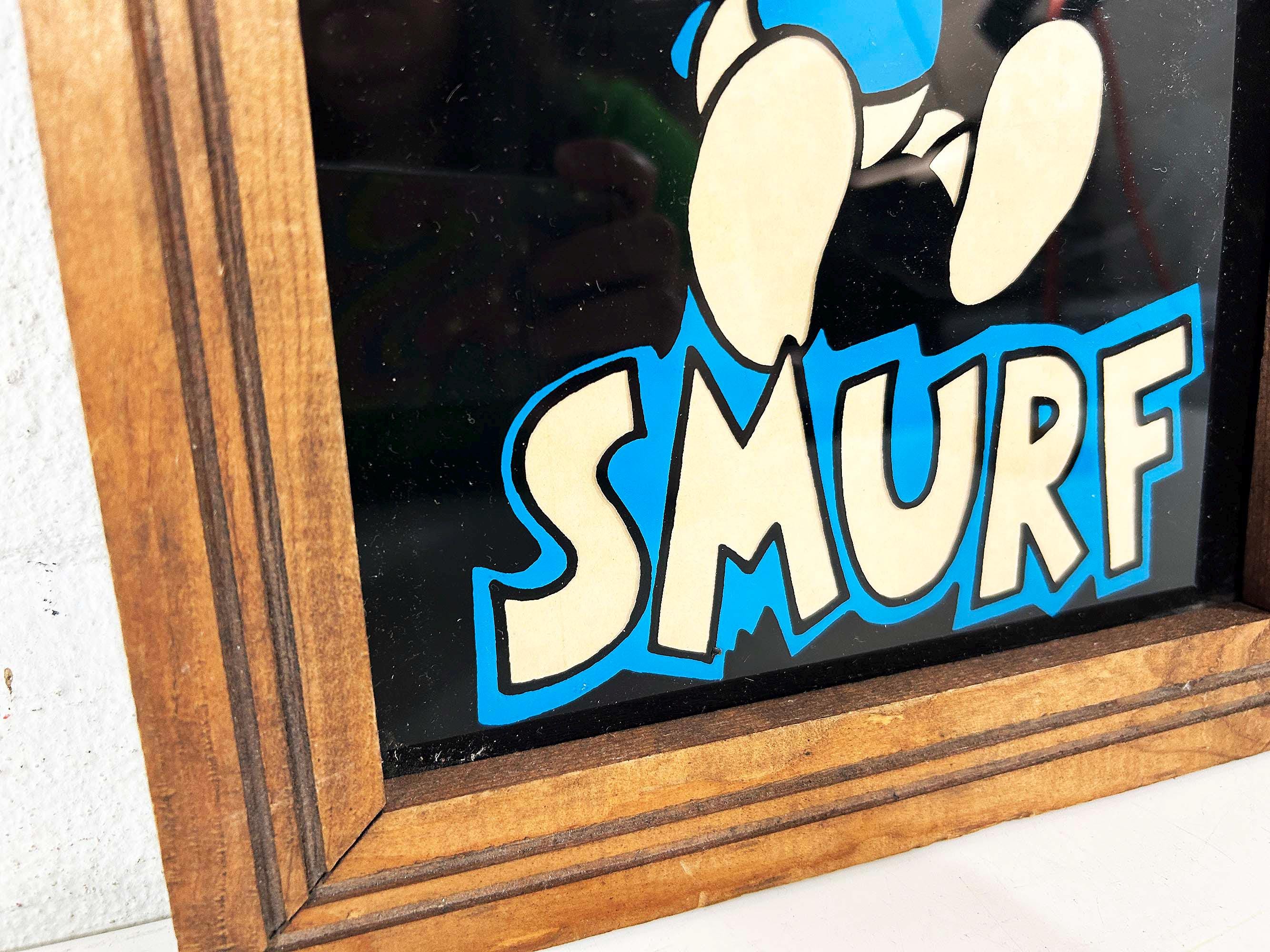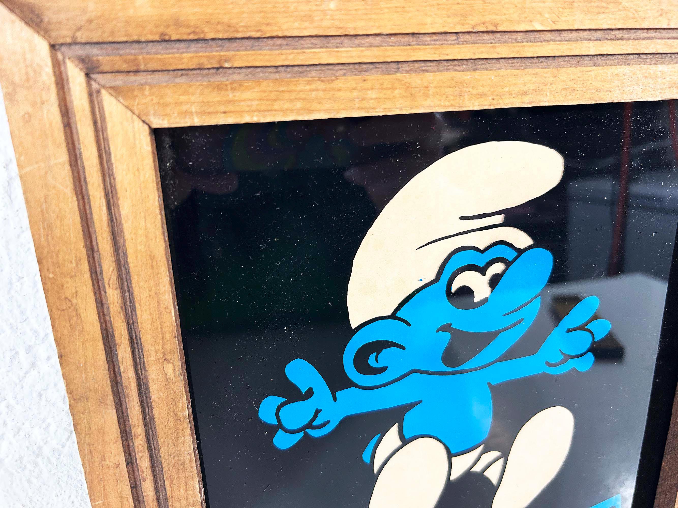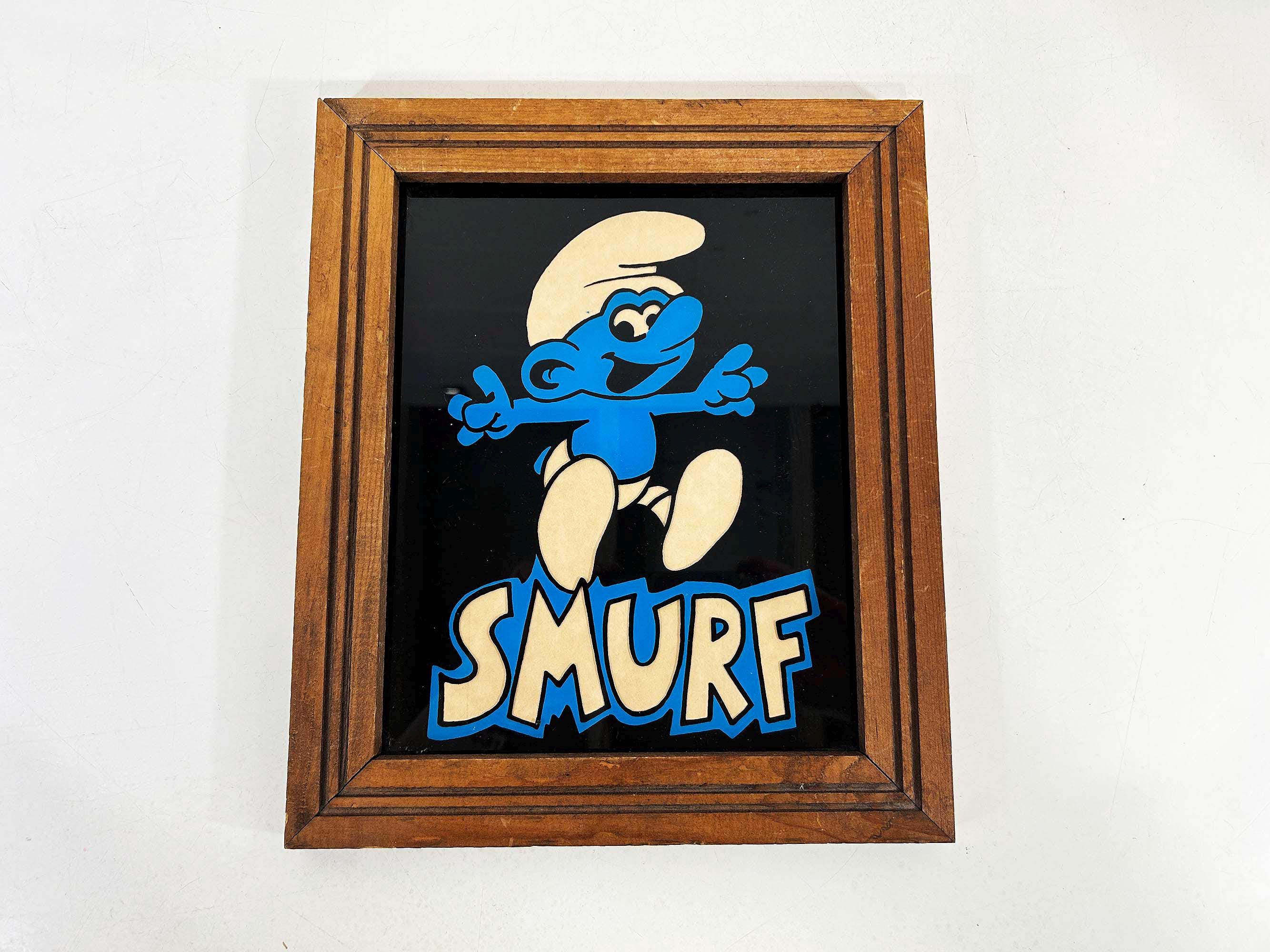 Super fun framed Smurfs carnival prize! This awesome framed piece is approximately 11 1/2 inches tall and 9 1/2 inches wide and is in good vintage condition. It doesn't have a wire for hanging, but you can purchase a kit at a craft or frame store. It would look so great on a gallery wall!
