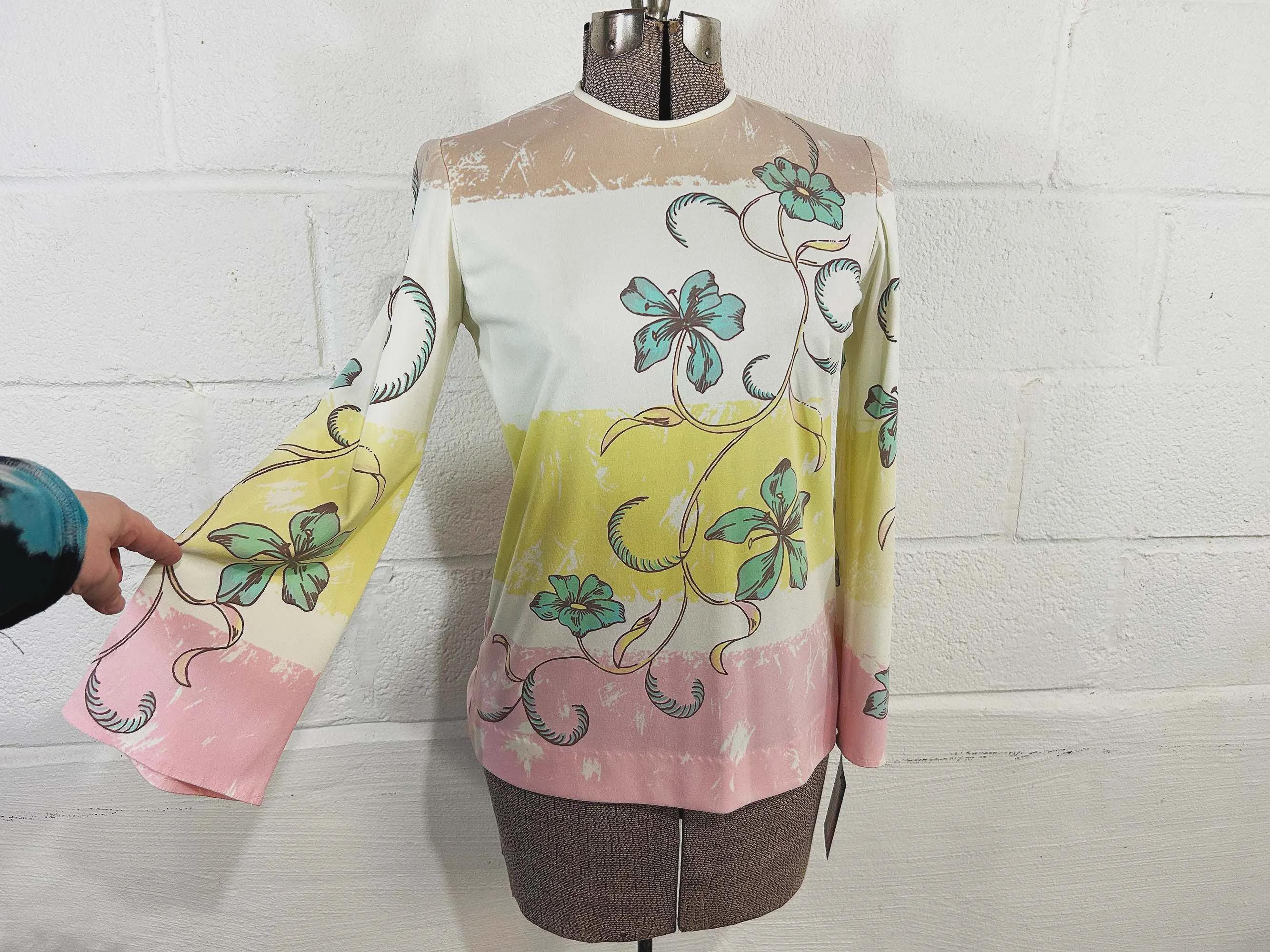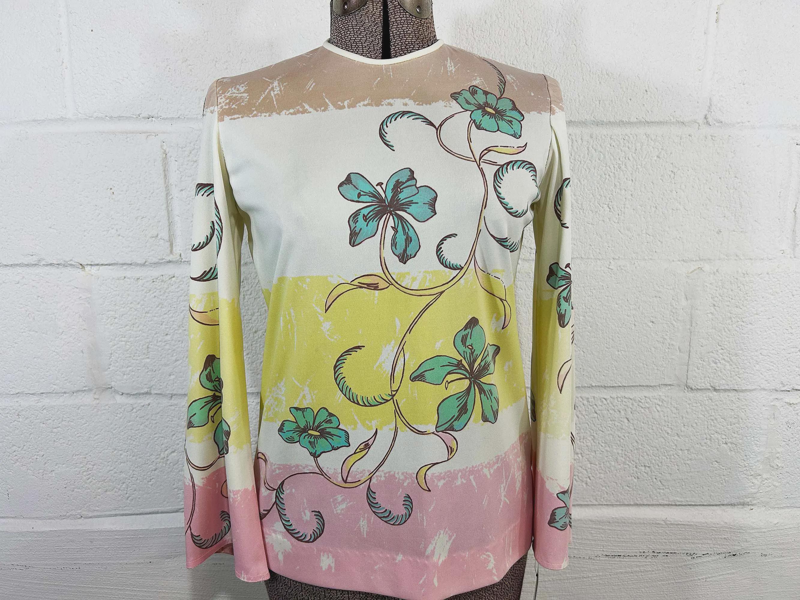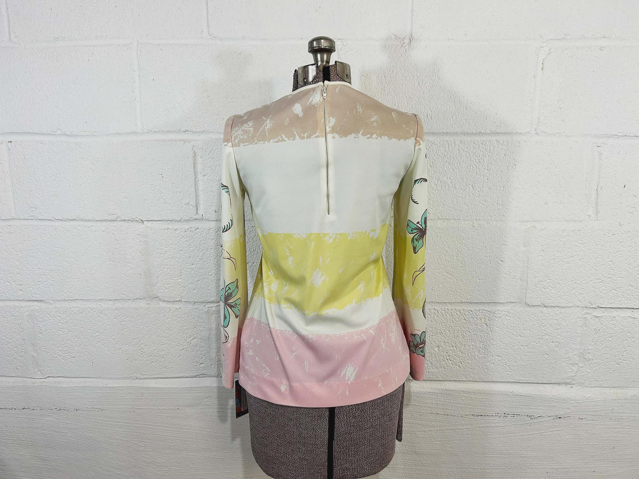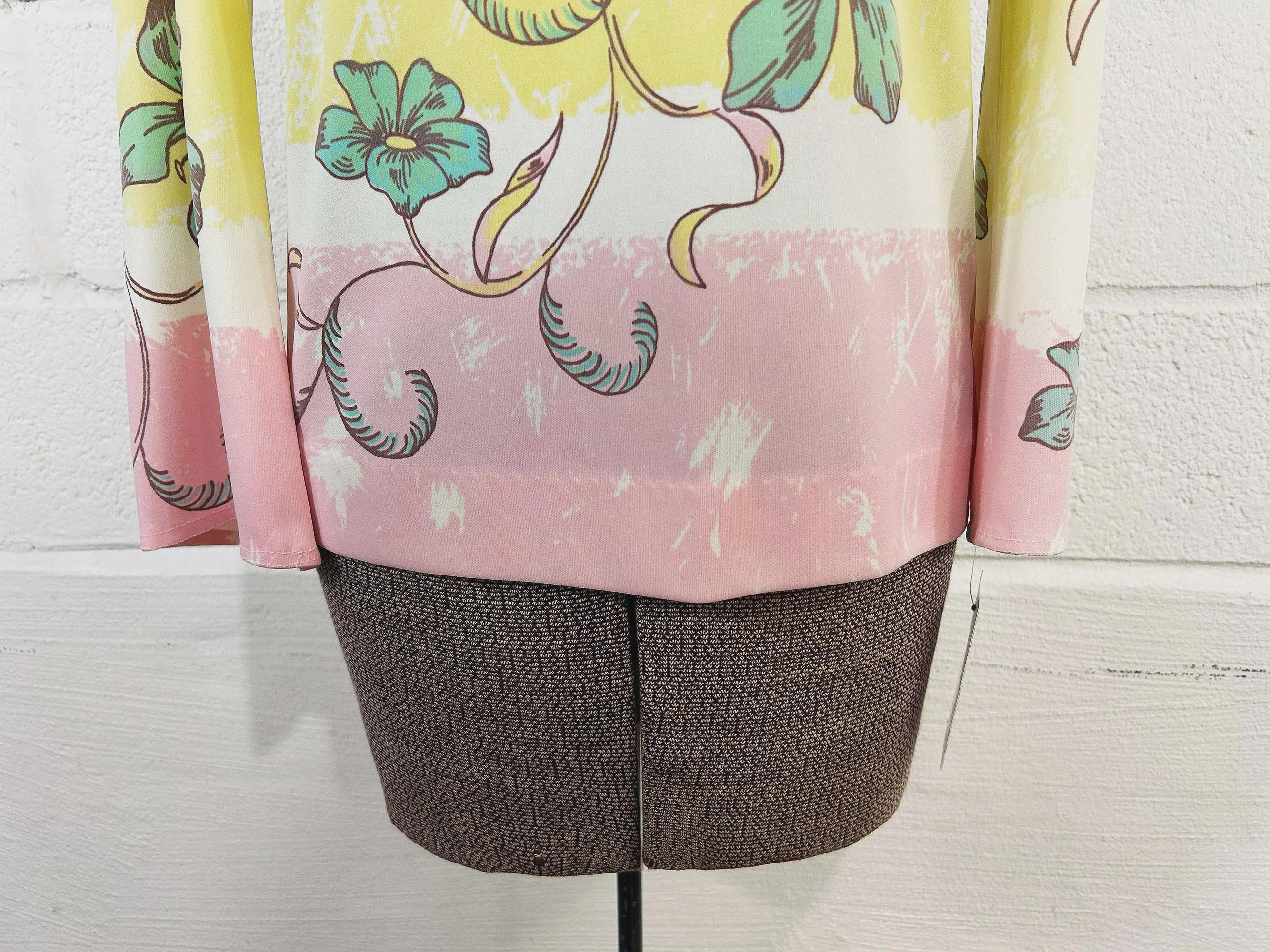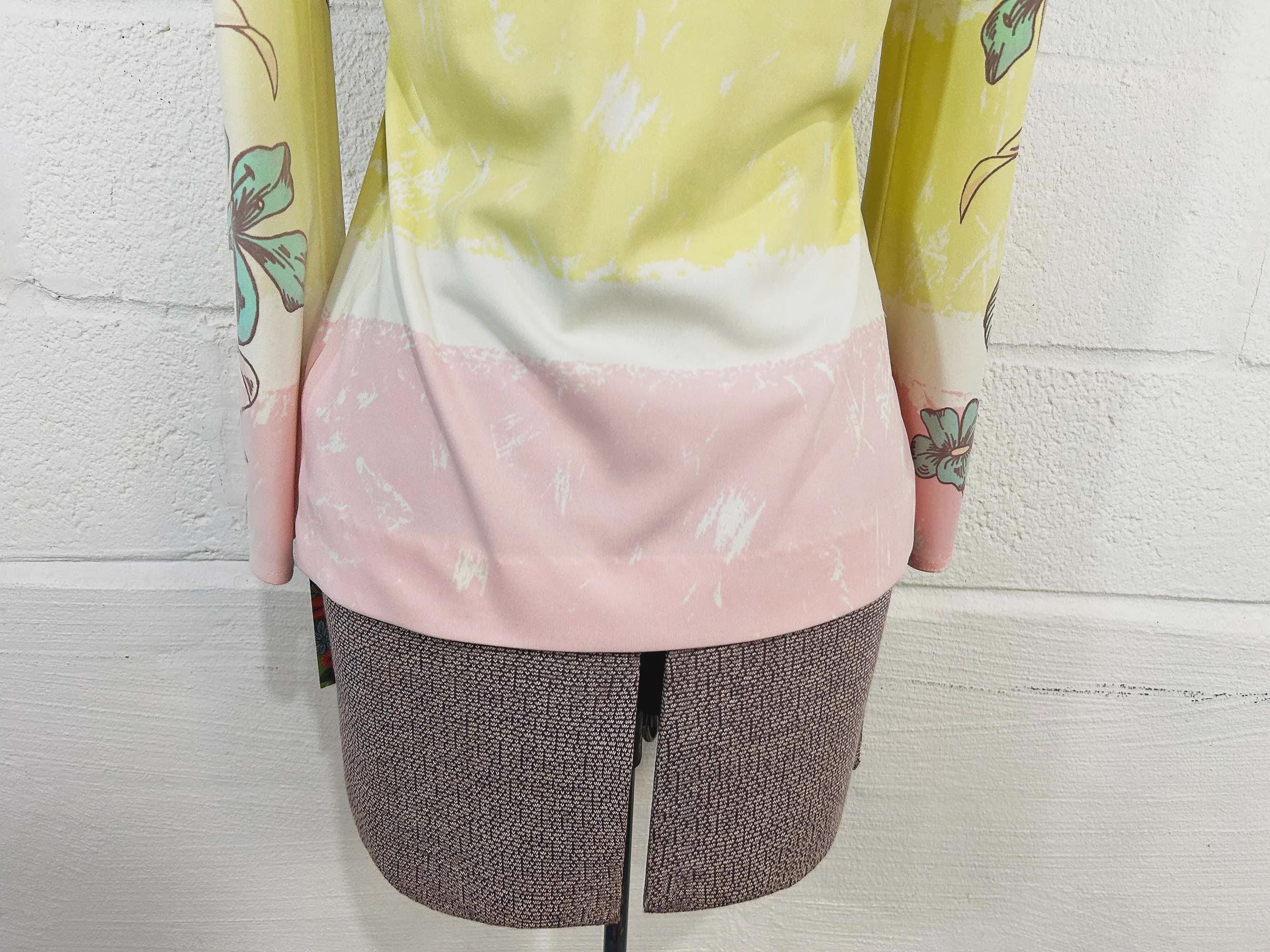 Lovely colorful floral long sleeve top. Crew neck with a zipper at the back of the neck. The fabric has stretch. Top is in good condition with a few snags and some pulling at the seams - please be sure to inspect all photos.