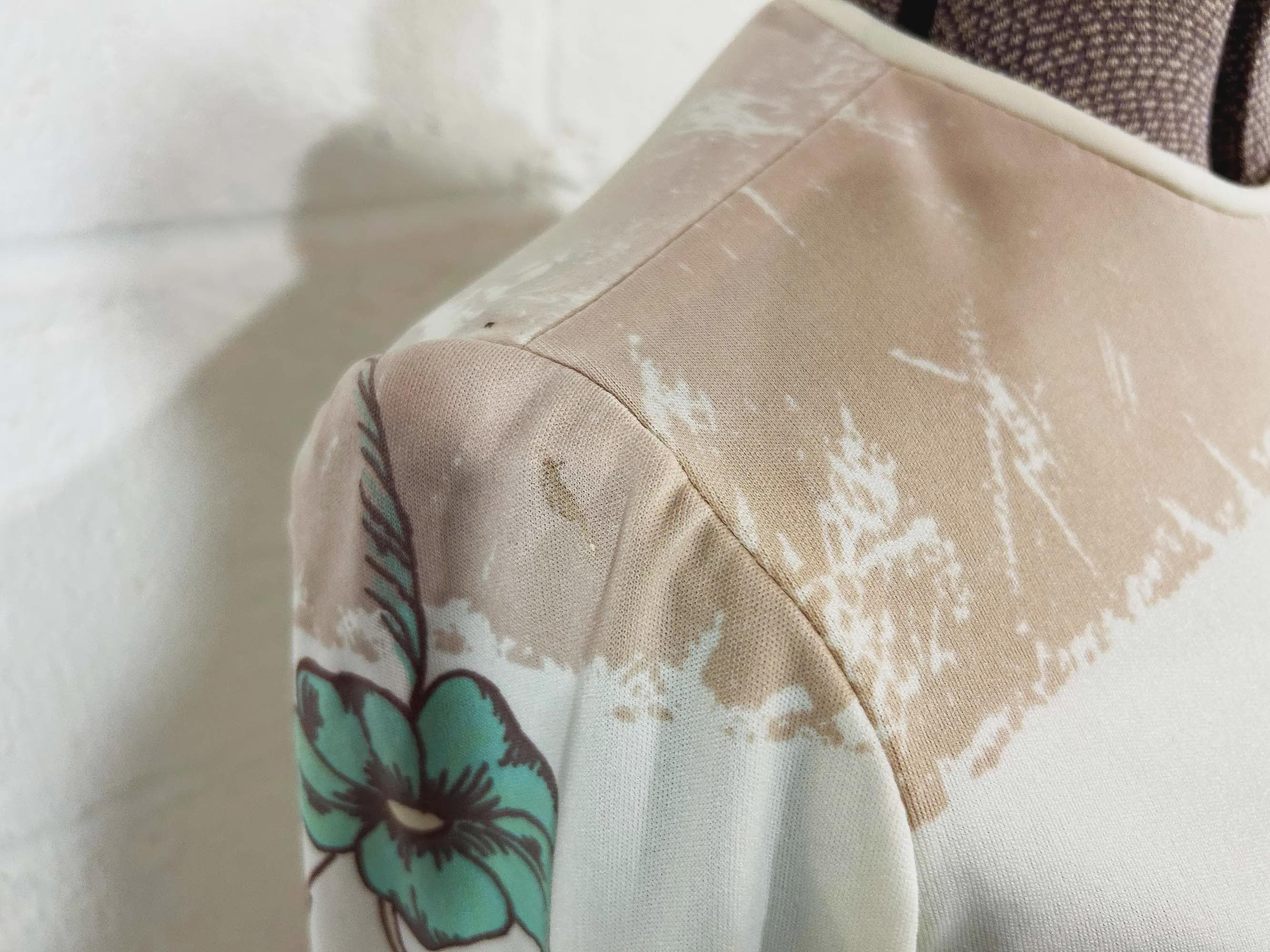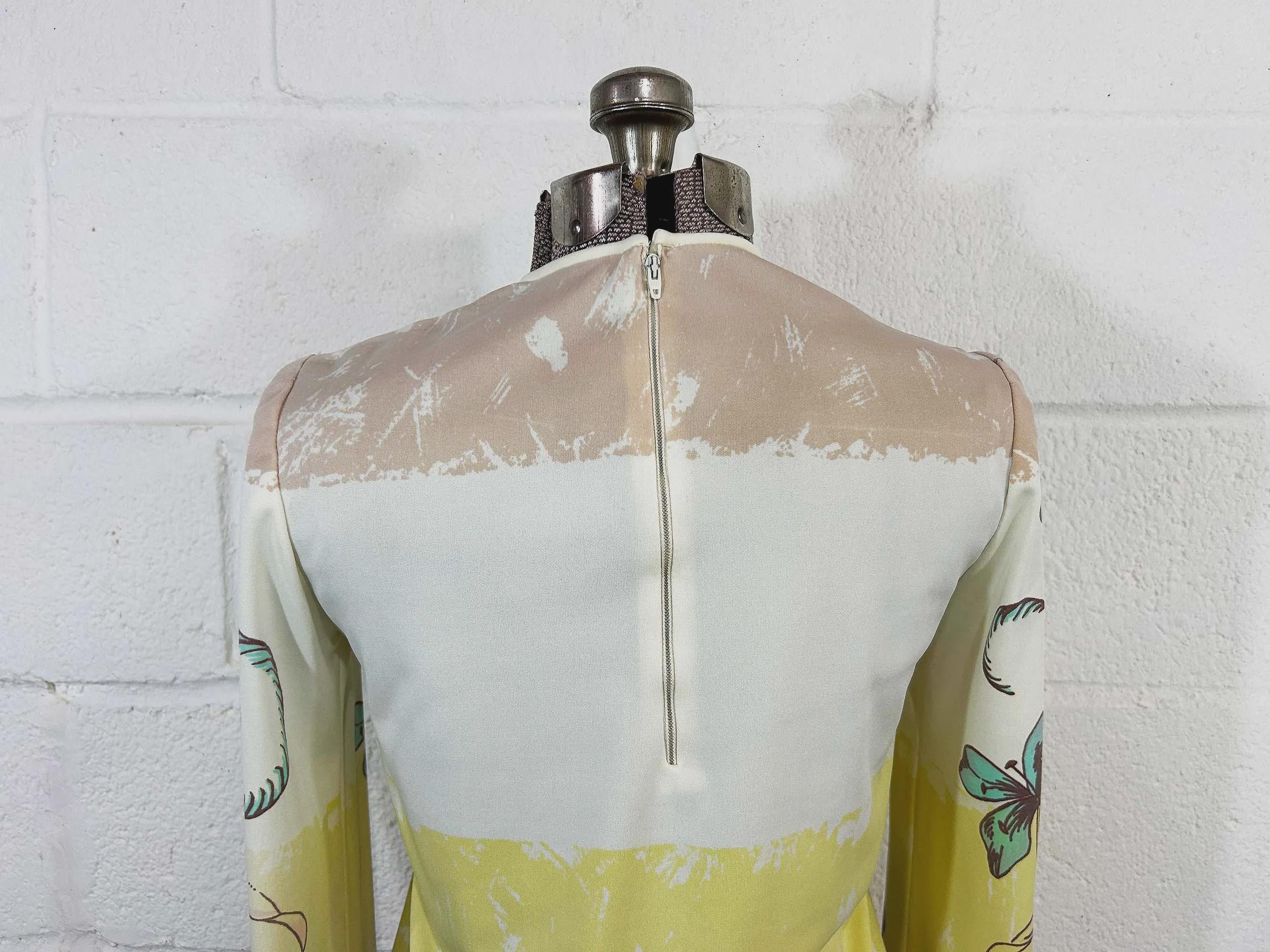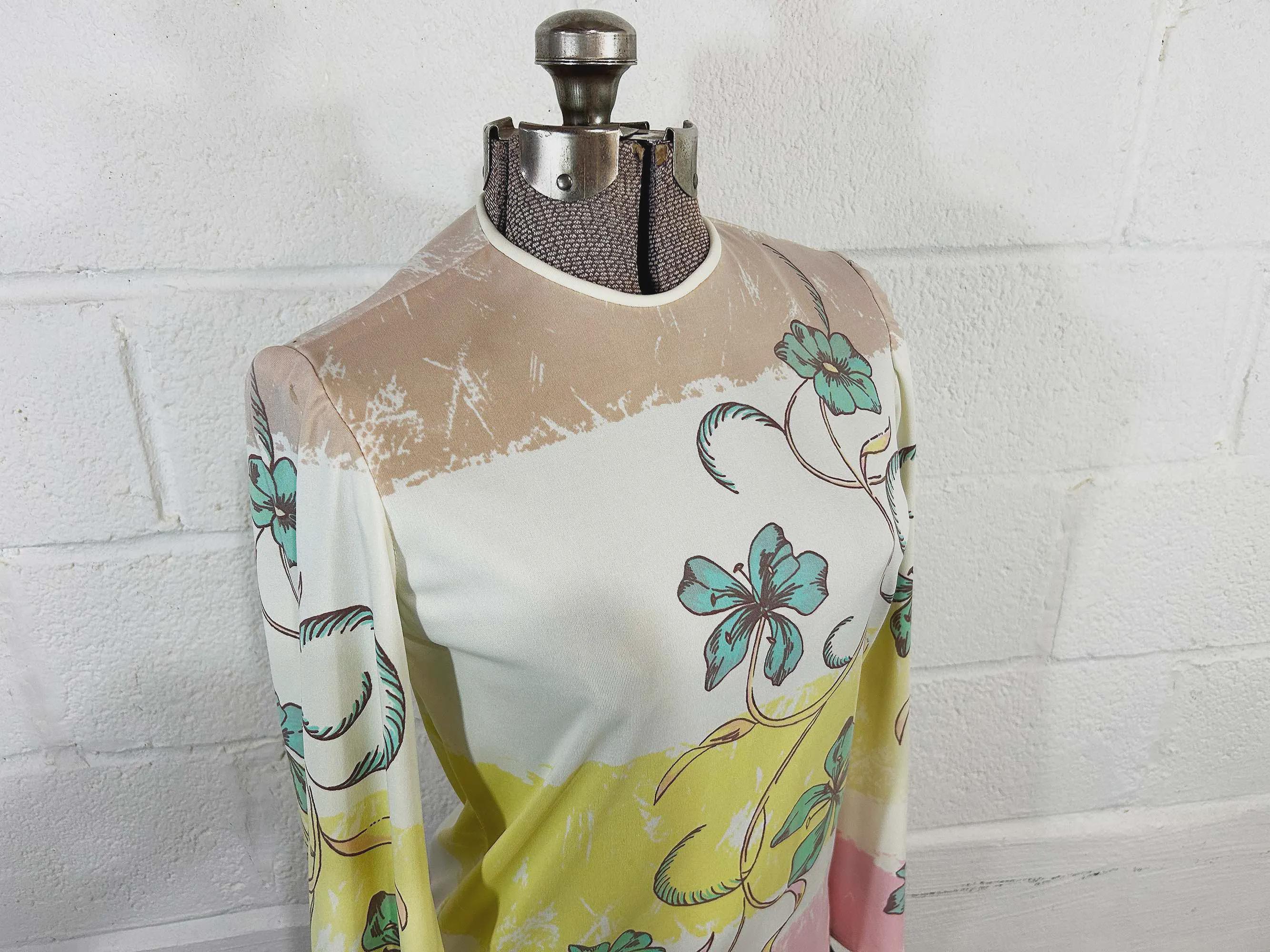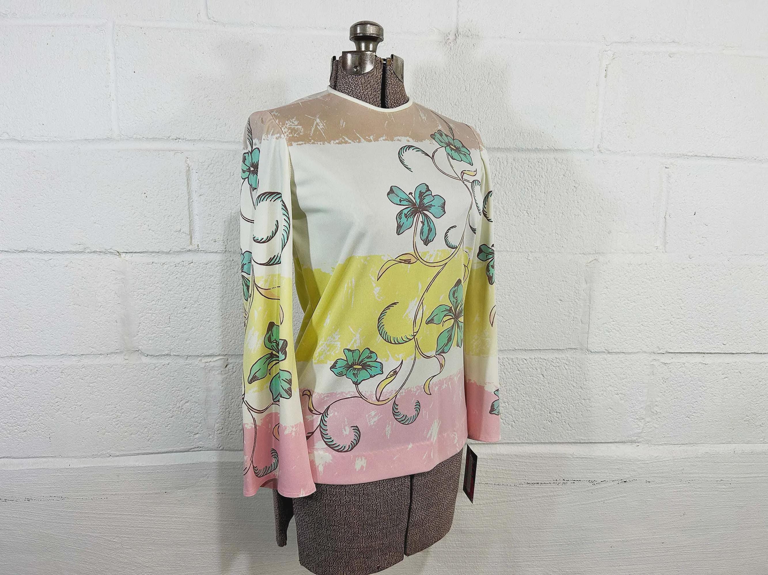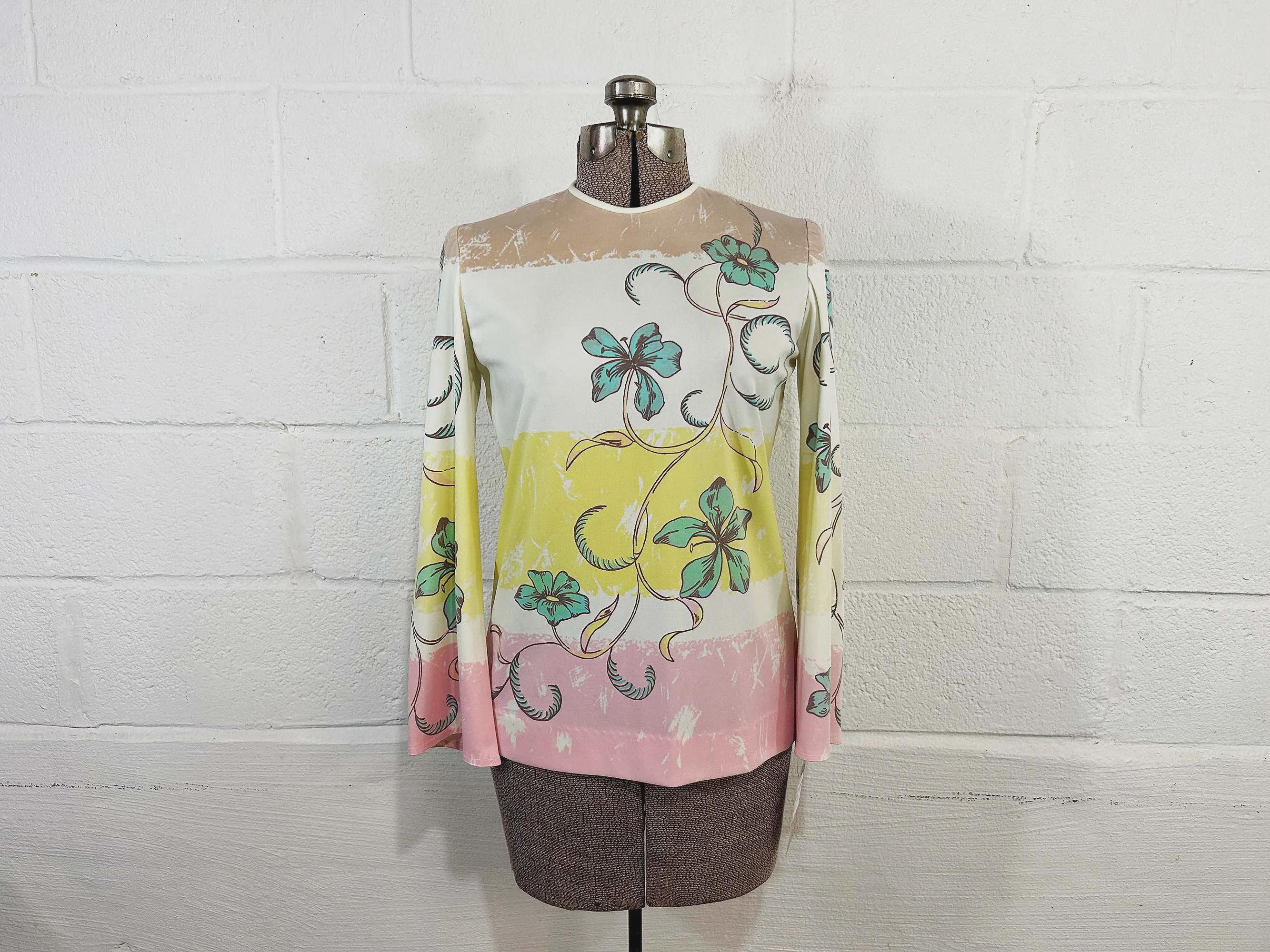 Lovely colorful floral long sleeve top. Crew neck with a zipper at the back of the neck. The fabric has stretch. Top is in good condition with a few snags and some pulling at the seams - please be sure to inspect all photos.