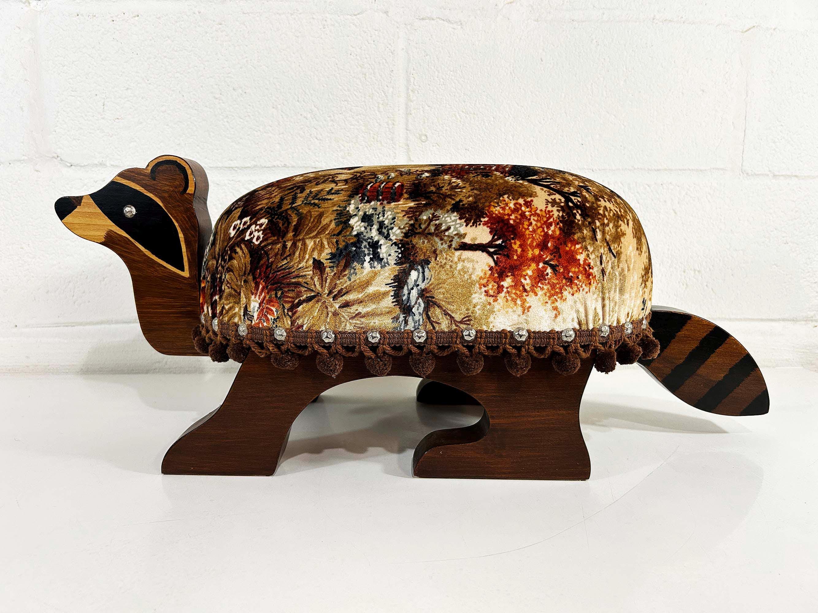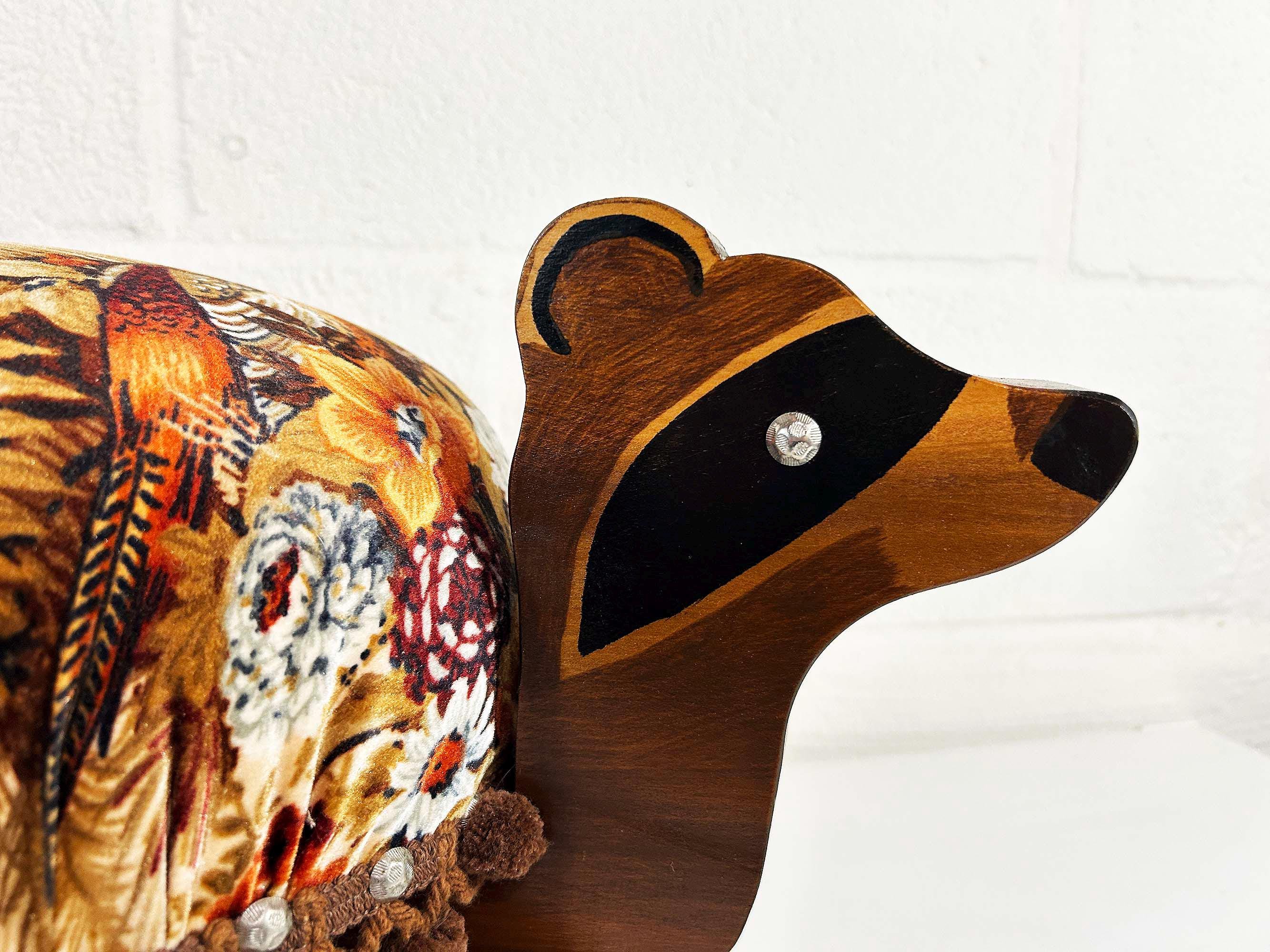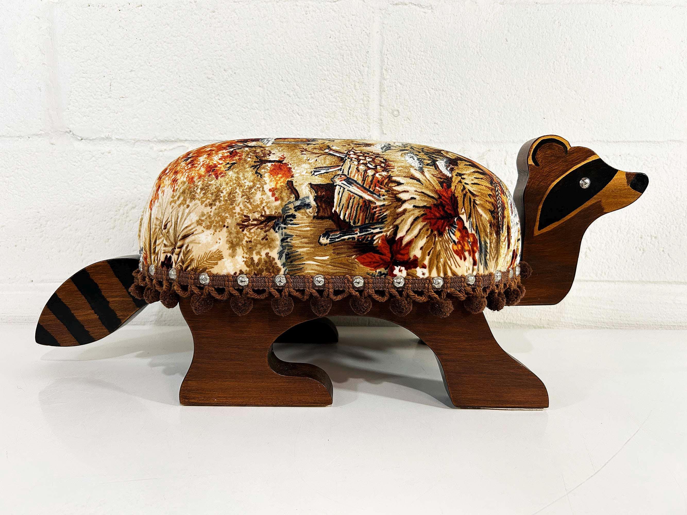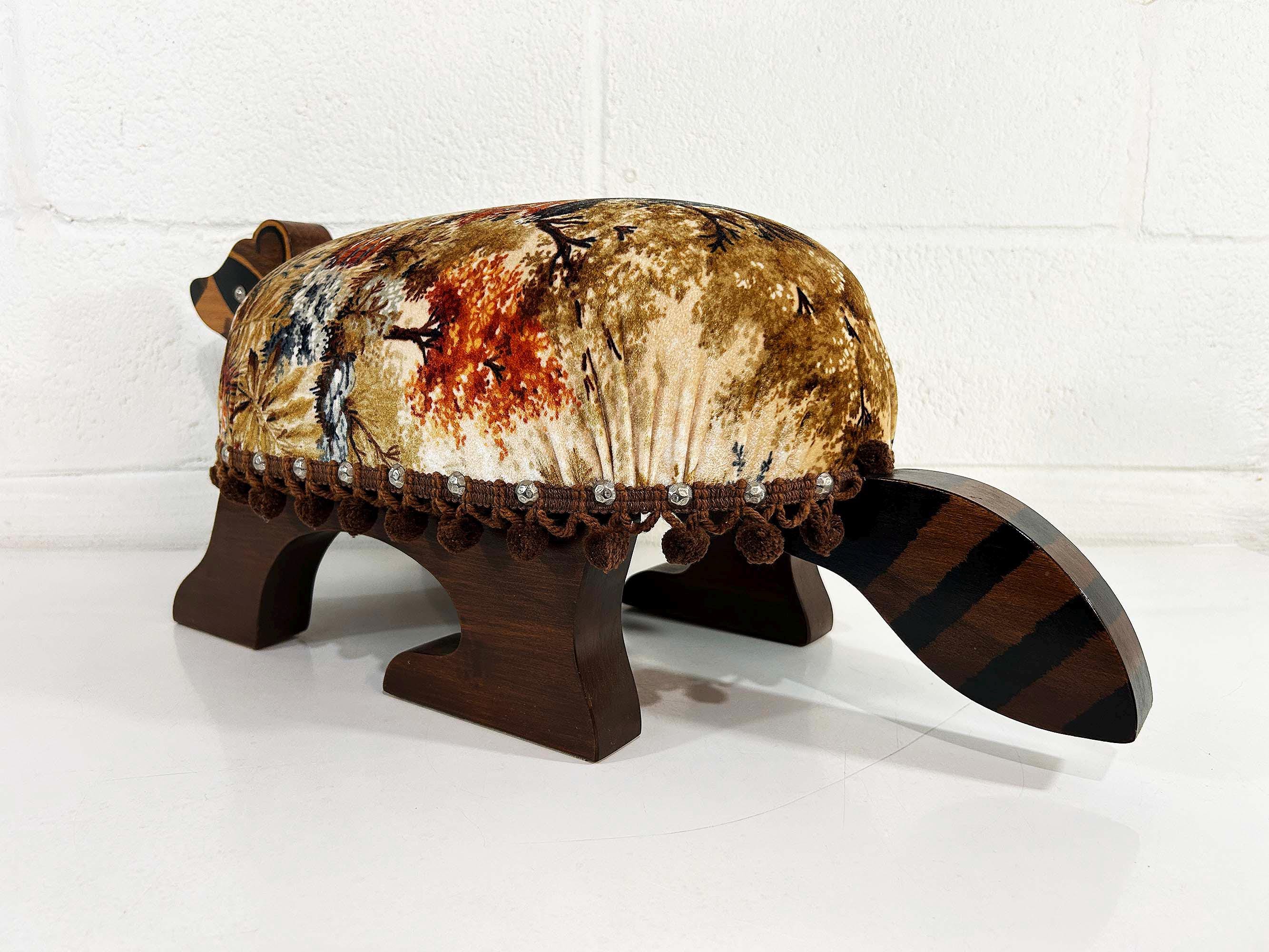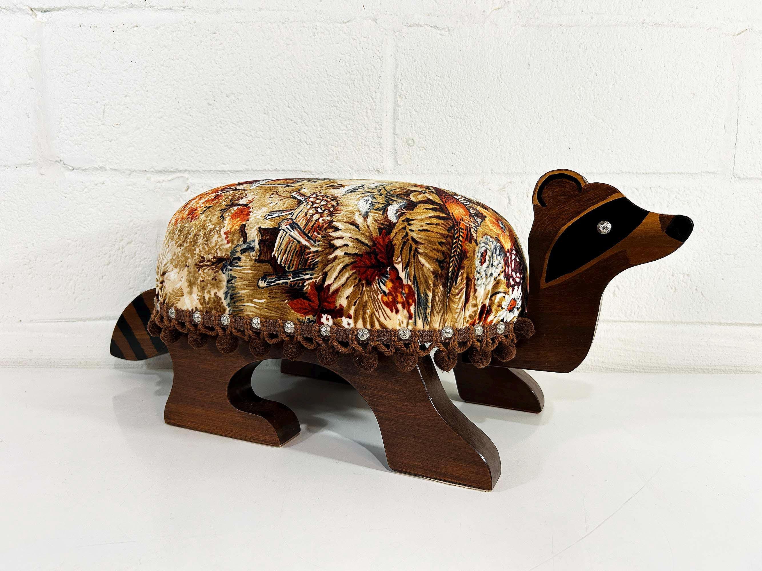 The cutest little raccoon footstool from the 1970s! I believe this is handmade but it was done so well! It feels sturdy and solid. Cute velvet fabric with little pom pom trim. It is in excellent vintage condition with no significant flaws The stool is approximately 10 1/2 inches tall, 26 inches wide, and 9 1/2 inches deep.