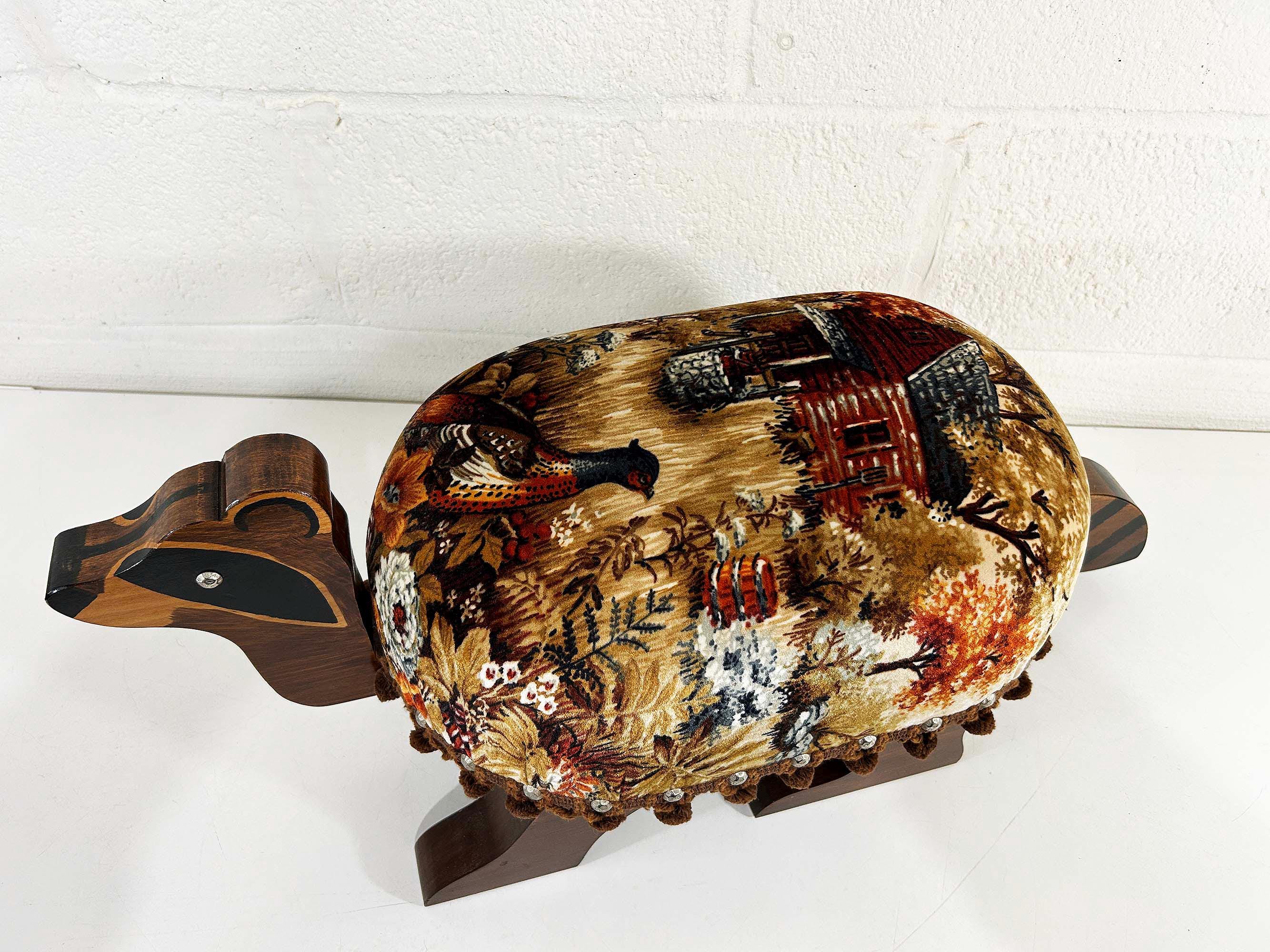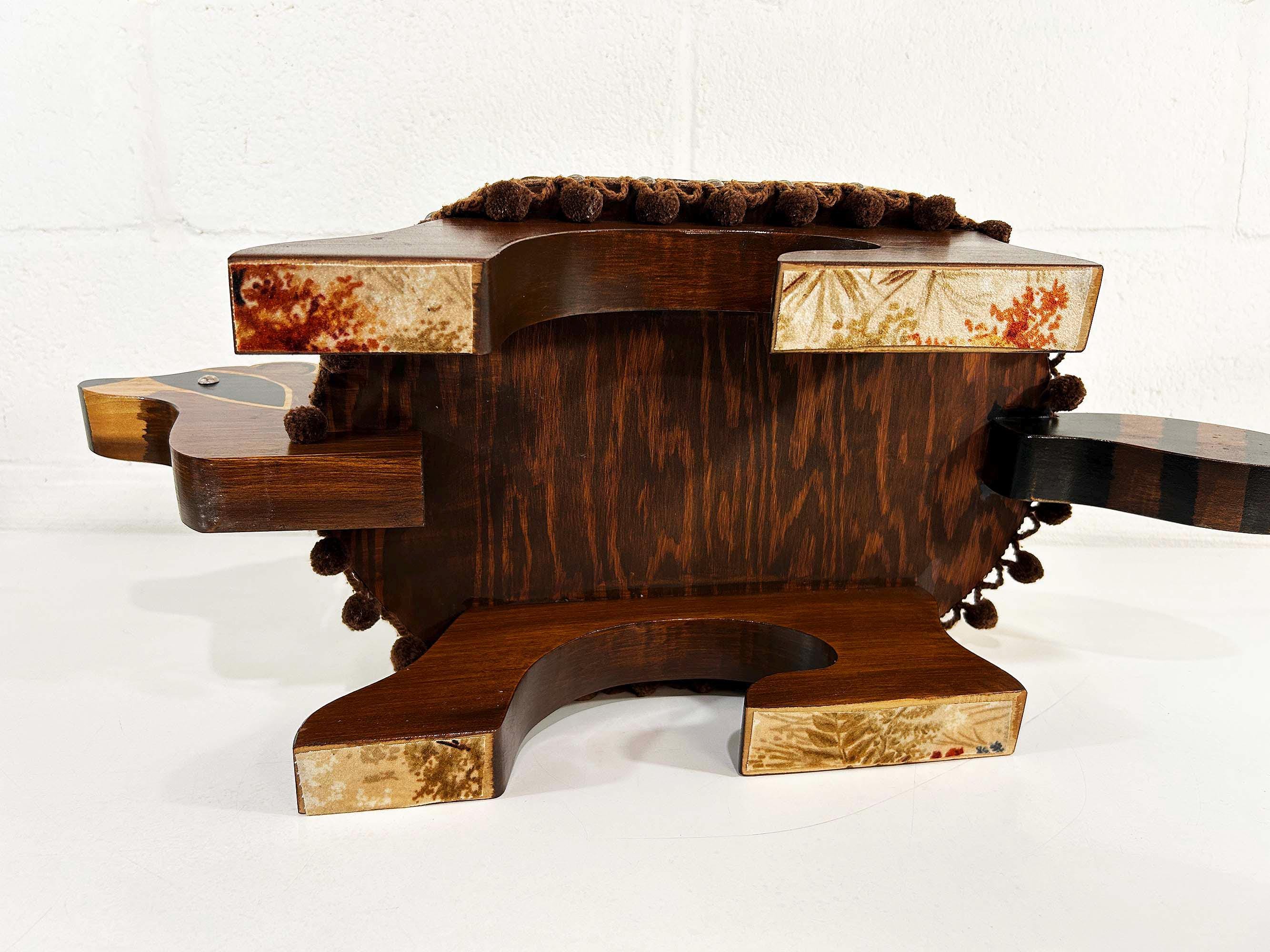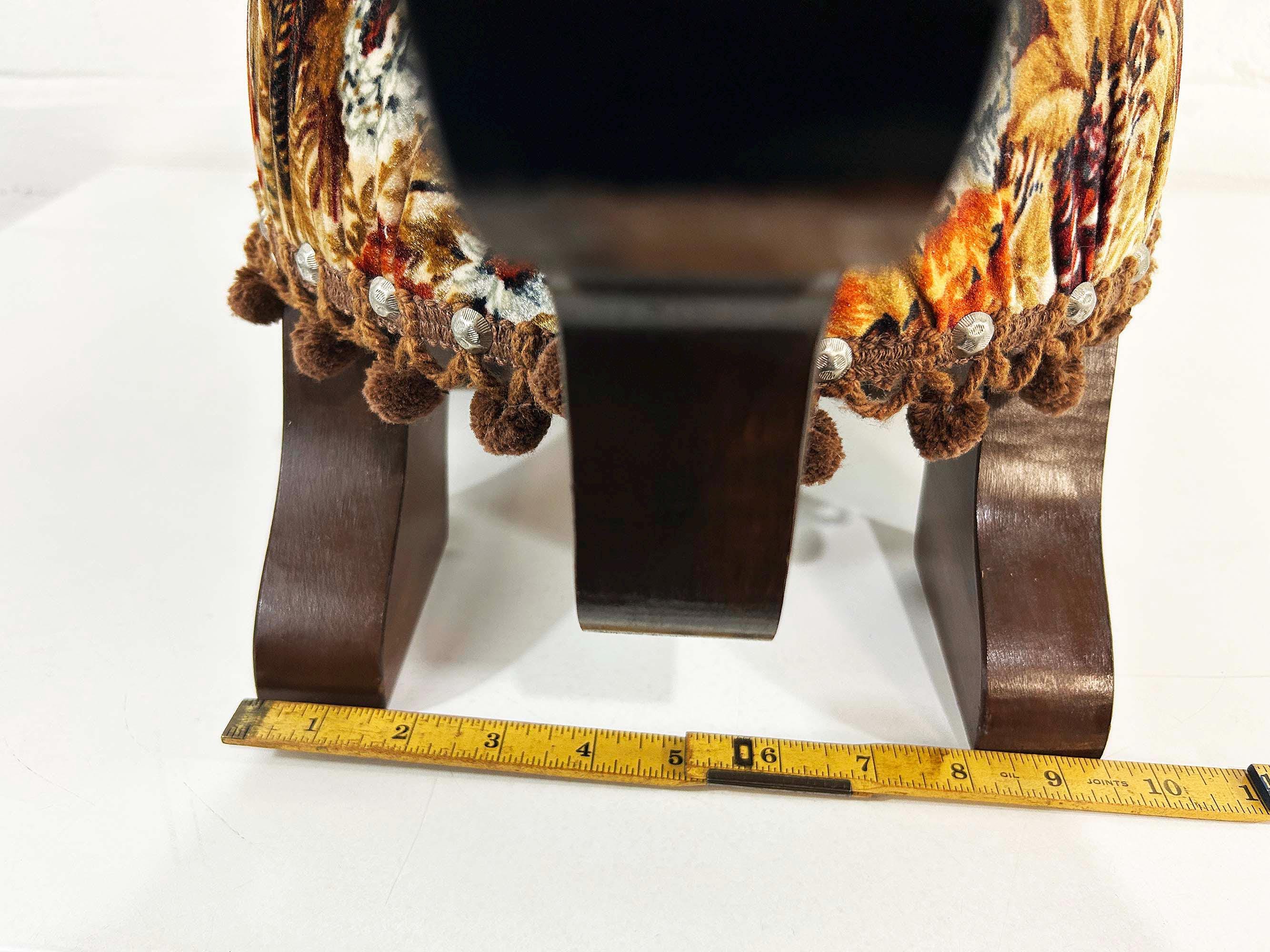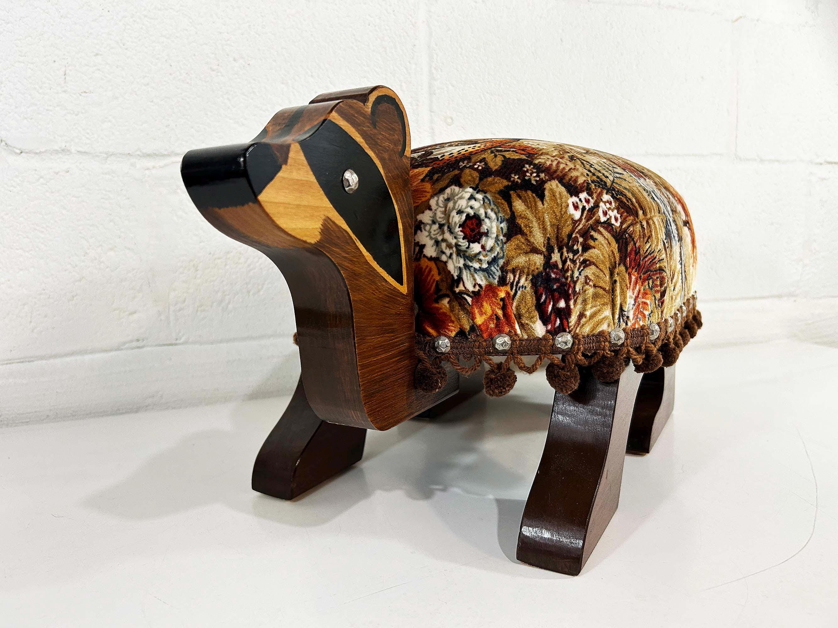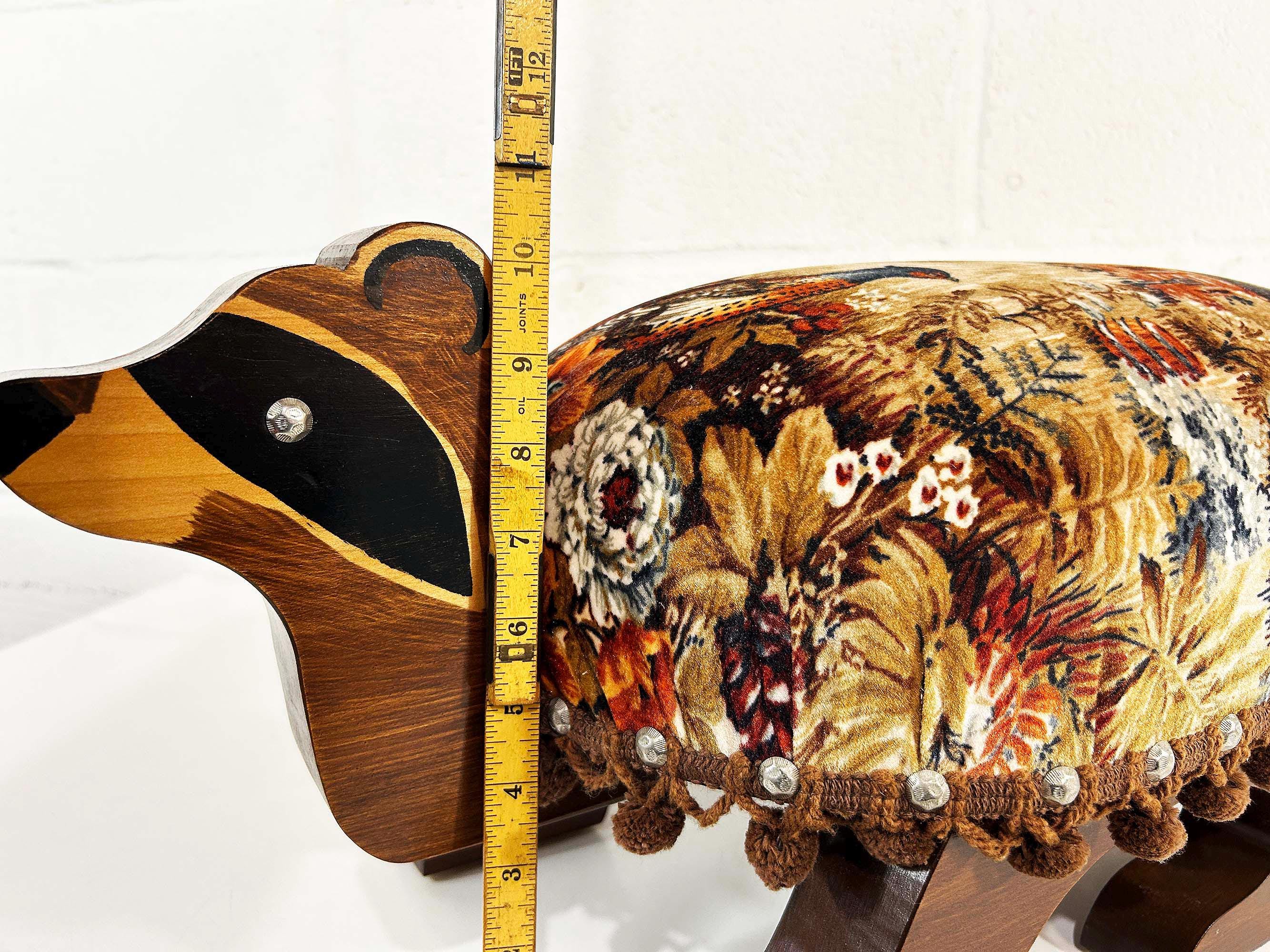 The cutest little raccoon footstool from the 1970s! I believe this is handmade but it was done so well! It feels sturdy and solid. Cute velvet fabric with little pom pom trim. It is in excellent vintage condition with no significant flaws The stool is approximately 10 1/2 inches tall, 26 inches wide, and 9 1/2 inches deep.