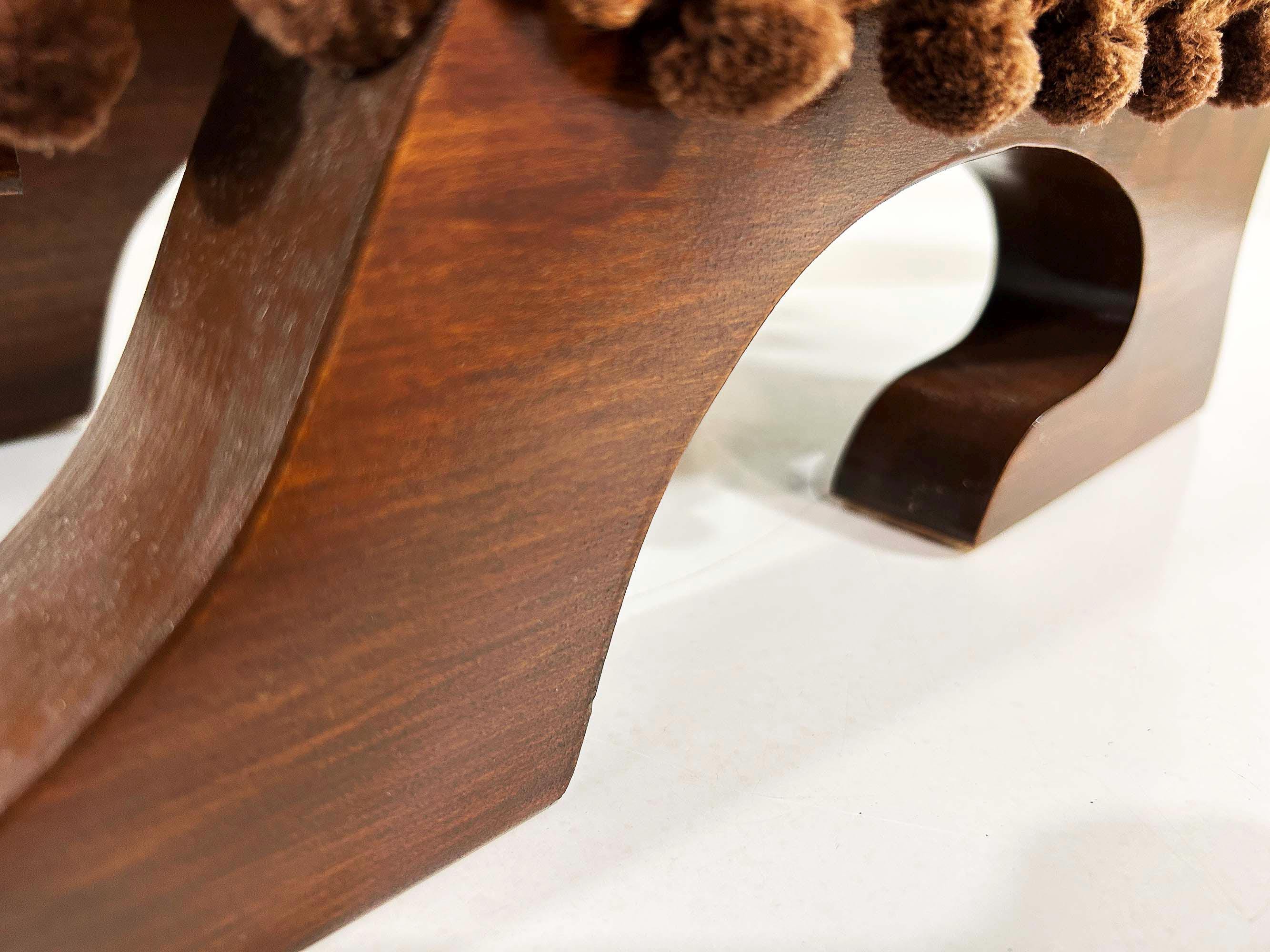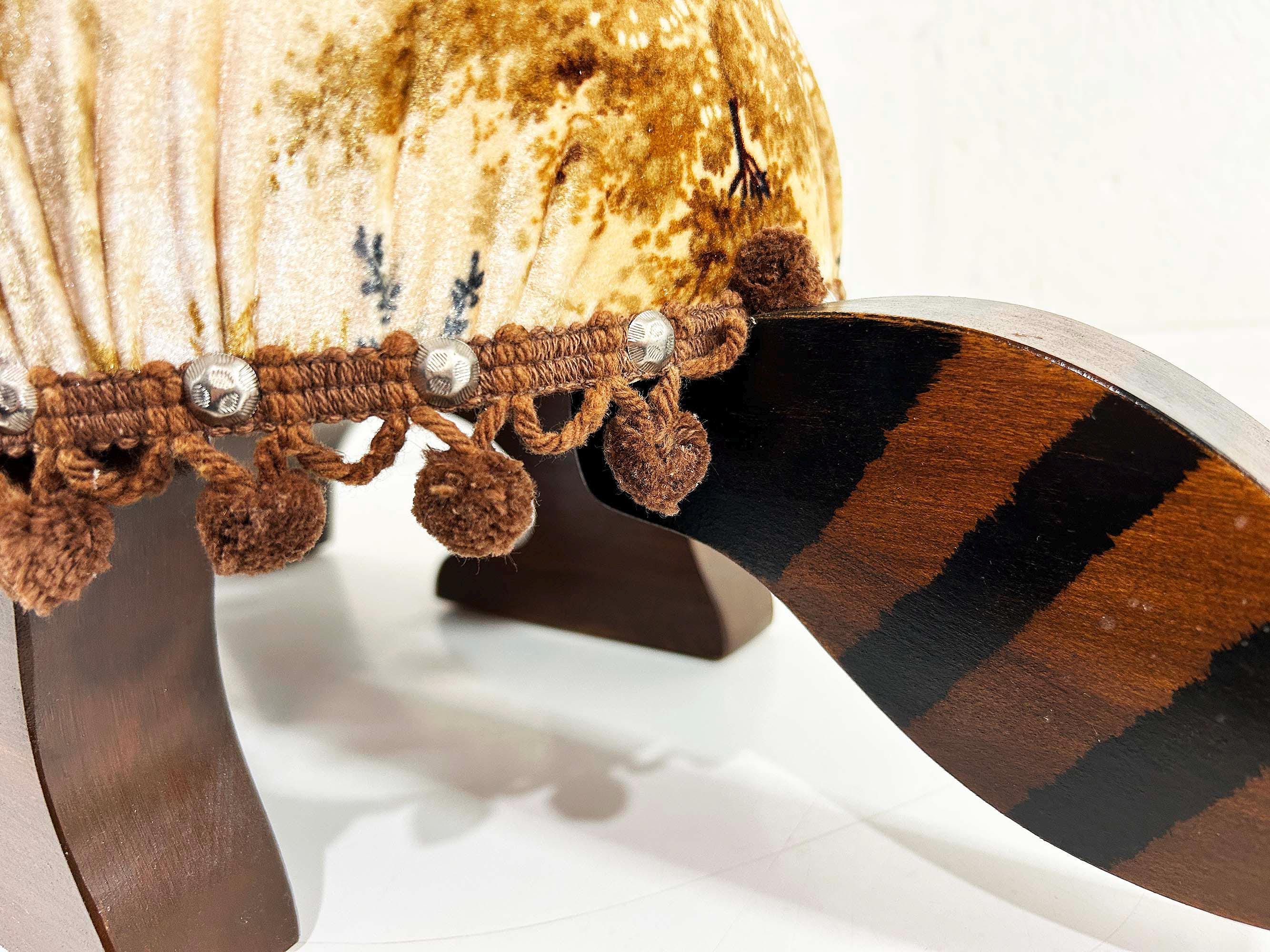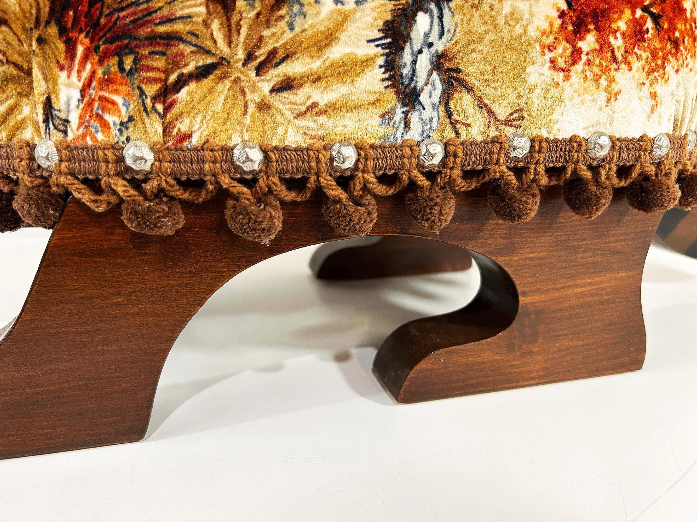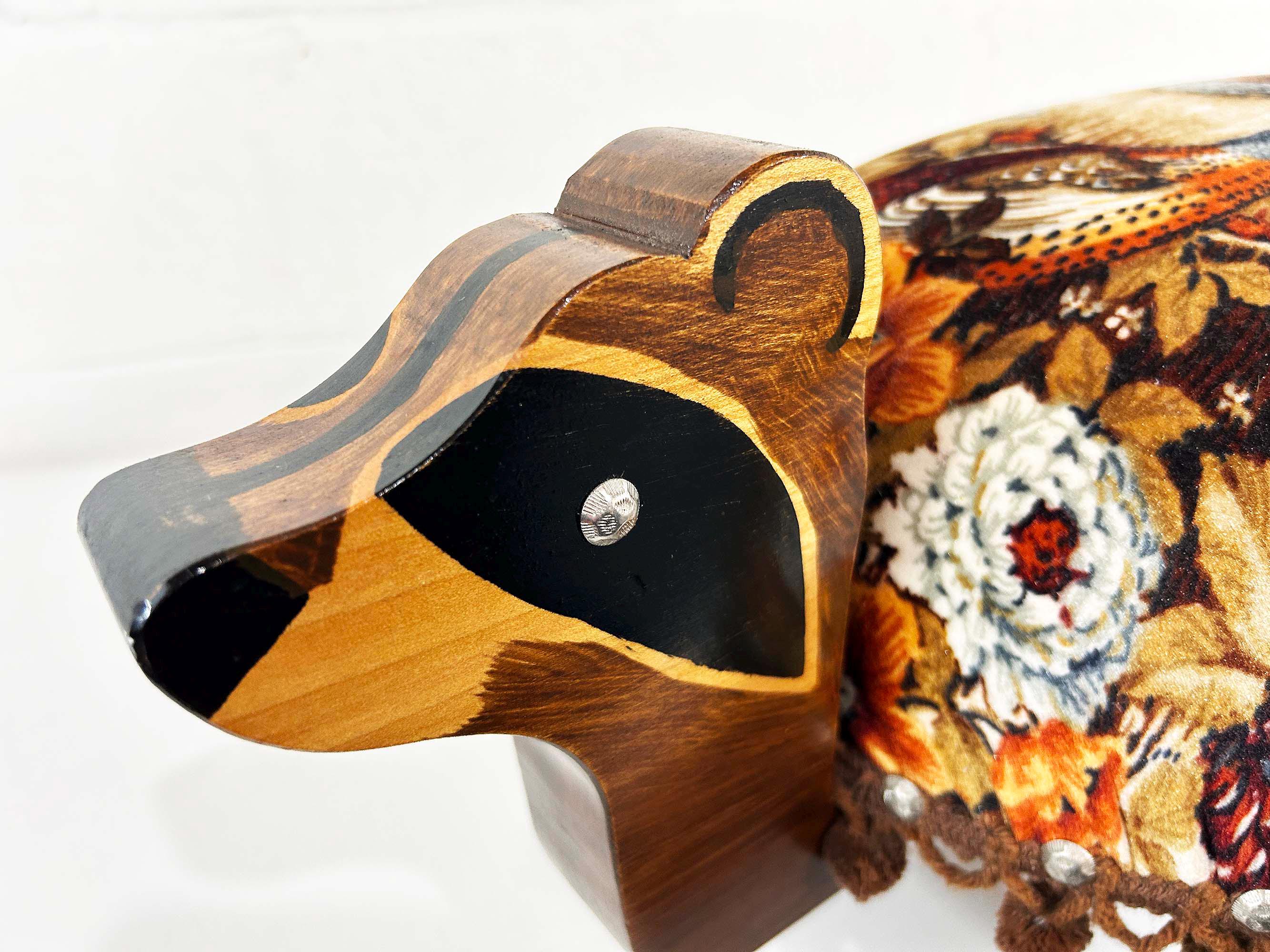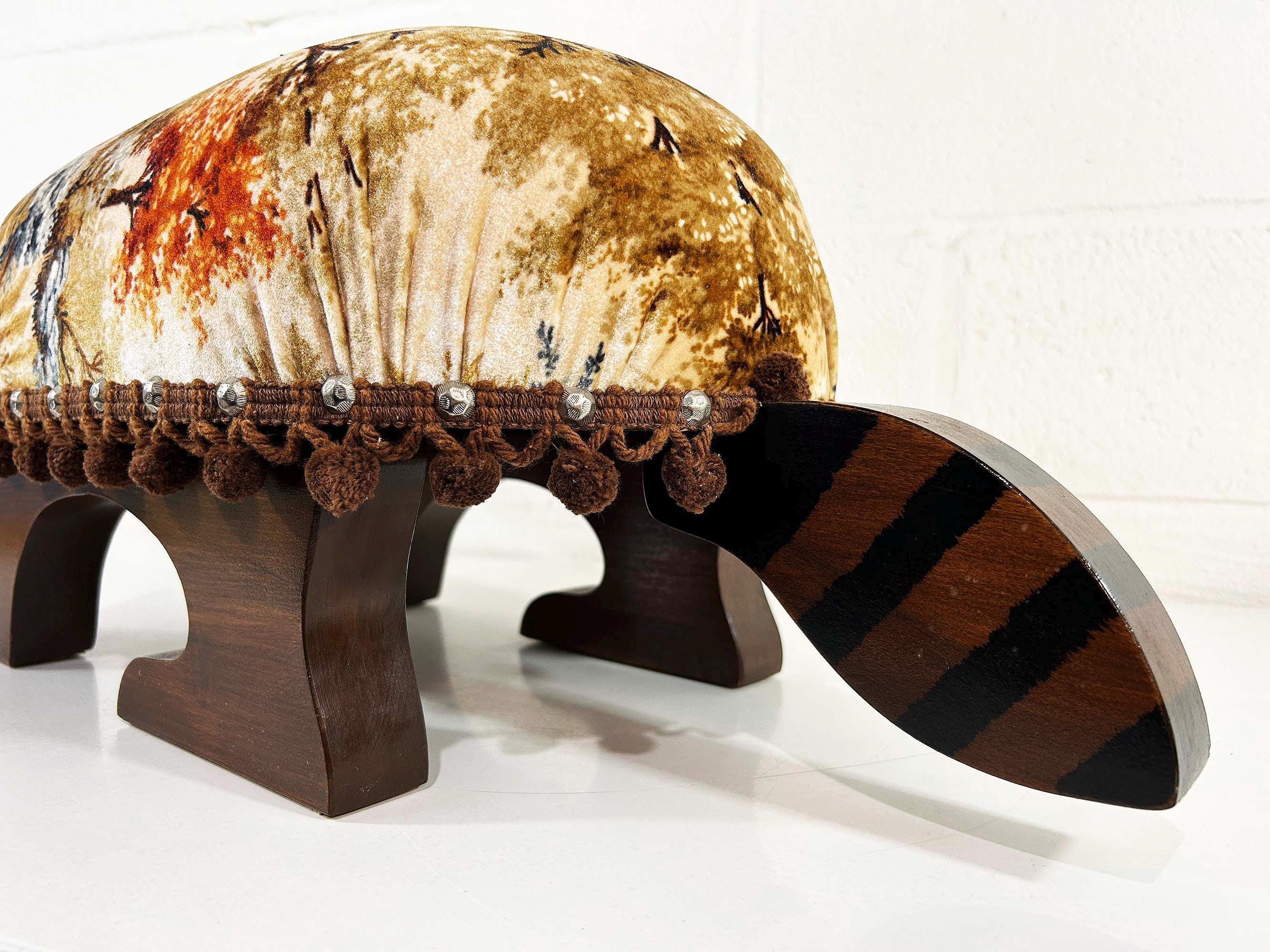 The cutest little raccoon footstool from the 1970s! I believe this is handmade but it was done so well! It feels sturdy and solid. Cute velvet fabric with little pom pom trim. It is in excellent vintage condition with no significant flaws The stool is approximately 10 1/2 inches tall, 26 inches wide, and 9 1/2 inches deep.