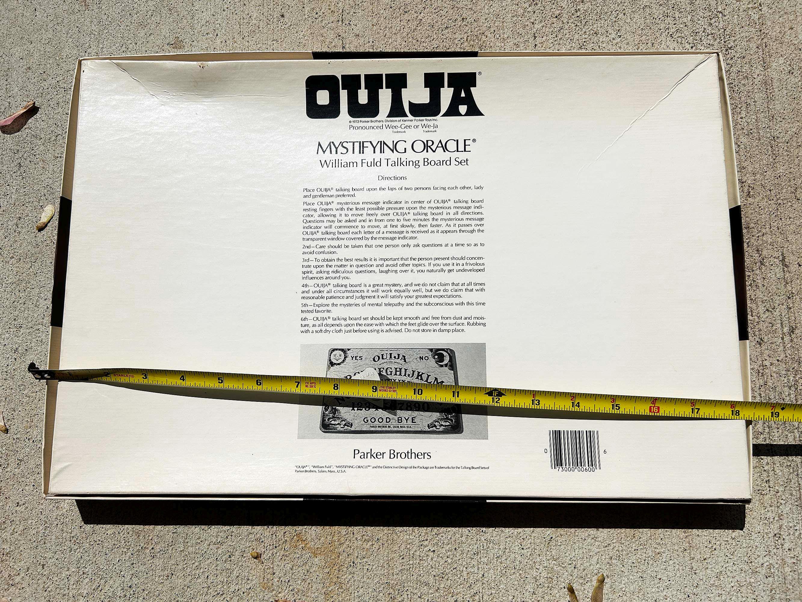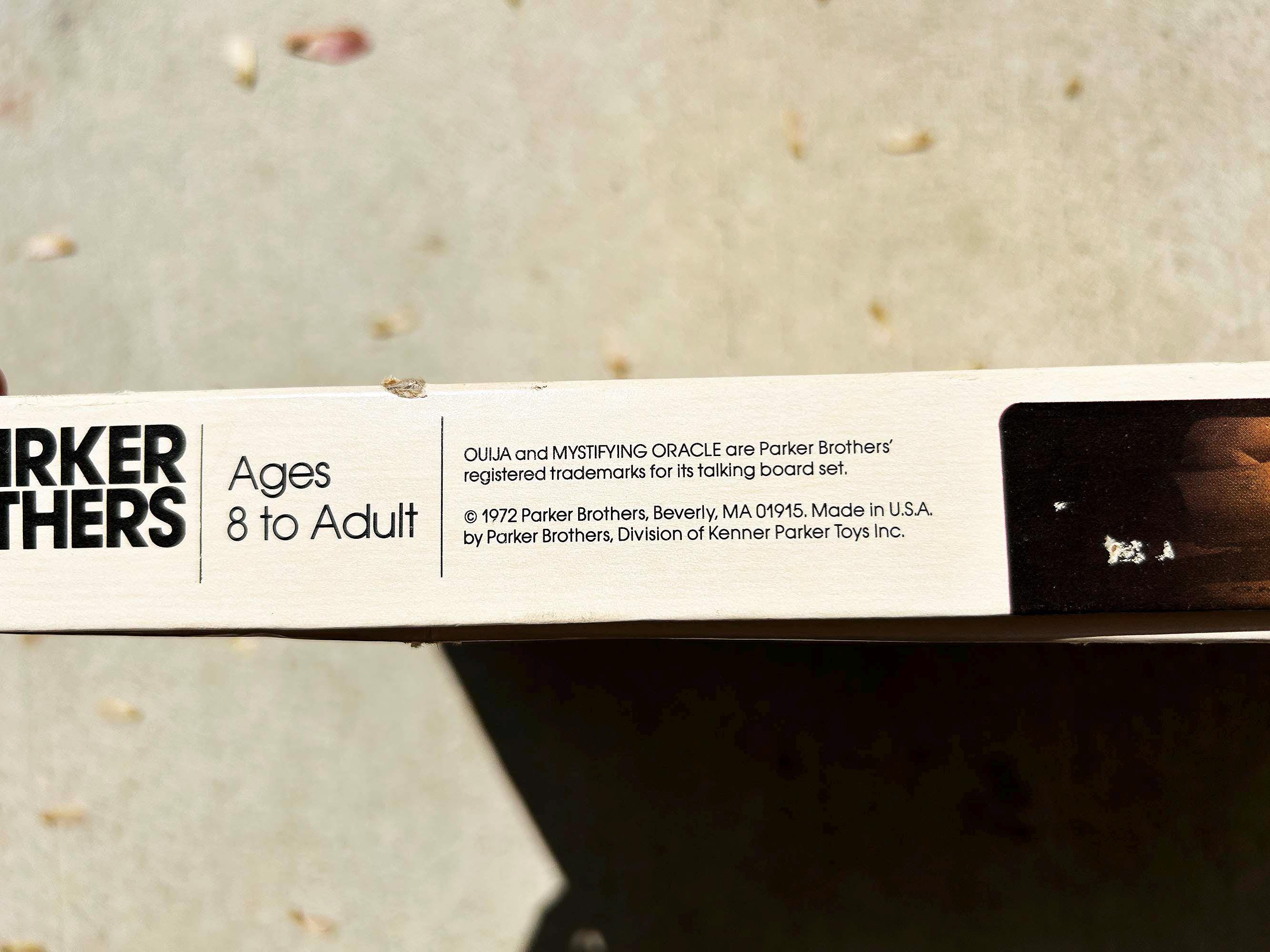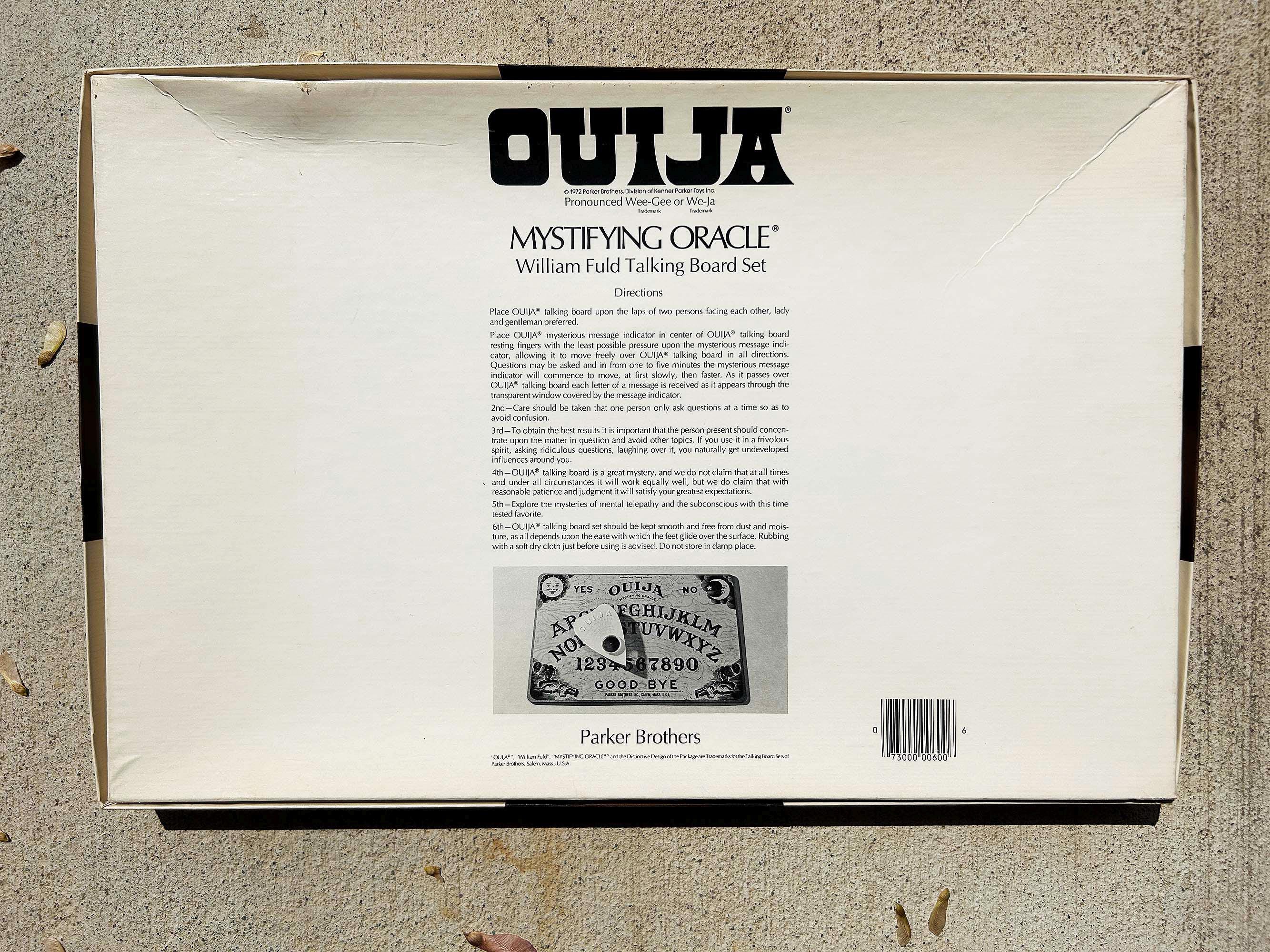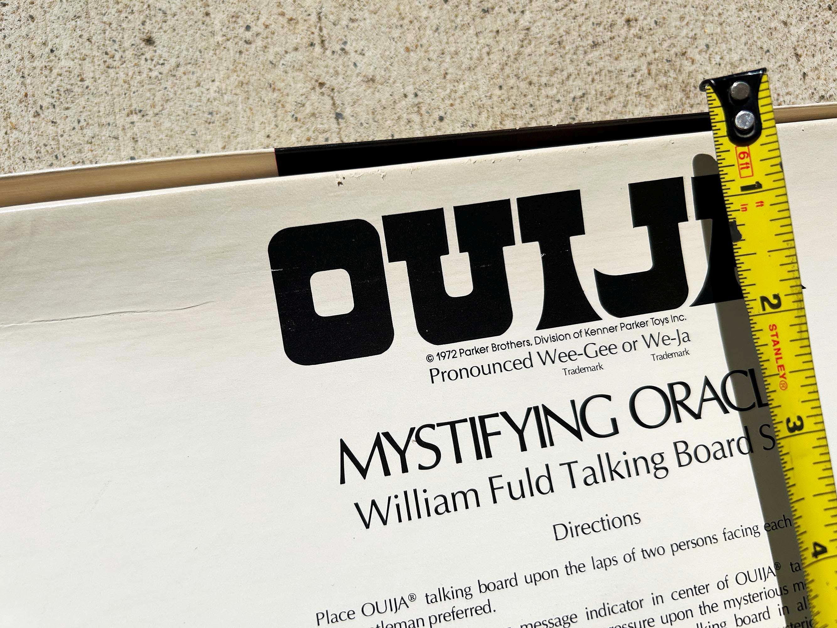 Super neat Ouija board game from the 1970s! Comes with it's original box and plastic planchette. Really cool retro graphics on the box and board! The box shows some allover wear, but it's in good vintage condition for it's age.