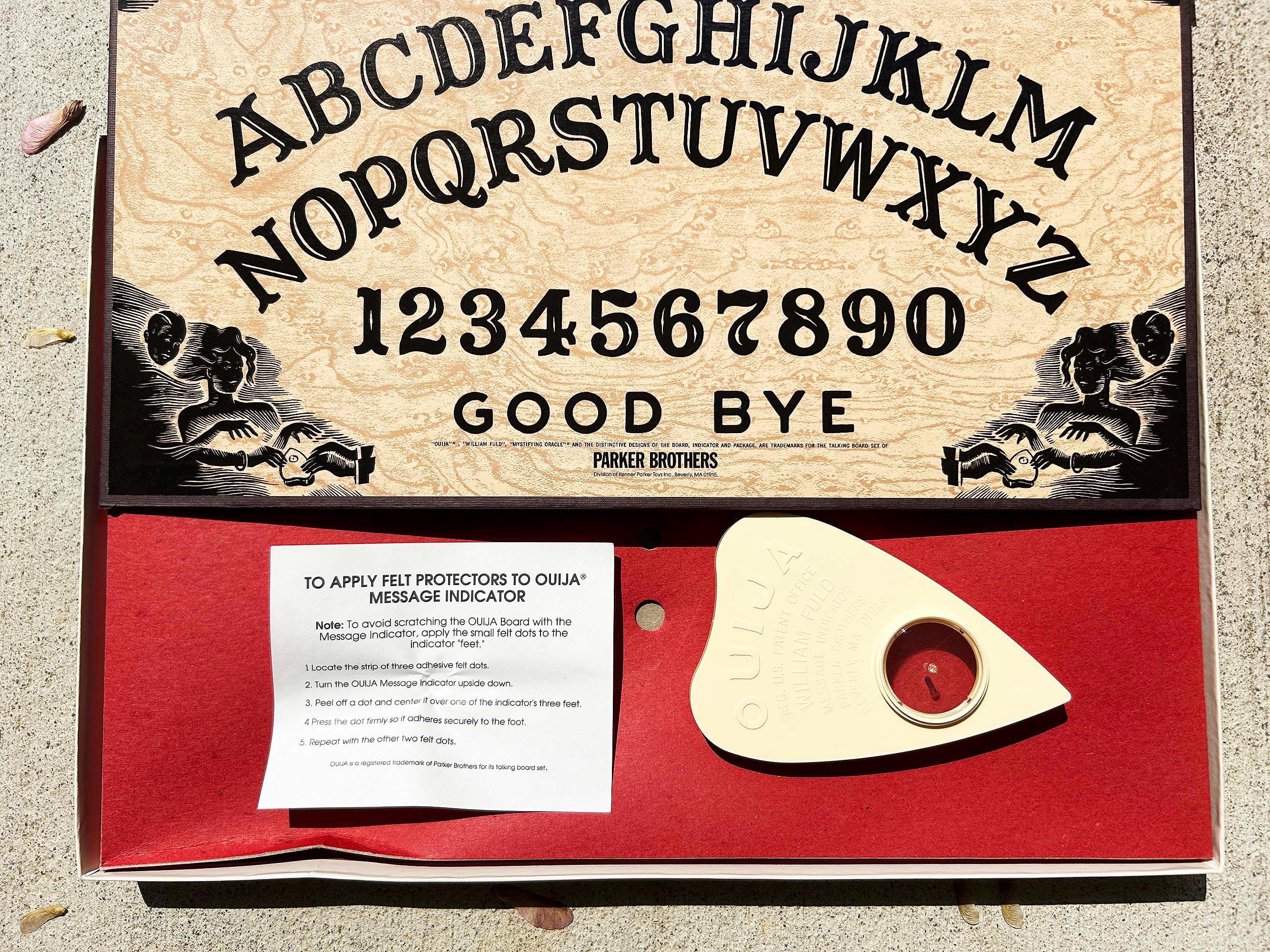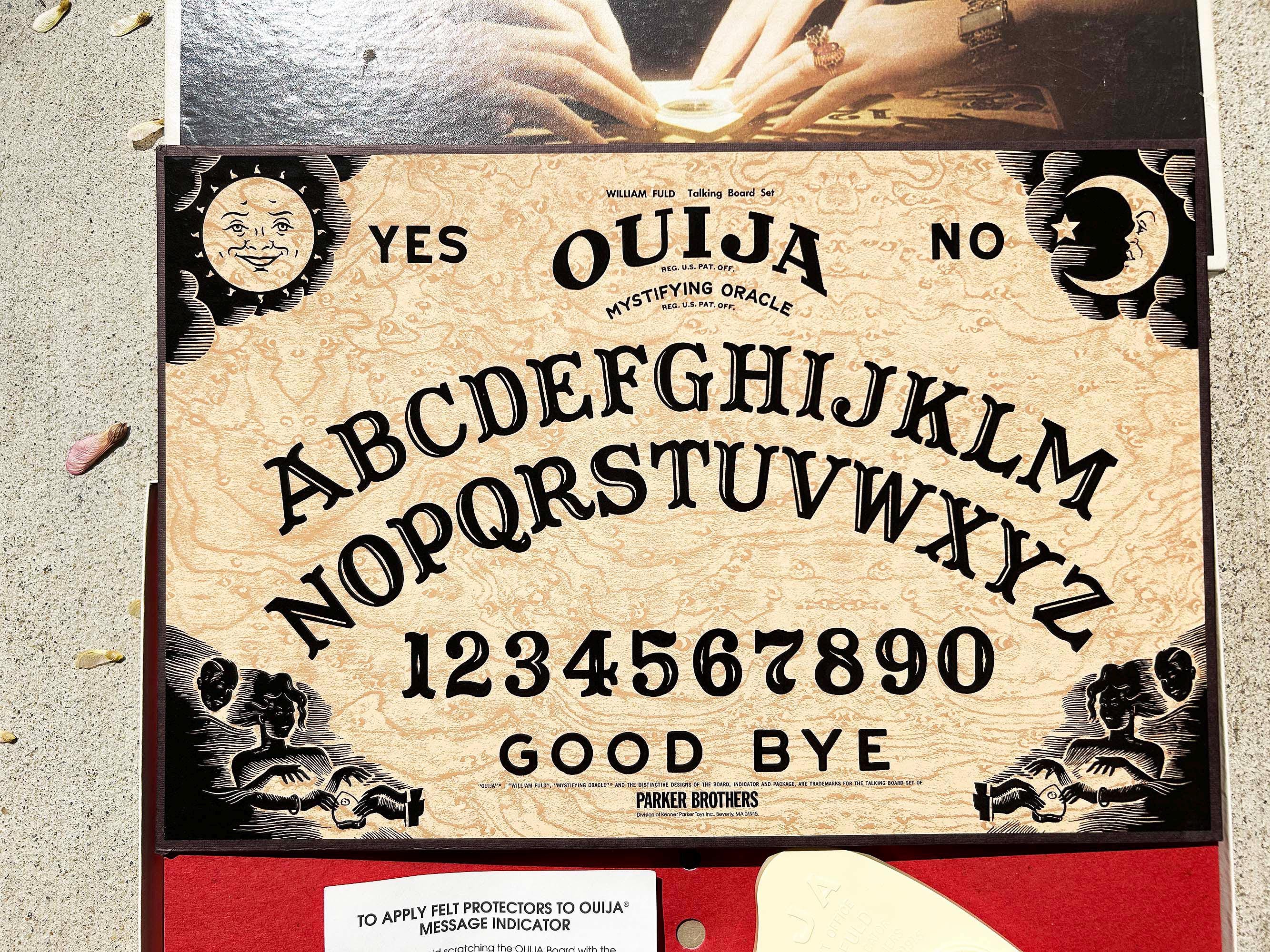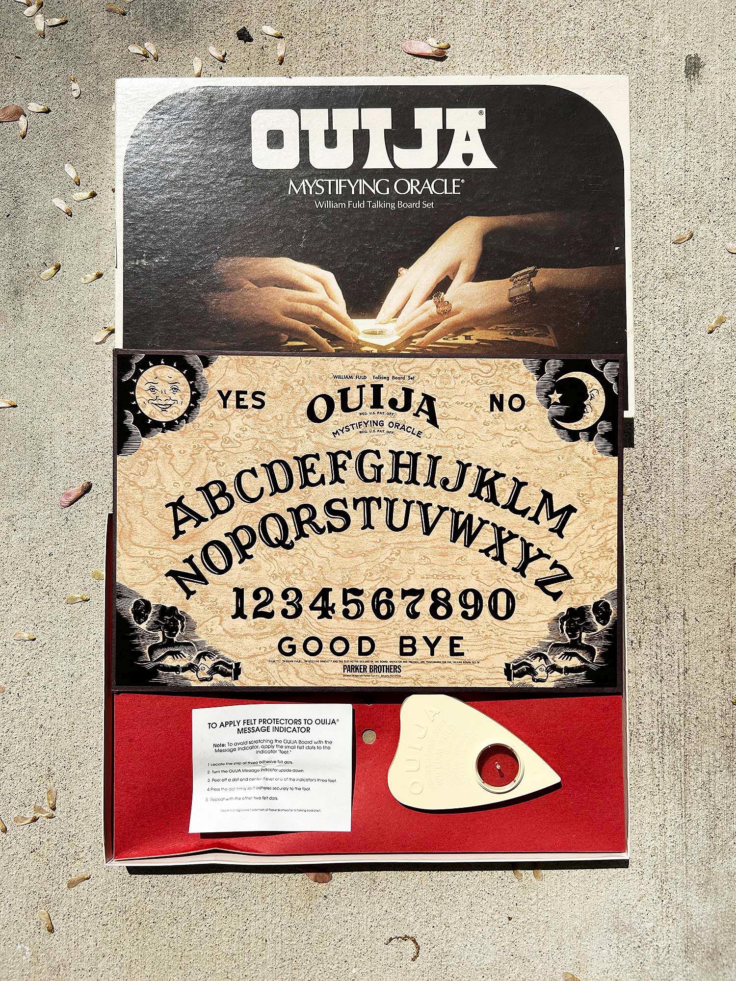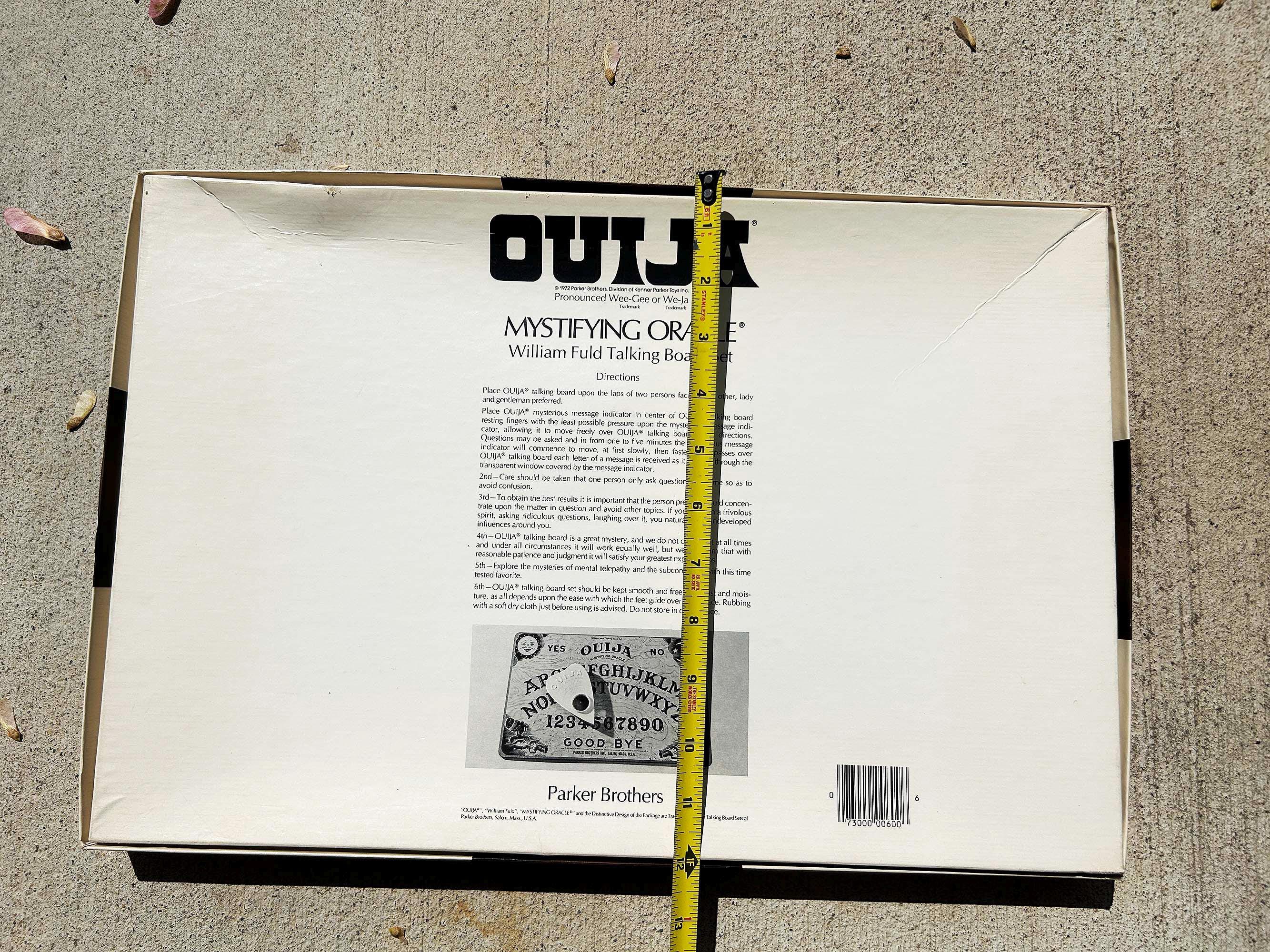 Super neat Ouija board game from the 1970s! Comes with it's original box and plastic planchette. Really cool retro graphics on the box and board! The box shows some allover wear, but it's in good vintage condition for it's age.
